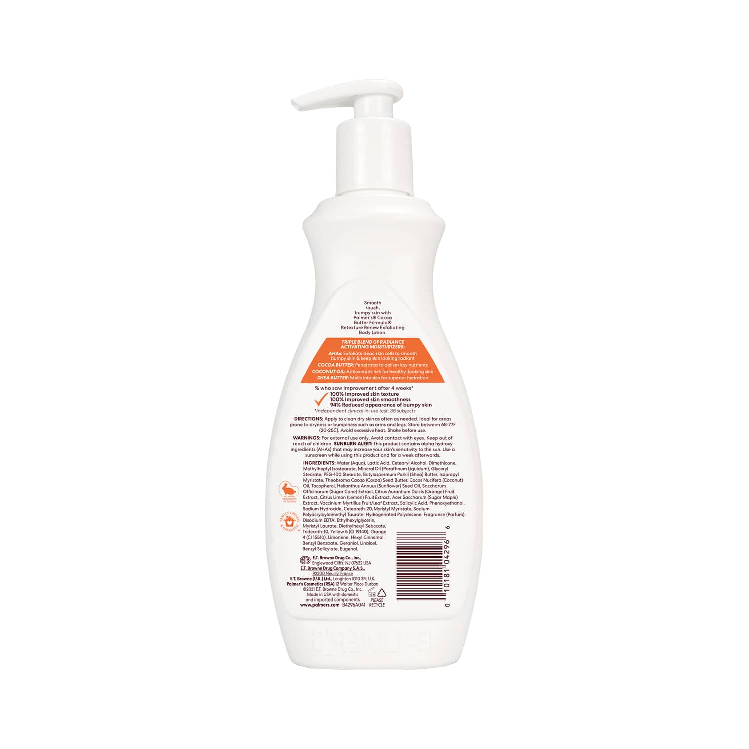 Achieve lovely skin with the Palmer's Cocoa Butter Retexture Renew Exfoliating Body Lotion (400ml). This conditioning body lotion is infused with AHAs, lactic acid, cocoa butter, coconut oil, shea butter, and vitamin E to soften rough, bumpy skin. Also, it is vegan and free from harmful chemicals to ensure risk-free use.Key Features & Benefits:Infused with AHAs, lactic acid, cocoa butter, vitamin E, coconut oil, and shea butter to nourish the skinConditioning formula locks in moisture content for 48 hoursPenetrates easily into the skin and softens rough, dry skinVegan and free from parabens and phthalates to ensure safe useKey Ingredients:AHAs, lactic acid, cocoa butter, coconut oil, shea butter, and vitamin E: Nourish the skinAll Ingredients:Water, Lactic Acid, Cetearyl Alcohol, Dimethicone, Methylheptyl Isostearate, Mineral Oil (Paraffinum Liquidum), Glyceryl Stearate, Peg-100 Stearate, Butyrospermum Parkii (Shea) Butter, Isopropyl Myristate, Theobroma Cacao (Cocoa) Seed Butter, Cocos Nucifera (Coconut) Oil, Tocopheryl, Helianthus Annuus (Sunflower) Seed Oil, Saccharum Officinarum (Sugar Cane) Extract, Citrus Aurantium Dulcis (Orange) Fruit Extract, Citrus Limon (Lemon) Fruit Extract, Acer Saccharum (Sugar Maple) Extract, Vaccinium Myrtillus Fruit/Leaf Extract, Salicylic Acid, Phenoxyethanol, Sodium Hydroxide, Ceteareth-20, Myristyl Myristate, Sodium Polyacryloyldimethyl Taurate, Hydrogenated Polydecene, Fragrance, Disodium Edta, Ethylhexylglycerin, Myristyl Laurate, Diethylhexyl Sebacate, Trideceth-10, Yellow 5 (Ci 19140), Orange 4 (Ci 15510), Limonene, Hexyl Cinnamal, Benzyl Benzoate, Geraniol, Linalool, Benzyl Salicylate, Eugenol.How to Use:After bathing, apply the body lotion all over the body and massage it into your skin using slow, circular movements.About the Brand:Founded over 175 years ago, Palmer's is one of the first skincare brands introduced in America and was formed by E.T. Browne Drug Co. Inc.- a company that provides treatment-oriented beauty products. Palmer's curates skin and hair care solutions with high-quality, natural ingredients and effective formulas and makes them available at an affordable price. The brand has formed a formidable reputation in over 100 countries worldwide and has become the leading cocoa butter brand in the US. Palmer's delivers high-performing products so customers can feel good about what they put on their hair and skin.Check out more Palmer's Body Lotions & Moisturisers options here, or browse through tokocart's full range of Body Lotions & Moisturisers from top global brands.You can also explore other products from the world of Palmer's here on tokocart.