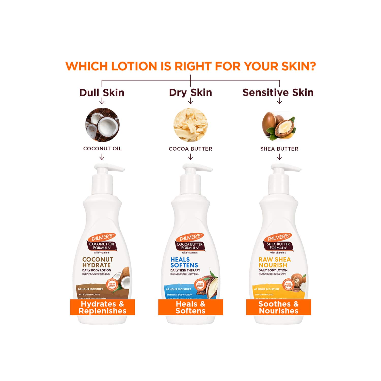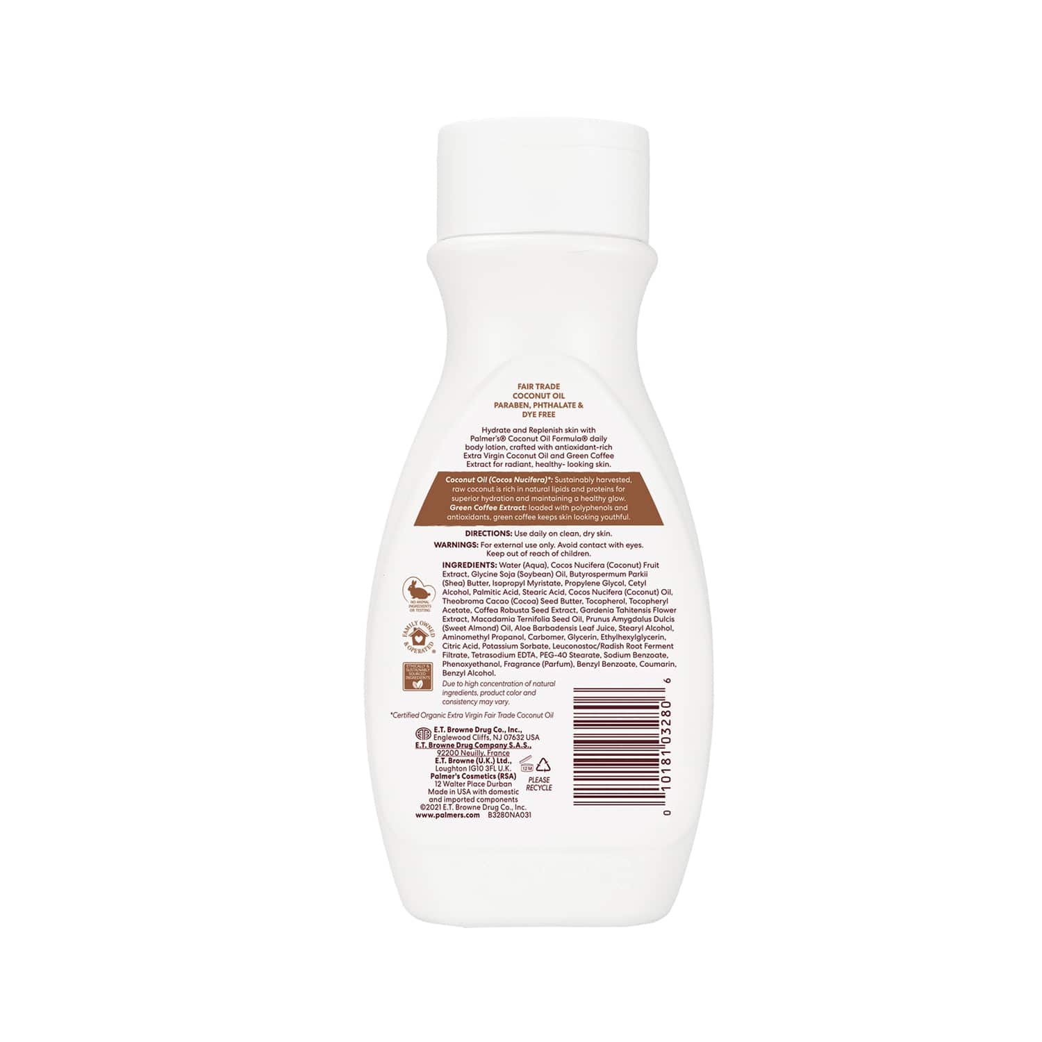 Get superior skin nourishment and care with the Palmer's Coconut Oil Body Lotion (250ml). This intensely moisturizing lotion is enriched with antioxidant-rich natural coconut oil and green coffee for healthy, radiant, and supple skin for up to 48 hours. In addition, this healing body lotion for dry skin contains ethically-sourced, vegan ingredients for reliable use.Key Features & Benefits:Contains antioxidant-rich natural coconut oil and green coffee for healthy, radiant skinHydrates and replenishes skin for up to 48 hours of supplenessMade with ethically and sustainably sourced ingredients for reliable useDermatologically tested, vegan, cruelty-free, and free from parabens, dyes, and phthalates for safe useKey Ingredients:Extra virgin coconut oil: Moisturizes skinGreen coffee extract: Promotes youthful skinVitamin E: Improves skin barrier protection and healingHow to Use:Apply the lotion generously all over your body multiple times a day as required. Massage it in until fully absorbed.All Ingredients:Water, Cocos Nucifera (Coconut) Fruit Extract, Glycine Soja (Soybean) Oil, Butyrospermum Parkii (Shea) Butter, Stearic Acid, Isopropyl Myristate, Propylene Glycol, Cetyl Alcohol, Cocos Nucifera (Coconut) Oil, Theobroma Cacao (Cocoa) Seed Butter, Tocopheryl Ac. Etate, Gardenia Tahitensis Flower Extract, Macadamia Ternifolia Seed Oil, Prunus Amygdalus Dulcis (Sweet Almond) Oil, Aloe Barbadensis Leaf Juice, Nonfat Dry Milk (Sine Adipe Lac), Triethanolamine, Phenoxyethanol, Ethylhexylglycerin, Carbomer, Glycerin, Peg-Glycerate, Carbomer, 40, Pentylene Glycol, Taterate. Edta, Decylene Glycol, 4-Hexanediol, Fragrance, Benzyl Alcohol, Benzyl Benzoate, Coumarin.About the Brand:Founded over 175 years ago, Palmer's is one of the first skincare brands introduced in America and was formed by E.T. Browne Drug Co. Inc.- a company that provides treatment-oriented beauty products. Palmer's curates skin and hair care solutions with high-quality, natural ingredients and effective formulas and makes them available at an affordable price. The brand has formed a formidable reputation in over 100 countries worldwide and has become the leading cocoa butter brand in the US. Palmer's delivers high-performing products so customers can feel good about what they put on their hair and skin.Check out more Palmer's Body Lotions & Moisturisers options here, or browse through tokocart's full range of Body Lotions & Moisturisers from top global brands.You can also explore other products from the world of Palmer's here on tokocart.