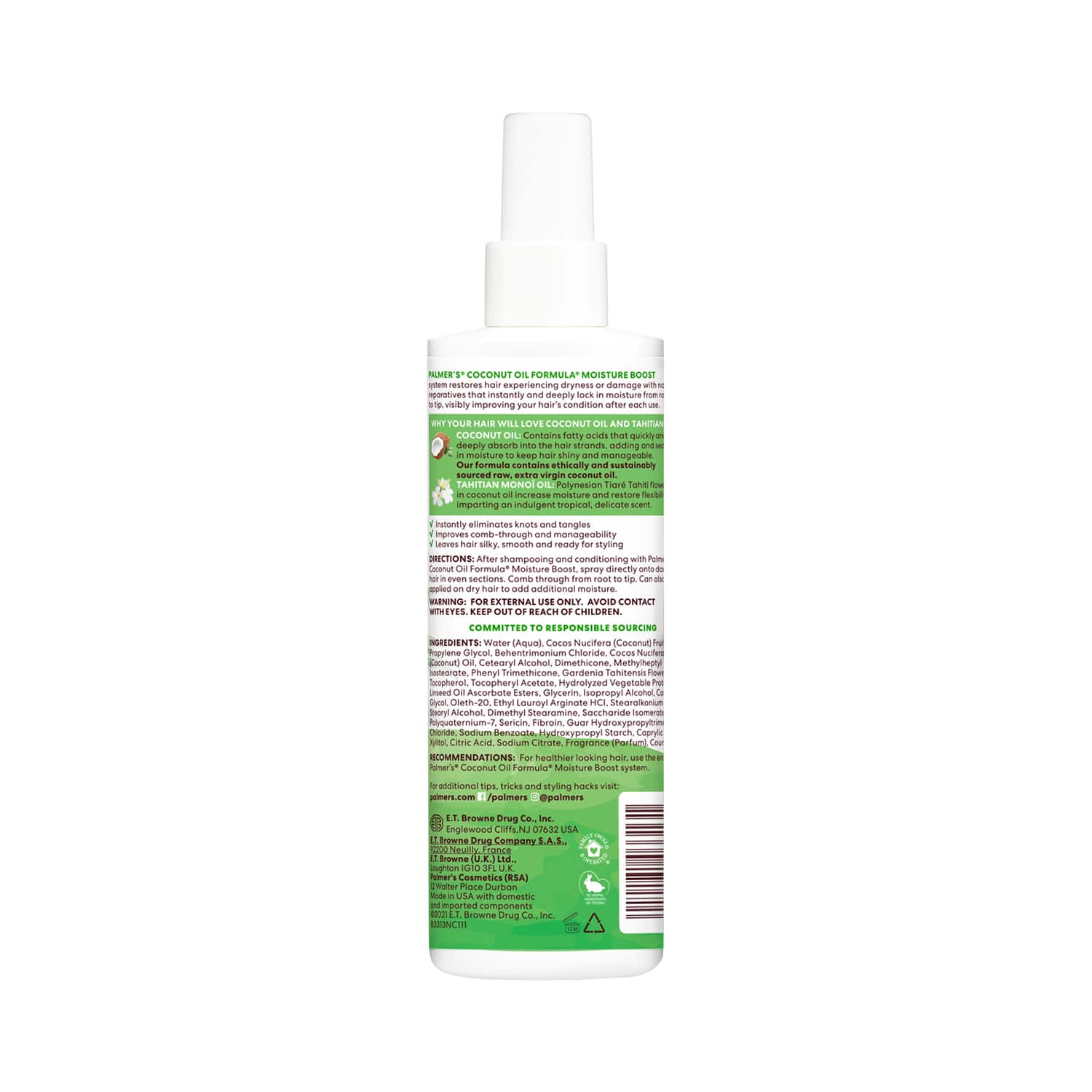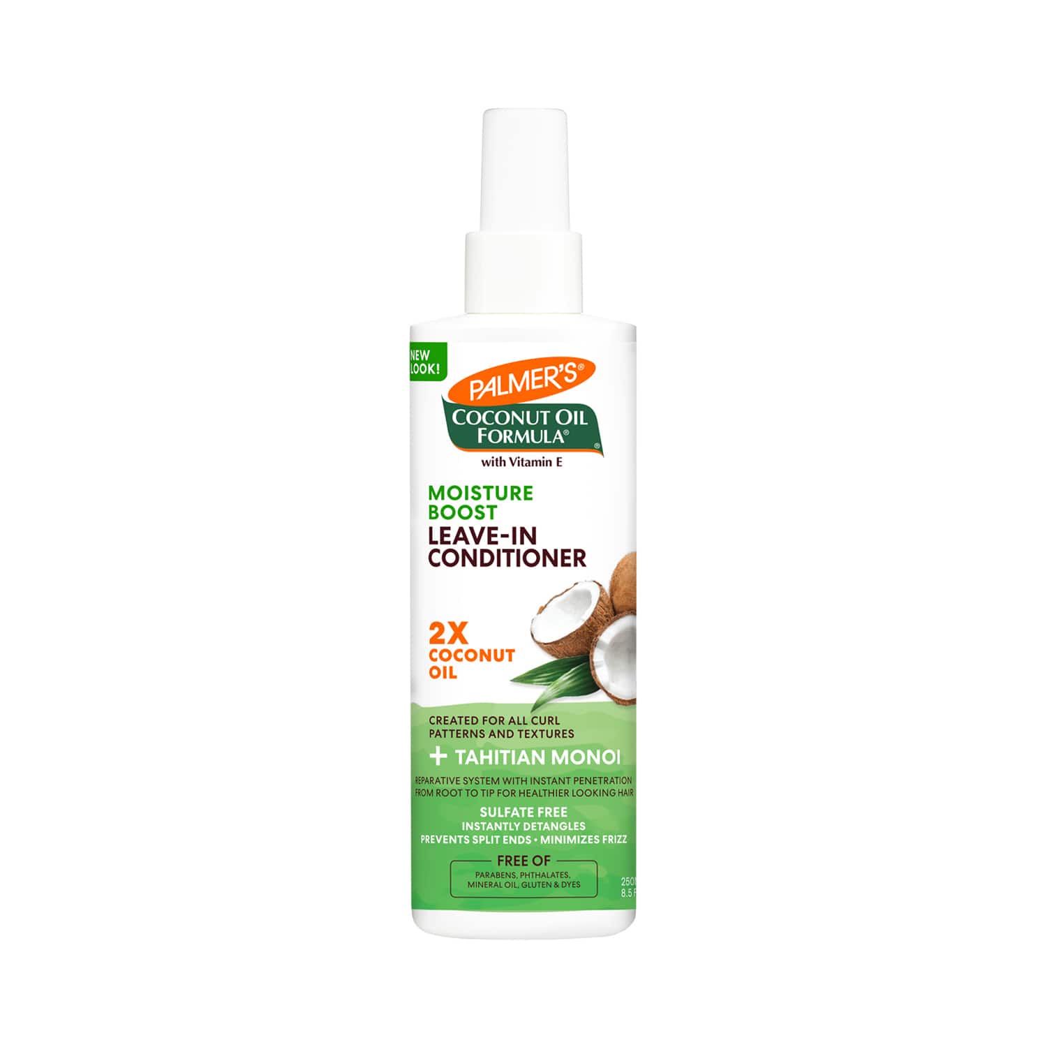 Get beautiful, healthy hair with the Palmer's Coconut Oil Leave-In Conditioner (250ml). This conditioner detangles hair instantly, eliminating the need to tug and pull at knotty, unruly hair. With just a few sprays, your hair will have instant slip and silkiness, making comb-through and styling easier. Raw coconut oil, tahitian monoi, aloe vera, panthenol, and silk proteins fortify hair, control frizz, reduce split ends, and provide a healthy-looking shine.Key Features & Benefits:Palmer's coconut oil leave-in conditioner replenishes moisture and shineCoconut oil leave-in conditioner offers a rich and creamy coconut fragranceLeave-in conditioner reduces split ends and makes hair shinyParaben-free leave-in conditioner ensures safe useKey Ingredients:Coconut oil: Strengthens and adds shineMonoi Oil: Nourishes and moisturizes the hairSilk amino acid: Smoothens and detangles frizzAll Ingredients:Water (Aqua), Cocos Nucifera (Coconut) Fruit Extract, Propylene Glycol, Behentrimonium Chloride, Cetearyl Alcohol, Cocos Nucifera (Coconut) Oil, Dimethicone, Phenyl Trimethicone, Gardenia Tahitensis Flower Extract, Tocopheryl Acetate, Tocopherol, Hydrolyzed Keratin, Silk Amino Acids, Aloe Barbadensis Leaf Juice, Panthenol, Cyclopentasiloxane, Ethylhexylglycerin, Leuconostoc/Radish Root Ferment Filtrate, Stearalkonium Chloride, Cyclohexasiloxane, Phenoxyethanol, Oleth-20, Stearyl Alcohol, Dimethyl Stearamine, Isopropyl Alcohol, Fragrance (Parfum), Coumarin.How to Use:Apply Conditioner to towel-dried or damp hair. Comb through to the ends of the hair to coat it with conditioning proteins. Style as desired without rinsing. Can be used as needed throughout the day. Use with Palmer's Coconut Oil Formula daily maintenance and styling products for best results.About the Brand:Founded over 175 years ago, Palmer's is one of the first skincare brands introduced in America and was formed by E.T. Browne Drug Co. Inc.- a company that provides treatment-oriented beauty products. Palmer's curates skin and hair care solutions with high-quality, natural ingredients and effective formulas and makes them available at an affordable price. The brand has formed a formidable reputation in over 100 countries worldwide and has become the leading cocoa butter brand in the US. Palmer's delivers high-performing products so customers can feel good about what they put on their hair and skin.Check out more Palmer's Conditioner options here, or browse through tokocart's full range of Conditioner from top global brands.You can also explore other products from the world of Palmer's here on tokocart.