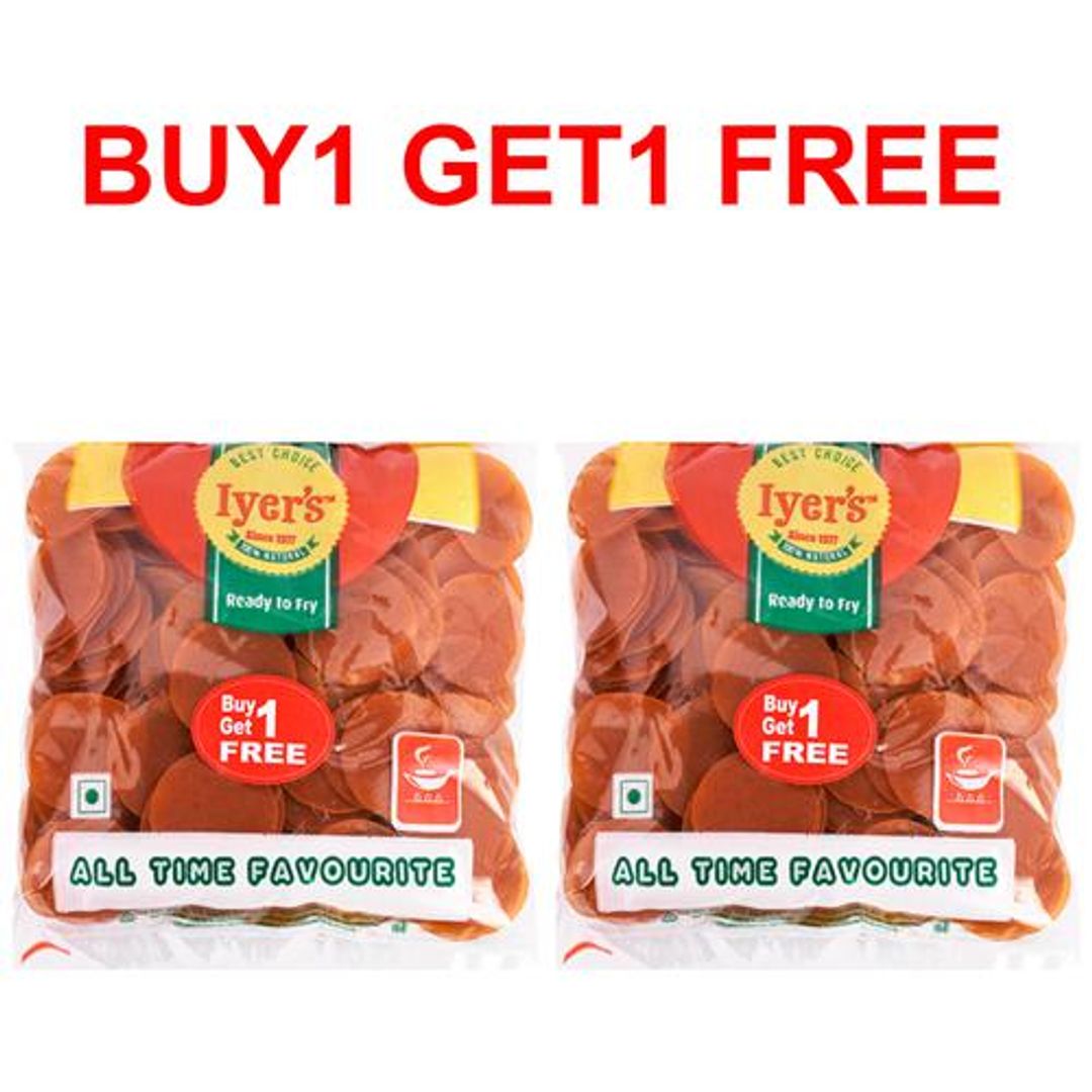 The Iyers chilly Mangalore papad is made of flour which is blended with roasted and dried chilli flakes. These chilli flakes are made from the best, hand-picked red chillies found in South India. The papads also contain rice which has been ground to a fine paste, jeera or cumin, salt, hing, papad Khar and various other spices.