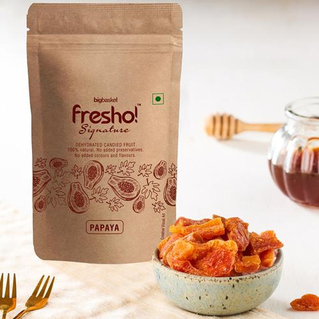 Fresho Signature presents an array of dry fruits apart from the ordinary to give you the best of the best to indulge. Want to try something other than a regular fruit? This sweetened and spiced amla dry fruit is a healthy alternative to munch on when hunger strikes. It contains amla fruit, sulphurless sugar, cumin seed, black pepper, black salt, citric acid, cinnamon, asafoetida and ginger powder. Easy to carry, it makes a great snack to keep you going throughout the day. Our spicy candied dry fruit is here to be your snack buddy and your healthy sugar high. They are sweetened with sulphurless sugar and liquid glucose and spiced to enhance the zing. There are 0 added preservatives, artificial colour and flavour to retain the original fruit essence and keep it natural and healthy.
