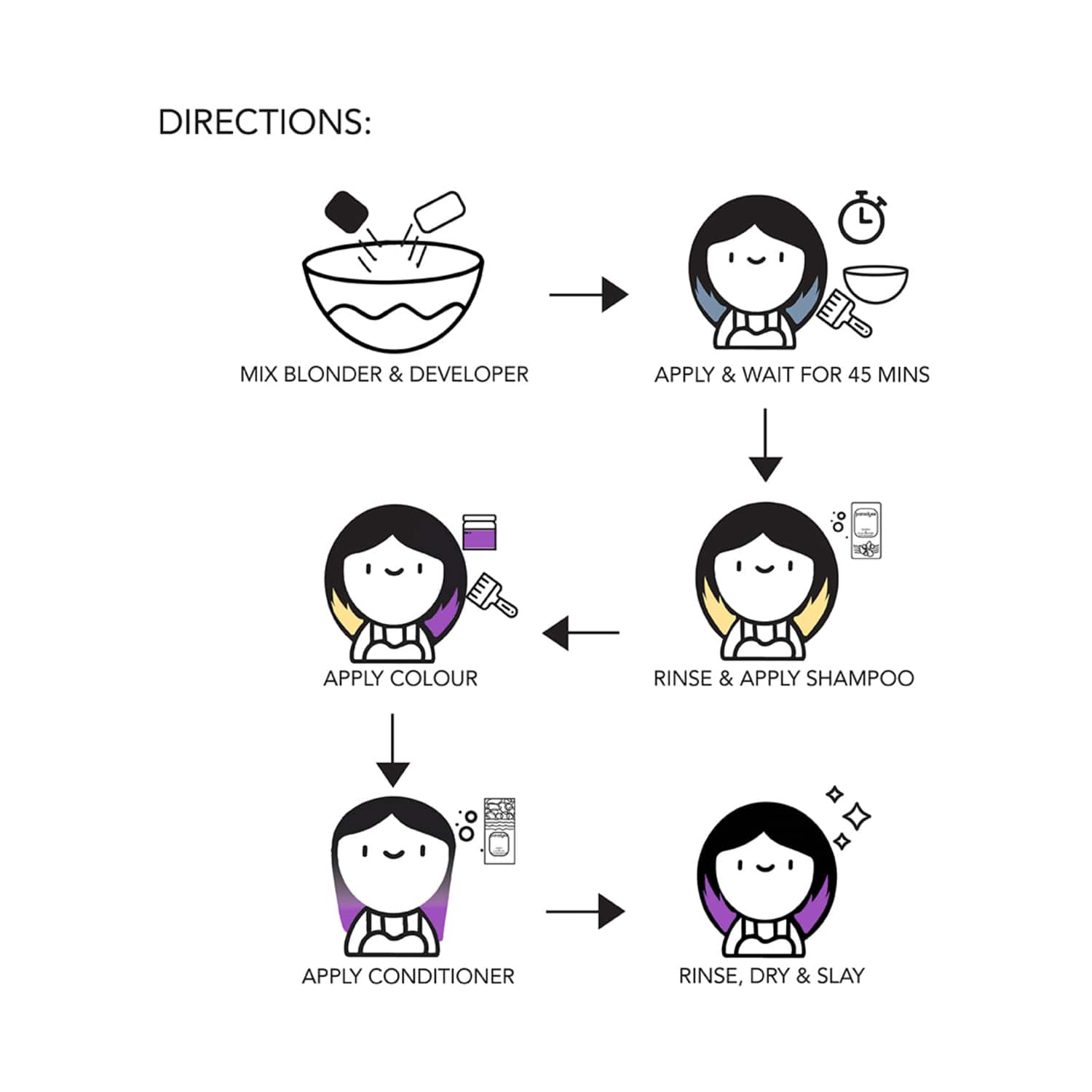 Slay the latest hair trends with the Paradyes Hair Highlighting Kit - Comrii Purple (100g). This hair bleach and color kit lets you pre-lighten, color, and care for your colored locks. Also, this at-home hair highlighting set bleaches the hair and lifts it up to 4-6 levels. Plus, the shampoo and conditioner in this Paradyes highlighting kit cleanse and nourish the hair to ensure the color lasts longer.Key Features & Benefits:All-in-one bleach and color kit pre-lightens, colors, and takes care of colored hairHair bleach lifts the hair color up to 4 to 6 levelsSemi-permanent hair color lasts for up to 8 to 10 washesVegan and cruelty-free formula does not contain harmful ammonia, peroxide, parabens, or sulfates for safe use on all hair typesKey Ingredients:Aloe vera, brahmi, bhringraj, almond oil, amla, and hibiscus: Nourish the hairAll Ingredients:Color: Aqua, Propylene Glycol, Cetearyl Alcohol, Steareth 2, Glyceryl Stearate (And) Peg 100 Stearate, Prunus Amygdalus Dulcis (Almond) Oil, Parfum, Phenoxyethanol (And) Ethylhexylglycerin, Basic Violet-15, Hc Blue-16, Citric Acid, Disodium Edta, Emblica Officinalis Fruit Extract, Eclipta Alba Leaf Extract, Aloe Barbadensis Leaf Extract, Bacopa Monnieri Extract, Hibiscus Sabdariffa Flower Extract Shampoo: Aqua, Sodium Lauroyl Sarcosinate, Sodium Methyl Cocoyl Taurate, Coco Glucoside, Decyl Glucoside, Cocamidopropyl Betaine, Glycerin, Peg 160 Sorbitan Triisostearate, Pyrrolidone Carboxylate, Polyethylene Glycol 150 Distearate, Behentremonium Chloride, Olive Oil Peg 7 Ester, Phenoxyethanol & Ethylhexylglycerin, Parfum, Cocomonoethanolamide, Hydrolyzed Flax Protein, Hydrolyzed Quinoa, Citric Acid, Polyquaternium-10, Disodium Edta, Aloe Barbadensis Leaf Extract, Emblica Officinalis Extract, Hibiscus Rosa-Sinensis Flower Extract Conditioner: Aqua, Glycerin, Cetostearyl Alcohol, Cetrimonium Chloride, Caprylic Capric Triglyceride, Glyceryl Stearate (And) Peg 100 Stearate, Behentrimonium Chloride, Acrylamidopropyltrimonium Chloride/Acrylamide, Parfum, Phenoxyethanol (And) Ethylhexylglycerin, Guar Hydroxypropyltrimonium Chloride, Disodium Edta, Panthenol, Citric Acid, Hydrolyzed Flax Protein, Hydrolyzed Quinoa, Aloe Barbadensis Leaf Extract, Emblica Officinalis Fruit Extract, Hibiscus Rosa-Sinensis Flower Extract Blonder Powder: Potassium Persulfate, Ammonium Persulphate, Silica Gel, Sodium Silicate, Magnesium Carbonate Hydroxide, Sodium Stearate, Fumed Silica, Xanthan Gum, Starch, D&C Approved Ultramarine Blue Color Developer: Dm-Water, Hydrogen Peroxide, Peg 100 Stearate Se & Glyceryl Stearate, Cetostearyl Alcohol, Light Liquid Paraffin, Propylene Glycol, Orthophosphoric Acid, Sodium Stannate, Disodium Edta, Prunus Dulcis (Almond) Oil, Linum Usitatissimum (Flaxseed) Oil, Olea Europaea (Olive) OilHow to Use:To bleach your hair, wash and dry it thoroughly. Keep a mirror, towel, water, aluminum foil, and some cotton balls handy in a well-ventilated area. Apply oil or petroleum jelly around the hairline, face, and neck to avoid the product from getting onto the skin. Ensure you or anyone handling the product wears the protective gloves provided throughout the process. Mix the bleach in any bowl except a metal bowl. Mix the blonder powder and developer in a 1:2 ratio, ensuring the mixture is smooth and has no lumps. Once the strand test comes out safe, apply the product evenly onto the hair sections. First, apply on the mid-lengths and ends and later on the root area. Cover the sections with foil after using the product and let it rest for the required amount of time, as determined by the strand test. Once you achieve the desired hair level, rinse thoroughly and dry your hair. Proceed with the color application by sectioning your pre-lightened dry hair. Apply the color to the desired sections. Let the color sit for 30 to 60 minutes, then wash your hair. After washing out the color, condition, and style your hair as usual.About the Brand:Launched in 2021 by Yushika Jolly, Paradyes is India's first semi-permanent hair color brand. The brand develops ammonia-free hair colors that allow its consumers to express themselves confidently. They believe that just because Indian hair comes in darker shades, it doesn't have to be sidelined and offers dyes that deposit even on dark hair. All of their products are free from ammonia, parabens, and PPD. They strive to reinvent themselves in the hair-cosmetic industry and continuously add to their spectrum of colors. Paradyes offers semi-permanent hair color, one-wash hair color, DIY bleaching and coloring kits, serums, hair oils, and more.Check out more Paradyes Hair Colour options here, or browse through tokocart's full range of Hair Colour from top global brands.You can also explore other products from the world of Paradyes here on tokocart.