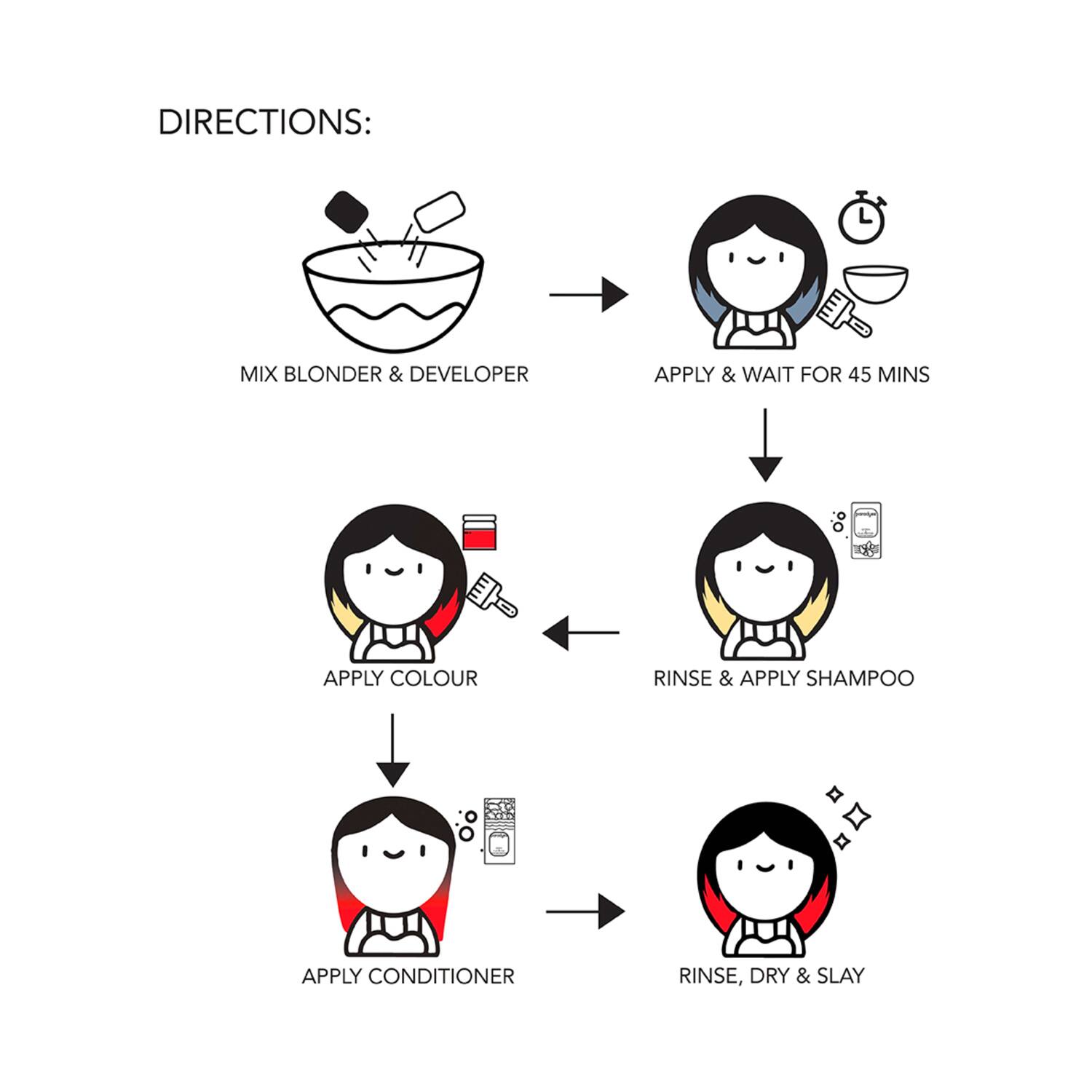 Be a trendsetter with the Paradyes Hair Highlighting Kit - Rubra Red (100g). This hair bleach and color kit lets you pre-lighten, color, and care for your colored locks. Also, this at-home hair highlighting set bleaches the hair and lifts it up to 4-6 levels. Plus, the shampoo and conditioner in this Paradyes highlighting kit cleanse and nourish the hair to ensure the color lasts longer.Key Features & Benefits:All-in-one bleach and color kit pre-lightens, colors, and takes care of colored hairHair bleach lifts the hair color up to 4 to 6 levelsSemi-permanent hair color lasts for up to 8 to 10 washesVegan and cruelty-free formula does not contain harmful ammonia, peroxide, parabens, or sulfates for safe use on all hair typesKey Ingredients:Aloe vera, brahmi, bhringraj, almond oil, amla, and hibiscus: Nourish the hairAll Ingredients:Color: Aqua, Propylene Glycol, Cetearyl Alcohol, Steareth 2, Glyceryl Stearate (And) Peg 100 Stearate, Prunus Amygdalus Dulcis (Almond) Oil, Parfum, Phenoxyethanol (And) Ethylhexylglycerin, Basic Red-51, Basic Orange-31, Citric Acid, Disodium Edta, Emblica Officinalis Fruit Extract, Eclipta Alba Leaf Extract, Aloe Barbadensis Leaf Extract, Bacopa Monnieri Extract, Hibiscus Sabdariffa Flower Extract Shampoo: Aqua, Sodium Lauroyl Sarcosinate, Sodium Methyl Cocoyl Taurate, Coco Glucoside, Decyl Glucoside, Cocamidopropyl Betaine, Glycerin, Peg 160 Sorbitan Triisostearate, Pyrrolidone Carboxylate, Polyethylene Glycol 150 Distearate, Behentremonium Chloride, Olive Oil Peg 7 Ester, Phenoxyethanol & Ethylhexylglycerin, Parfum, Cocomonoethanolamide, Hydrolyzed Flax Protein, Hydrolyzed Quinoa, Citric Acid, Polyquaternium-10, Disodium Edta, Aloe Barbadensis Leaf Extract, Emblica Officinalis Extract, Hibiscus Rosa-Sinensis Flower Extract Conditioner: Aqua, Glycerin, Cetostearyl Alcohol, Cetrimonium Chloride, Caprylic Capric Triglyceride, Glyceryl Stearate (And) Peg 100 Stearate, Behentrimonium Chloride, Acrylamidopropyltrimonium Chloride/Acrylamide, Parfum, Phenoxyethanol (And) Ethylhexylglycerin, Guar Hydroxypropyltrimonium Chloride, Disodium Edta, Panthenol, Citric Acid, Hydrolyzed Flax Protein, Hydrolyzed Quinoa, Aloe Barbadensis Leaf Extract, Emblica Officinalis Fruit Extract, Hibiscus Rosa-Sinensis Flower Extract Blonder Powder: Potassium Persulfate, Ammonium Persulphate, Silica Gel, Sodium Silicate, Magnesium Carbonate Hydroxide, Sodium Stearate, Fumed Silica, Xanthan Gum, Starch, D&C Approved Ultramarine Blue Color Developer: Dm-Water, Hydrogen Peroxide, Peg 100 Stearate Se & Glyceryl Stearate, Cetostearyl Alcohol, Light Liquid Paraffin, Propylene Glycol, Orthophosphoric Acid, Sodium Stannate, Disodium Edta, Prunus Dulcis (Almond) Oil, Linum Usitatissimum (Flaxseed) Oil, Olea Europaea (Olive) OilHow to Use:To bleach your hair, wash and dry it thoroughly. Keep a mirror, towel, water, aluminum foil, and some cotton balls handy in a well-ventilated area. Apply oil or petroleum jelly around the hairline, face, and neck to avoid the product from getting onto the skin. Ensure you or anyone handling the product wears the protective gloves provided throughout the process. Mix the bleach in any bowl except a metal bowl. Mix the blonder powder and developer in a 1:2 ratio, ensuring the mixture is smooth and has no lumps. Once the strand test comes out safe, apply the product evenly onto the hair sections. First, apply on the mid-lengths and ends and later on the root area. Cover the sections with foil after using the product and let it rest for the required amount of time, as determined by the strand test. Once you achieve the desired hair level, rinse thoroughly and dry your hair. Proceed with the color application by sectioning your pre-lightened dry hair. Apply the color to the desired sections. Let the color sit for 30 to 60 minutes, then wash your hair. After washing out the color, condition, and style your hair as usual.About the Brand:Launched in 2021 by Yushika Jolly, Paradyes is India's first semi-permanent hair color brand. The brand develops ammonia-free hair colors that allow its consumers to express themselves confidently. They believe that just because Indian hair comes in darker shades, it doesn't have to be sidelined and offers dyes that deposit even on dark hair. All of their products are free from ammonia, parabens, and PPD. They strive to reinvent themselves in the hair-cosmetic industry and continuously add to their spectrum of colors. Paradyes offers semi-permanent hair color, one-wash hair color, DIY bleaching and coloring kits, serums, hair oils, and more.Check out more Paradyes Hair Colour options here, or browse through tokocart's full range of Hair Colour from top global brands.You can also explore other products from the world of Paradyes here on tokocart.