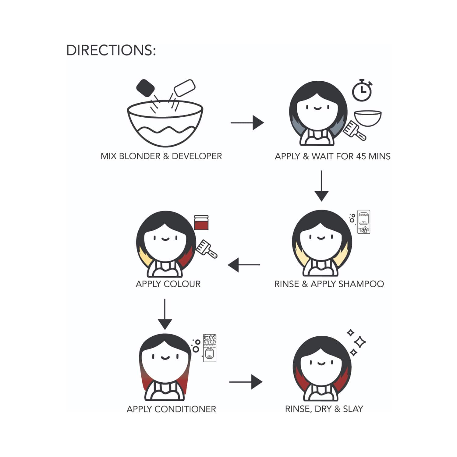 Add depth, dimension, and color to your hair with the Paradyes Hair Highlighting Kit - Ruby Wine (100g). This hair bleach and color kit lets you pre-lighten, color, and care for your colored locks. Also, this at-home hair highlighting set bleaches the hair and lifts it up to 4-6 levels. Plus, the shampoo and conditioner in this Paradyes highlighting kit cleanse and nourish the hair to ensure the color lasts longer.Key Features & Benefits:All-in-one bleach and color kit pre-lightens, colors, and takes care of colored hairHair bleach lifts the hair color up to 4 to 6 levelsSemi-permanent hair color lasts for up to 8 to 10 washesVegan and cruelty-free formula does not contain harmful ammonia, peroxide, parabens, or sulfates for safe use on all hair typesKey Ingredients:Aloe vera, brahmi, bhringraj, almond oil, amla, and hibiscus: Nourish the hairAll Ingredients:Color: Aqua, Propylene Glycol, Cetearyl Alcohol, Steareth 2, Glyceryl Stearate (And) Peg 100 Stearate, Prunus Amygdalus Dulcis (Almond) Oil, Parfum, Phenoxyethanol (And) Ethylhexylglycerin, Hc Blue 16, Basic Red 76, Basic Red 51, Basic Violet 2, Citric Acid, Disodium Edta, Emblica Officinalis Fruit Extract, Eclipta Alba Leaf Extract, Aloe Barbadensis Leaf Extract, Bacopa Monnieri Extract, Hibiscus Sabdariffa Flower Extract Shampoo: Aqua, Sodium Lauroyl Sarcosinate, Sodium Methyl Cocoyl Taurate, Coco Glucoside, Decyl Glucoside, Cocamidopropyl Betaine, Glycerin, Peg 160 Sorbitan Triisostearate, Pyrrolidone Carboxylate, Polyethylene Glycol 150 Distearate, Behentremonium Chloride, Olive Oil Peg 7 Ester, Phenoxyethanol & Ethylhexylglycerin, Parfum, Cocomonoethanolamide, Hydrolyzed Flax Protein, Hydrolyzed Quinoa, Citric Acid, Polyquaternium-10, Disodium Edta, Aloe Barbadensis Leaf Extract, Emblica Officinalis Extract, Hibiscus Rosa-Sinensis Flower Extract Conditioner: Aqua, Glycerin, Cetostearyl Alcohol, Cetrimonium Chloride, Caprylic Capric Triglyceride, Glyceryl Stearate (And) Peg 100 Stearate, Behentrimonium Chloride, Acrylamidopropyltrimonium Chloride/Acrylamide, Parfum, Phenoxyethanol (And) Ethylhexylglycerin, Guar Hydroxypropyltrimonium Chloride, Disodium Edta, Panthenol, Citric Acid, Hydrolyzed Flax Protein, Hydrolyzed Quinoa, Aloe Barbadensis Leaf Extract, Emblica Officinalis Fruit Extract, Hibiscus Rosa-Sinensis Flower Extract Blonder Powder: Potassium Persulfate, Ammonium Persulphate, Silica Gel, Sodium Silicate, Magnesium Carbonate Hydroxide, Sodium Stearate, Fumed Silica, Xanthan Gum, Starch, D&C Approved Ultramarine Blue Color Developer: Dm-Water, Hydrogen Peroxide, Peg 100 Stearate Se & Glyceryl Stearate, Cetostearyl Alcohol, Light Liquid Paraffin, Propylene Glycol, Orthophosphoric Acid, Sodium Stannate, Disodium Edta, Prunus Dulcis (Almond) Oil, Linum Usitatissimum (Flaxseed) Oil, Olea Europaea (Olive) OilHow to Use:To bleach your hair, wash and dry it thoroughly. Keep a mirror, towel, water, aluminum foil, and some cotton balls handy in a well-ventilated area. Apply oil or petroleum jelly around the hairline, face, and neck to avoid the product from getting onto the skin. Ensure you or anyone handling the product wears the protective gloves provided throughout the process. Mix the bleach in any bowl except a metal bowl. Mix the blonder powder and developer in a 1:2 ratio, ensuring the mixture is smooth and has no lumps. Once the strand test comes out safe, apply the product evenly onto the hair sections. First, apply on the mid-lengths and ends and later on the root area. Cover the sections with foil after using the product and let it rest for the required amount of time, as determined by the strand test. Once you achieve the desired hair level, rinse thoroughly and dry your hair. Proceed with the color application by sectioning your pre-lightened dry hair. Apply the color to the desired sections. Let the color sit for 30 to 60 minutes, then wash your hair. After washing out the color, condition, and style your hair as usual.About the Brand:Launched in 2021 by Yushika Jolly, Paradyes is India's first semi-permanent hair color brand. The brand develops ammonia-free hair colors that allow its consumers to express themselves confidently. They believe that just because Indian hair comes in darker shades, it doesn't have to be sidelined and offers dyes that deposit even on dark hair. All of their products are free from ammonia, parabens, and PPD. They strive to reinvent themselves in the hair-cosmetic industry and continuously add to their spectrum of colors. Paradyes offers semi-permanent hair color, one-wash hair color, DIY bleaching and coloring kits, serums, hair oils, and more.Check out more Paradyes Hair Colour options here, or browse through tokocart's full range of Hair Colour from top global brands.You can also explore other products from the world of Paradyes here on tokocart.