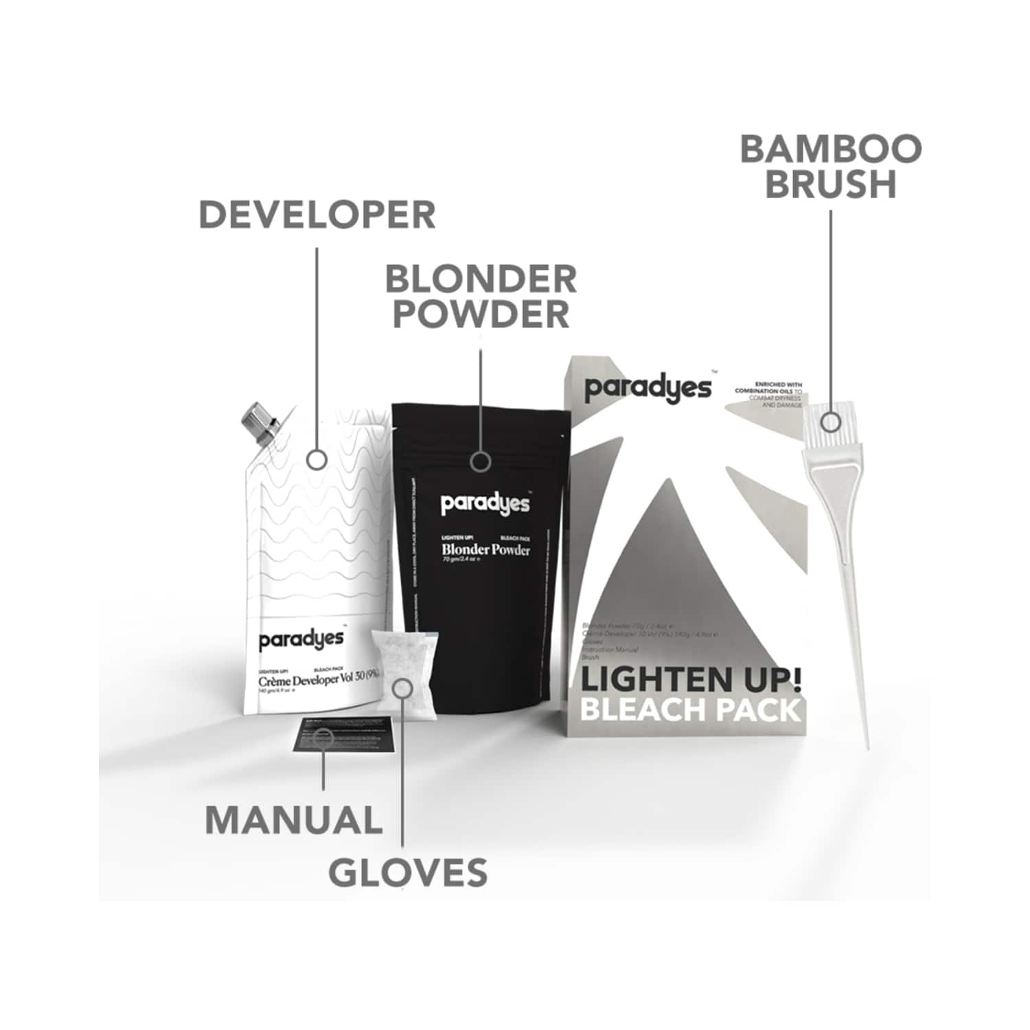 Get that perfect blonde hair at home with the Paradyes Lighten Up! Bleach Pack - Dark Brown (210g). This at-home nourishing hair bleaching kit contains a developer, blonder powder, bamboo brush, and gloves to help you lighten your locks up to 4-6 levels. Plus, this Paradyes bleach pack has almond, olive, and flaxseed oils to combat hair damage and dryness.Key Features & Benefits:Beginner-friendly bleach kit includes a developer, blonder powder, bamboo brush, and glovesLifts the hair color up to 4-6 levelsEnriched with almond, olive, and flaxseed oils to fight hair damage and drynessVegan and cruelty-free bleach is free from parabens for safe useKey Ingredients:Almond oil, olive oil, and flaxseed oil: Moisturize the hair to fight hair damage and drynessAll Ingredients:Blonder Powder: Potassium Persulfate, Ammonium Persulphate, Silica Gel, Sodium Silicate, Magnesium Carbonate Hydroxide, Sodium Stearate, Fumed Silica, Xanthan Gum, Starch, D&C Approved Ultramarine Blue Color Creme Developer Vol 30 (9%): Dm-Water, Hydrogen Peroxide, Peg 100 Stearate Se & Glyceryl Stearate, Cetostearyl Alcohol, Light Liquid Paraffin, Propylene Glycol, Orthophosphoric Acid, Sodium Stannate, Disodium Edta, Prunus Dulcis (Almond) Oil, Linum Usitatissimum (Flaxseed) Oil, Olea Europaea (Olive) OilHow to Use:Wash and dry your hair thoroughly. Keep a mirror, towel, water, aluminum foil, and some cotton balls handy in a well-ventilated area. Apply oil or petroleum jelly around the hairline, face, and neck to avoid the product from getting onto the skin. Ensure you or anyone handling the product wears the protective gloves provided throughout the process. Mix the bleach in any bowl except a metal bowl. Mix the blonder powder and developer in a 1:2 ratio, ensuring the mixture is smooth and has no lumps. Once the strand test comes out safe, apply the product evenly onto the hair sections. First, apply on the mid-lengths and ends and later on the root area. Cover the sections with foil after using the product and let it rest for the required amount of time, as determined by the strand test. Once you achieve the desired hair level, rinse thoroughly and dry your hair. Proceed with the color application.About the Brand:Launched in 2021 by Yushika Jolly, Paradyes is India's first semi-permanent hair color brand. The brand develops ammonia-free hair colors that allow its consumers to express themselves confidently. They believe that just because Indian hair comes in darker shades, it doesn't have to be sidelined and offers dyes that deposit even on dark hair. All of their products are free from ammonia, parabens, and PPD. They strive to reinvent themselves in the hair-cosmetic industry and continuously add to their spectrum of colors. Paradyes offers semi-permanent hair color, one-wash hair color, DIY bleaching and coloring kits, serums, hair oils, and more.Check out more Paradyes Hair Colour options here, or browse through tokocart's full range of Hair Colour from top global brands.You can also explore other products from the world of Paradyes here on tokocart.