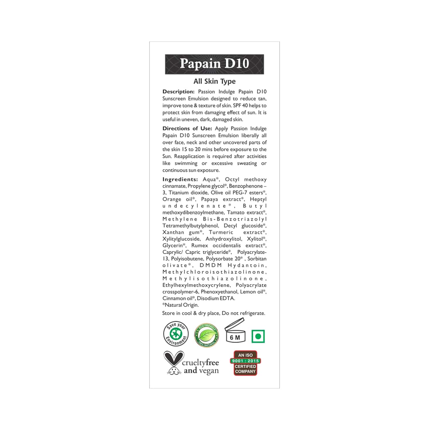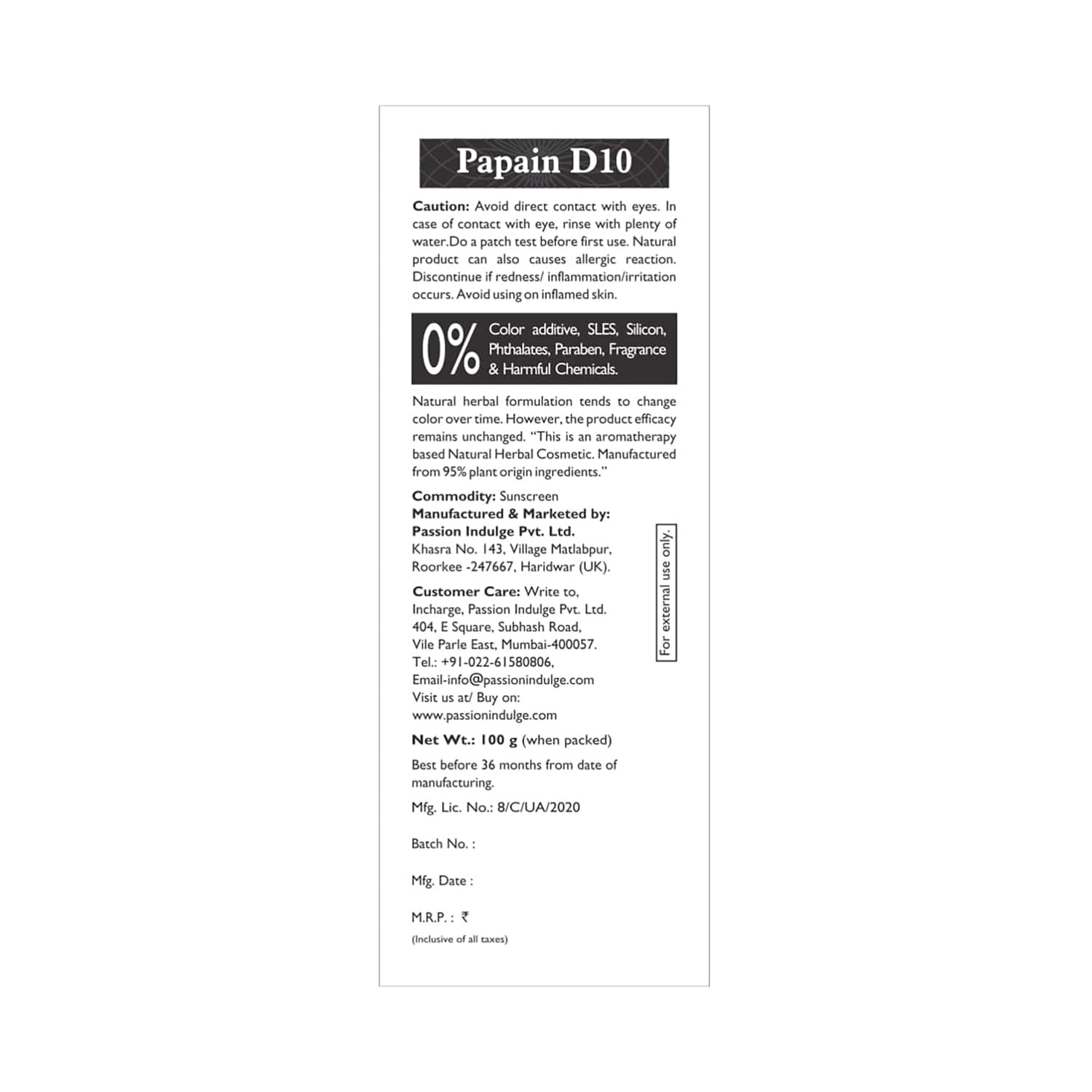 The Passion Indulge Papain D10 Sunscreen (100g) is the perfect choice for when the heat is on. The Passion Indulge sunscreen is great for nourishing the body as it helps to improve dry skin and locks-in moisture by removing excessive heat from the body. It is infused with papaya, which helps to protect the skin from harmful UV rays.Key Features & Benefits:Enriched with papaya to protect skin from harmful UV raysHydrating sunscreen locks in the moisture of skinParaben-free sunscreen is safe to useSunscreen is suitable for all skin typesKey Ingredients:Tomato: Balances skin's pH and regulates sebumCinnamon: Restores the natural color of the skinOrange: Fights free radicalsTurmeric: Nourishes skinLemon: Improves dry skin and locks in moisturePapaya: Protects skin against harmful UV raysHow to Use:15 to 20 minutes prior to sun exposure, liberally apply Passion Indulge papain D10 sunscreen emulsion to the face, neck, and other exposed areas of the body. Following activities like swimming, high perspiration, or prolonged sun exposure, reapplication is necessary.All Ingredients:Lemon, Turmeric, Orange, Papaya, Tomato, Cinnamon.About the Brand:Passion Indulge Pvt Ltd is a herbal cosmetic company using aromatherapy. High-end, handcrafted, natural, and vegetarian therapeutic cosmetics are available at Passion Indulge. The Passion Indulge brand line is divided into several categories: bath and body, hair, skin care, essential oils, fragrances, and diffuser sets. The brand professionals offer a therapeutic variety of natural cosmetics thanks to their ongoing study on natural cosmetics ingredients, particularly pure essential oils. 'Do your part for Mother Earth' is the guiding idea behind their entire product line.