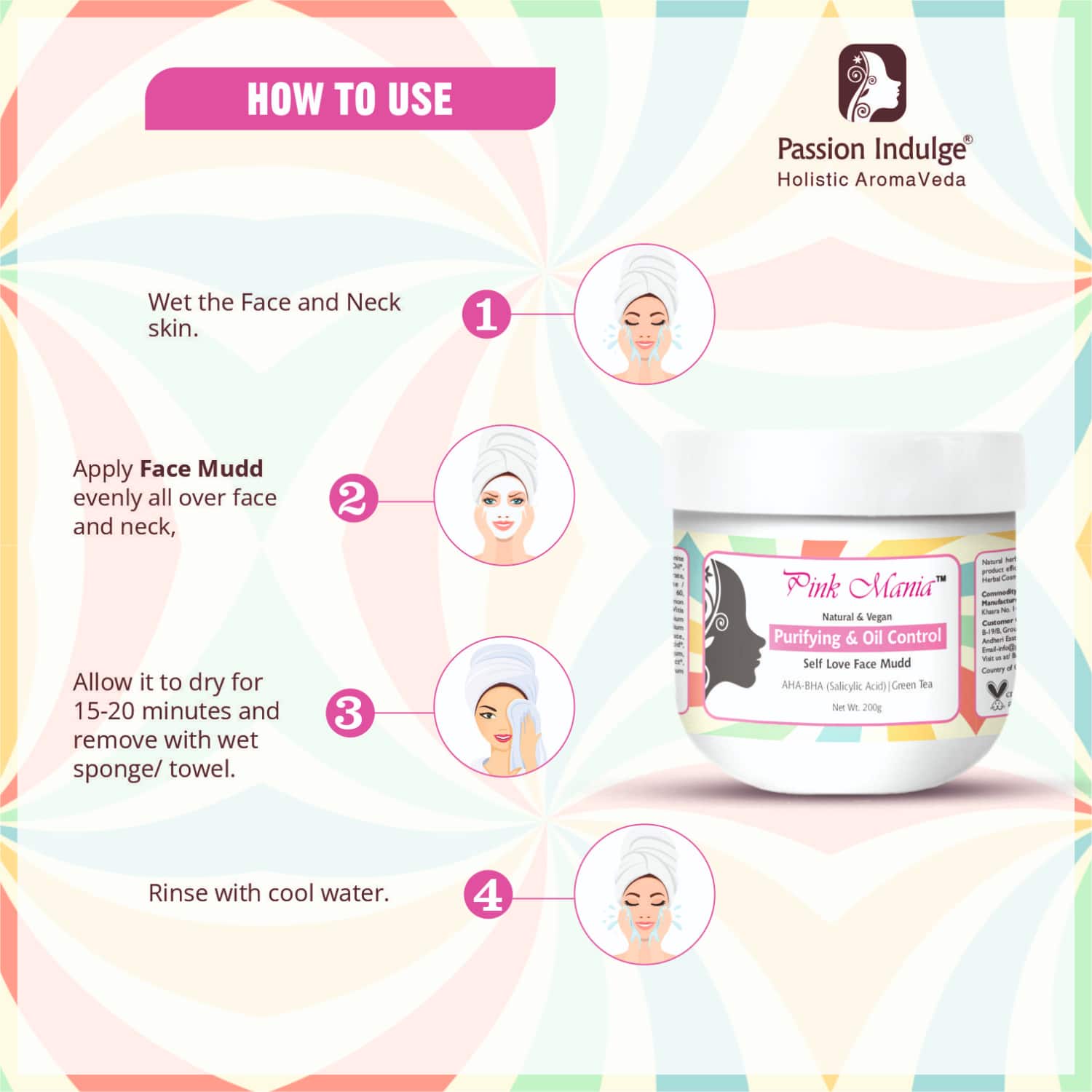 How to Use:First, cleanse your face and pat dry using a soft towel. Then, apply a generous amount of the face pack to your face and neck. Avoid contact with eyes. Allow it to dry for 15 to 20 minutes and wipe it off with a wet sponge or a towel.