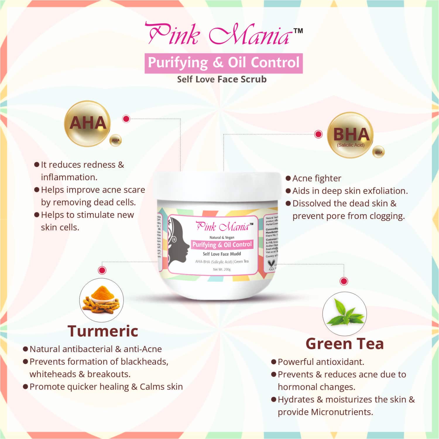 Key Features & Benefits:Formulated with AHA, BHA, and extracts of turmeric and green tea to remove dead skin cells, blackheads, and whiteheadsBalances the oil content of the skin to prevent acneExfoliates the skin to leave it smooth, bright, and glowingVegan and cruelty-free formula does not have preservatives, color, SLES, silicones, or fragrances to ensure safe use on all skin types