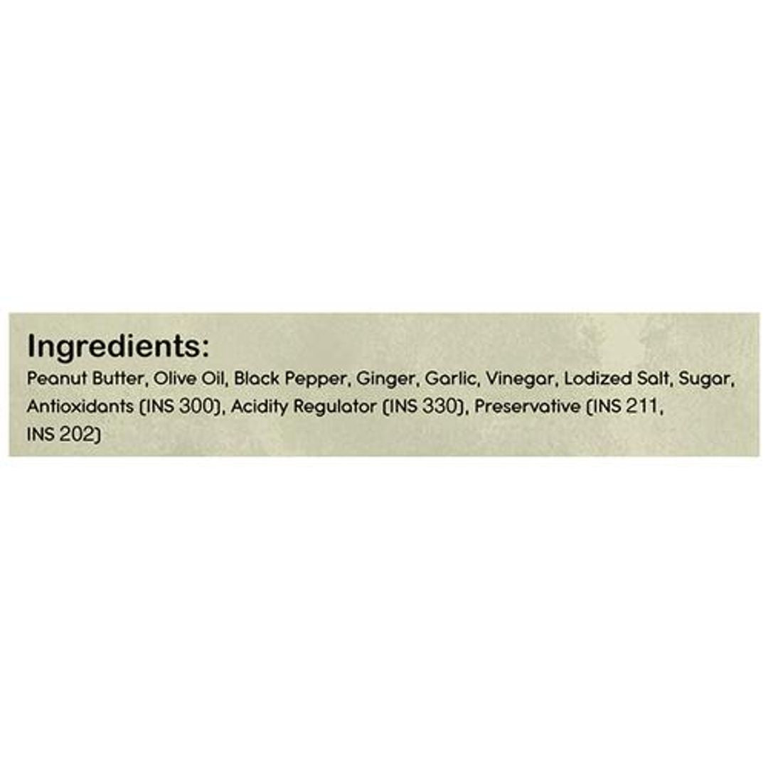Peanut Butter, Olive Oil, Black Pepper, Ginger, Garlic, Vinegar, Iodized Salt, Sugar, Antioxidants (INS 300), Acidity Regulator (INS 330), Preservative (INS 211, INS 202)
