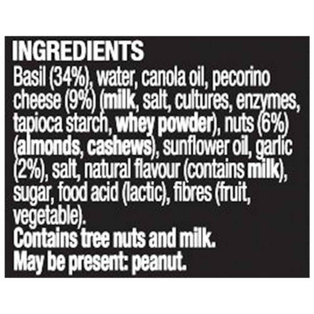 Basil (34%), Water, Canola Oil, Pecorino Cheese (9%) (Milk, Salt, Cultures, Enzyme Tapioca Starch Powder), Nuts 6%) (Almonds, Cashews), Sunflower Oi, Garlic (2%), Salt, Natural Flavour (Contains Milk), Sugar, Food Add (Lactic), Fibres (Fruit, Vegetable) Contains Tree Nuts And Milk. May Be Present Peanut