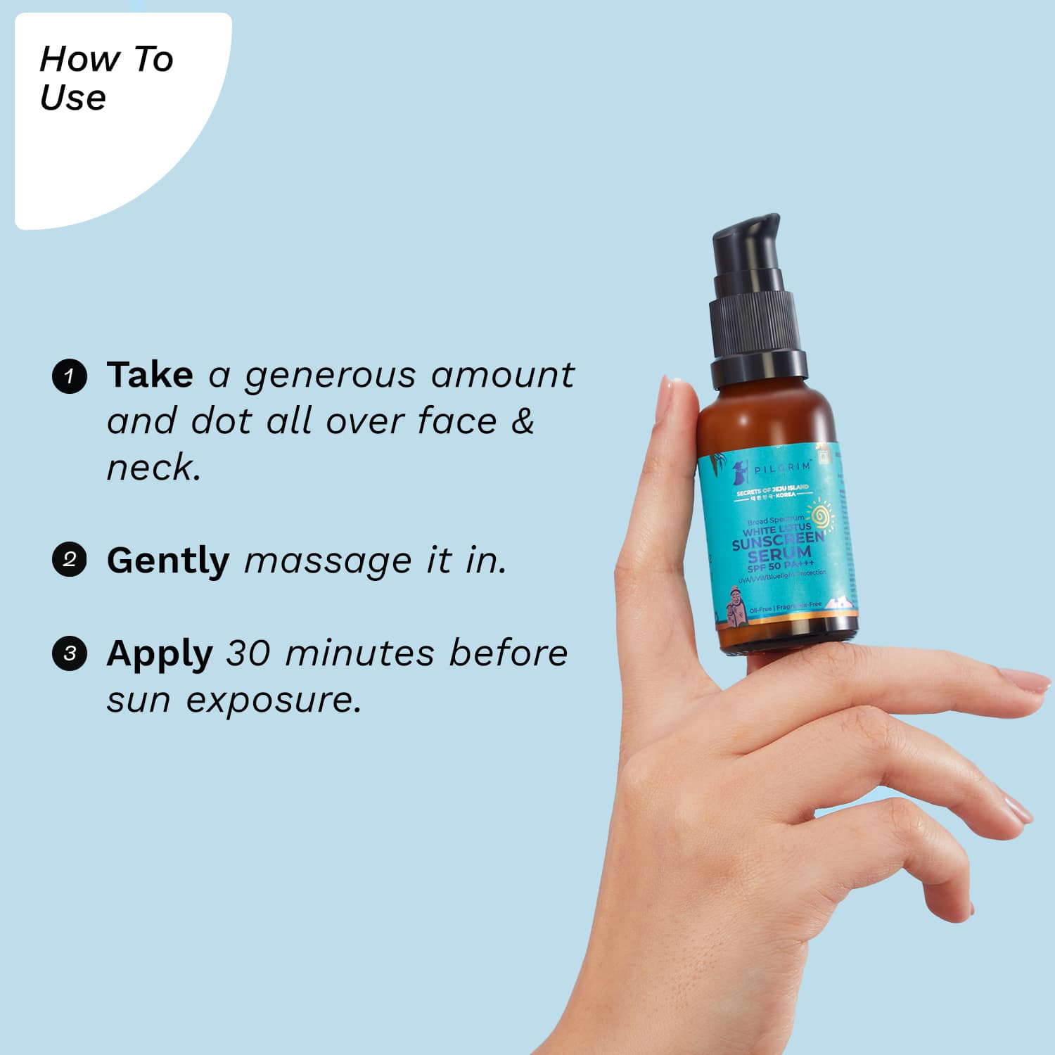 How to Use:Take an adequate amount of sunscreen on your palm. Dab it over your face and neck and massage it in a circular motion until absorbed completely. If you apply makeup later, wait five minutes after applying the cream for better absorption.