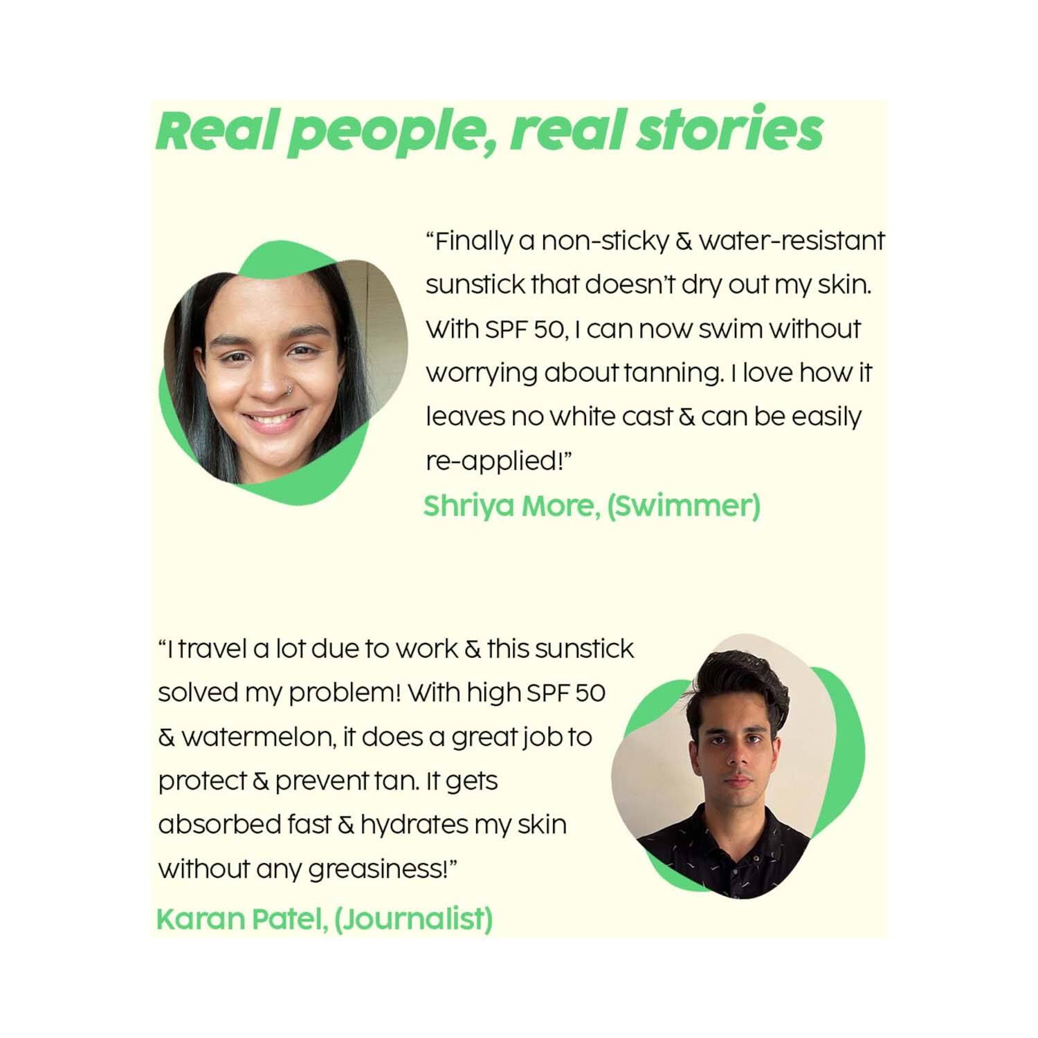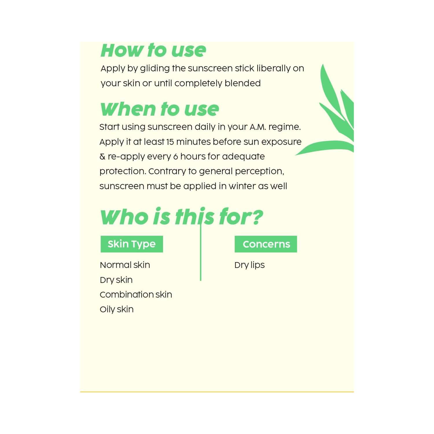 How to Use:Open the sunscreen stick and swipe the stick over your skin, applying the sunscreen all over your face liberally. Blend the sunscreen into your skin by massaging it gently. Use sunscreen at least 15 minutes before sun exposure.
