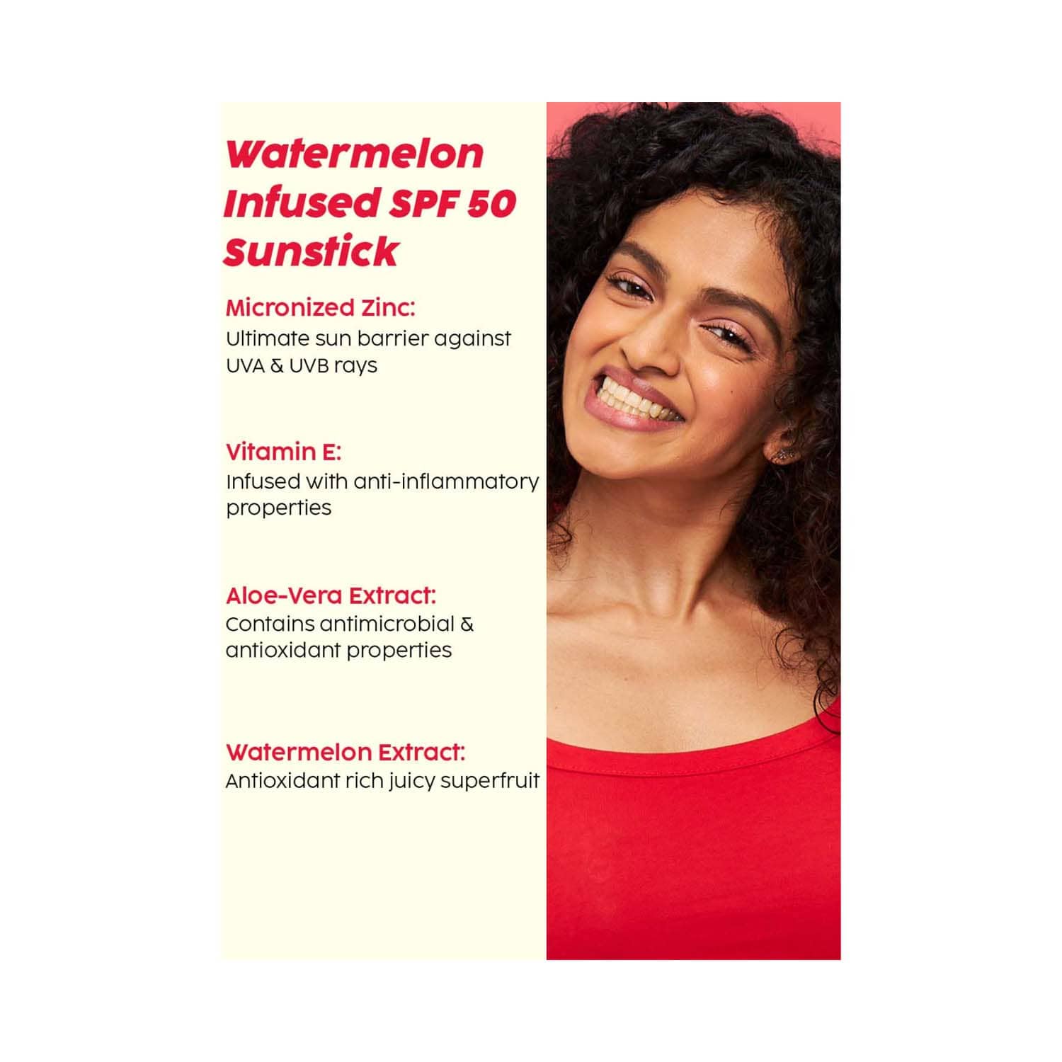 Key Ingredients:Micronized zinc: Reflects UV rays and protects the skinVitamin E: Reduces inflammation and protects the skinAloe vera: Hydrates, protects, heals the skinWatermelon extract: Hydrates and refreshes the skin