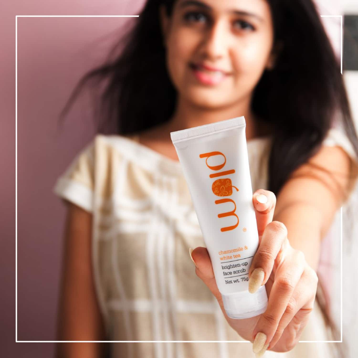 Get rid of dead cells, dirt, and dullness with the Plum Chamomile & White Tea Brighten-Up Face Scrub - (75g) to reveal your brighter self and wave goodbye to your sun tan. This brightening facial scrub's gentle cellulose beads and potent walnut shell powder are the ideal combinations for exfoliating.Key Features & Benefits:Instant brightening face scrub brightens up dull, sun-damaged skinWalnut shell granules for an effective facial scrubChamomile extract and aloe juice soothes sun-exposed skinCombination of 5 antioxidant leaf extracts provide added nourishment100% vegan, paraben-free, cruelty-free, and phthalate-free face scrubKey Ingredients:Sunflower oil: For achieving the perfect baseCellulose beads: Has gentle effect on the skin and is good for environmentChamomile extract: Provides a soothing effect to your skinHow to Use:Start with a wet, freshly cleaned face. For as long as it feels comfortable, gently massage the chamomile facial scrub into the forehead, cheeks, nose, and chin in an upward-outward circular motion. Rinse off, then pat yourself dry. Use a moisturiser or SPF to lock in the loveliness. Don't scrub more than three times every week.All Ingredients:Aqua, Cetearyl Alcohol, Juglans Regia (Walnut) Shell Powder, Helianthus Annuus (Sunflower) Seed Oil, Stearic Acid, Aloe Barbadensis (Aloe Vera) Leaf Juice, Glyceryl Stearate, Glycerin, Olive Oil Peg-7 Esters, Titanium Dioxide, Peg-100 Stearate, Phenoxyethanol, Ethylhexylglycerin, Cellulose Beads, Fragrance, Triethanolamine, Polysorbate 80, Matricaria Recutita (Chamomile) Flower Extract, Camellia Sinensis (White Tea) Leaf Extract, Camellia Sinensis (Green Tea) Leaf Extract, Glycyrrhiza Glabra (Licorice) Root ExtractAbout the Brand:Founded in 2014, Plum offers a wide range of products for your skincare routine, from facewashes for different skin types to moisturisers, body mists, shower gels, and more. The brand upholds the core values of customer delight, respect, sustainability, and transparency. Plum believes that people look their best in the skin they were born, and hence is against the concept of fairness creams. All the products are formulated to help protect, repair, and nourish the skin and hair using natural ingredients that are in sync with science.