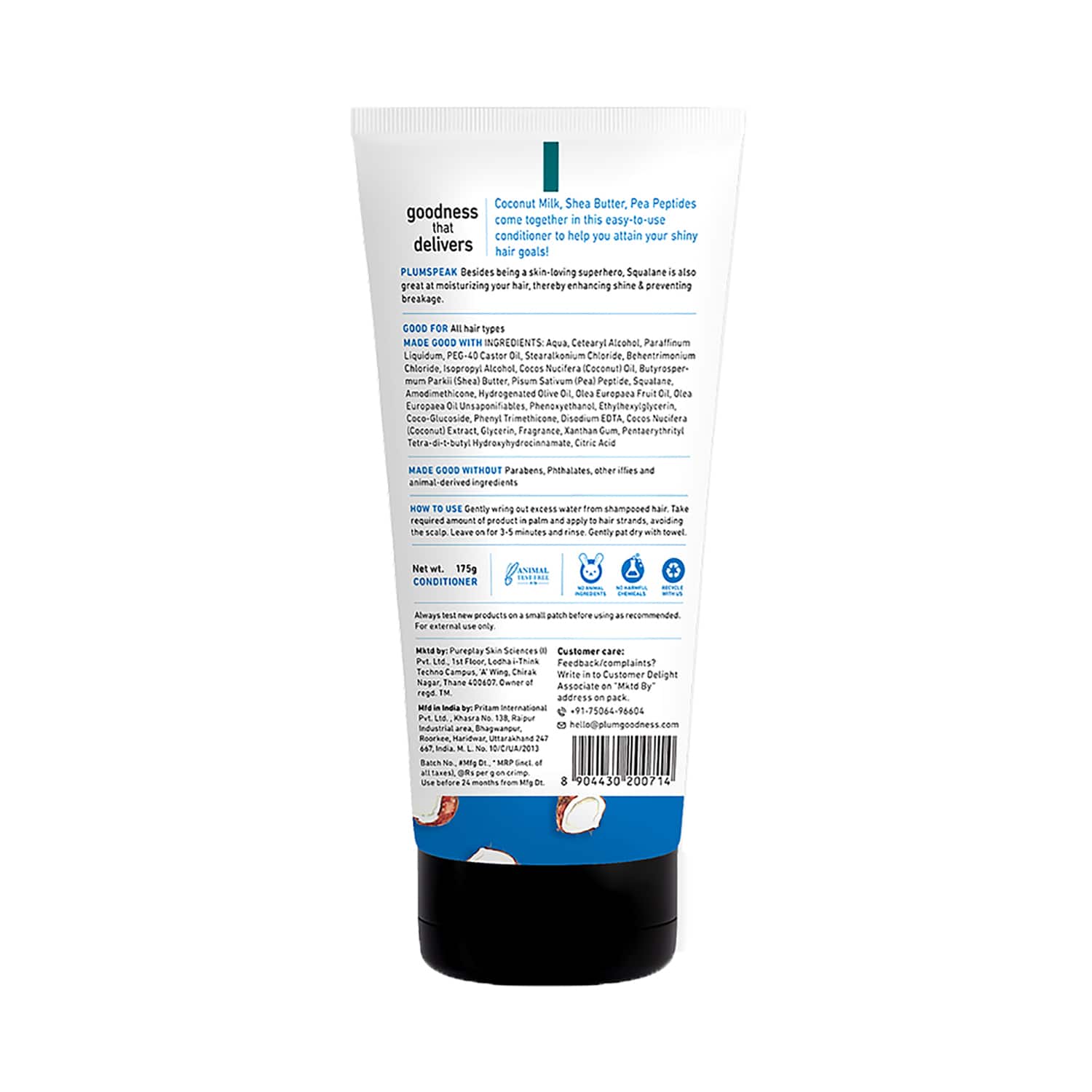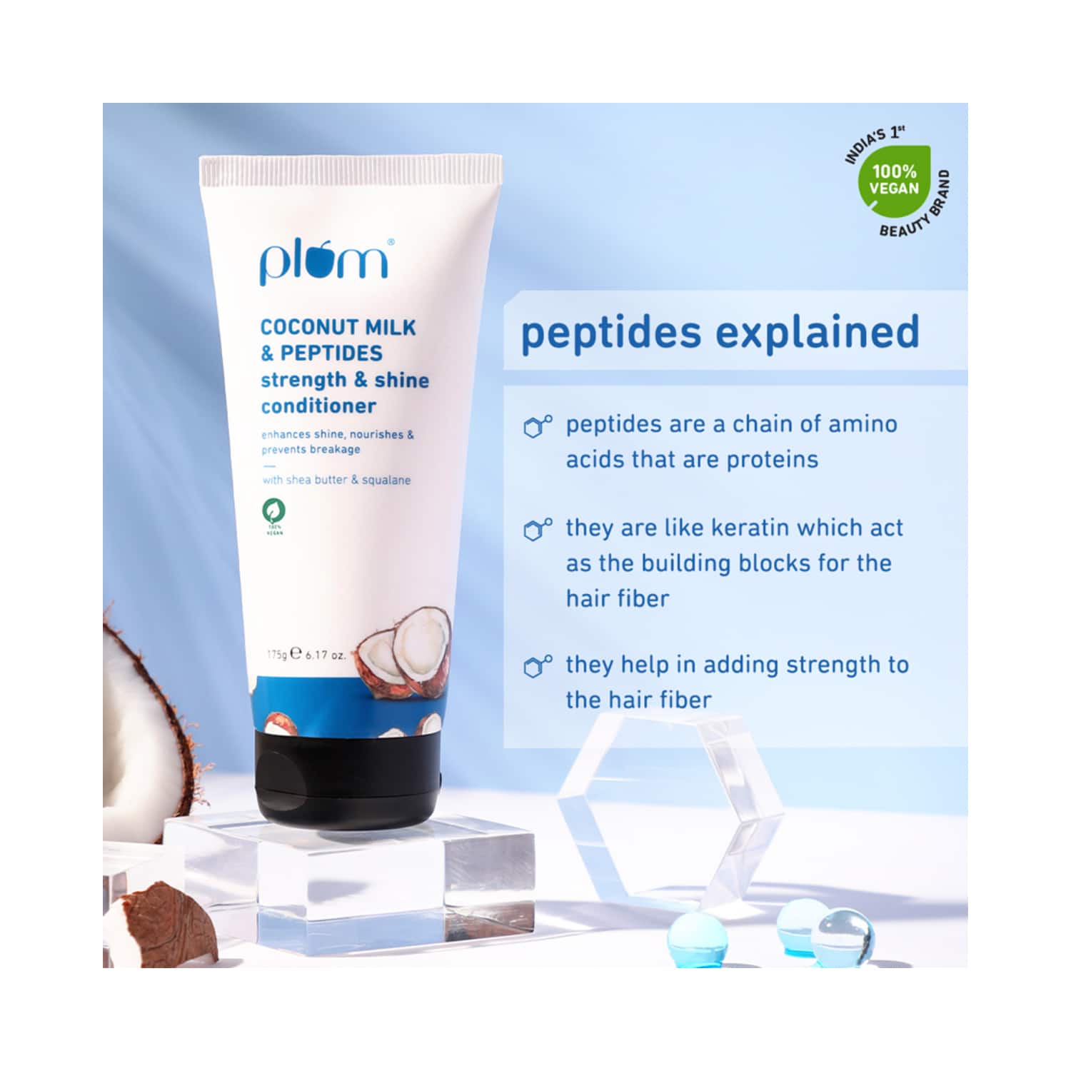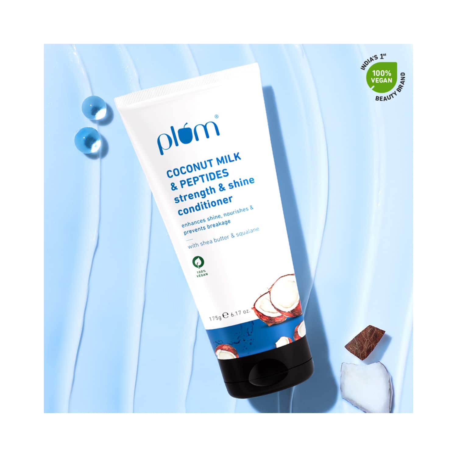 Revamp your hair care routine with the Plum Coconut Milk & Peptides Strength & Shine Conditioner (175g). Enriched with coconut milk and peptides, this nourishing conditioner deeply hydrates and revitalizes your hair, restoring its bounce, shine, and volume. This hair-strengthening conditioner repairs your hair strands, reducing breakage and improving overall hair health. Offering guilt-free use with its vegan formulation, this Plum hair conditioner gives your hair the tender care it deserves.