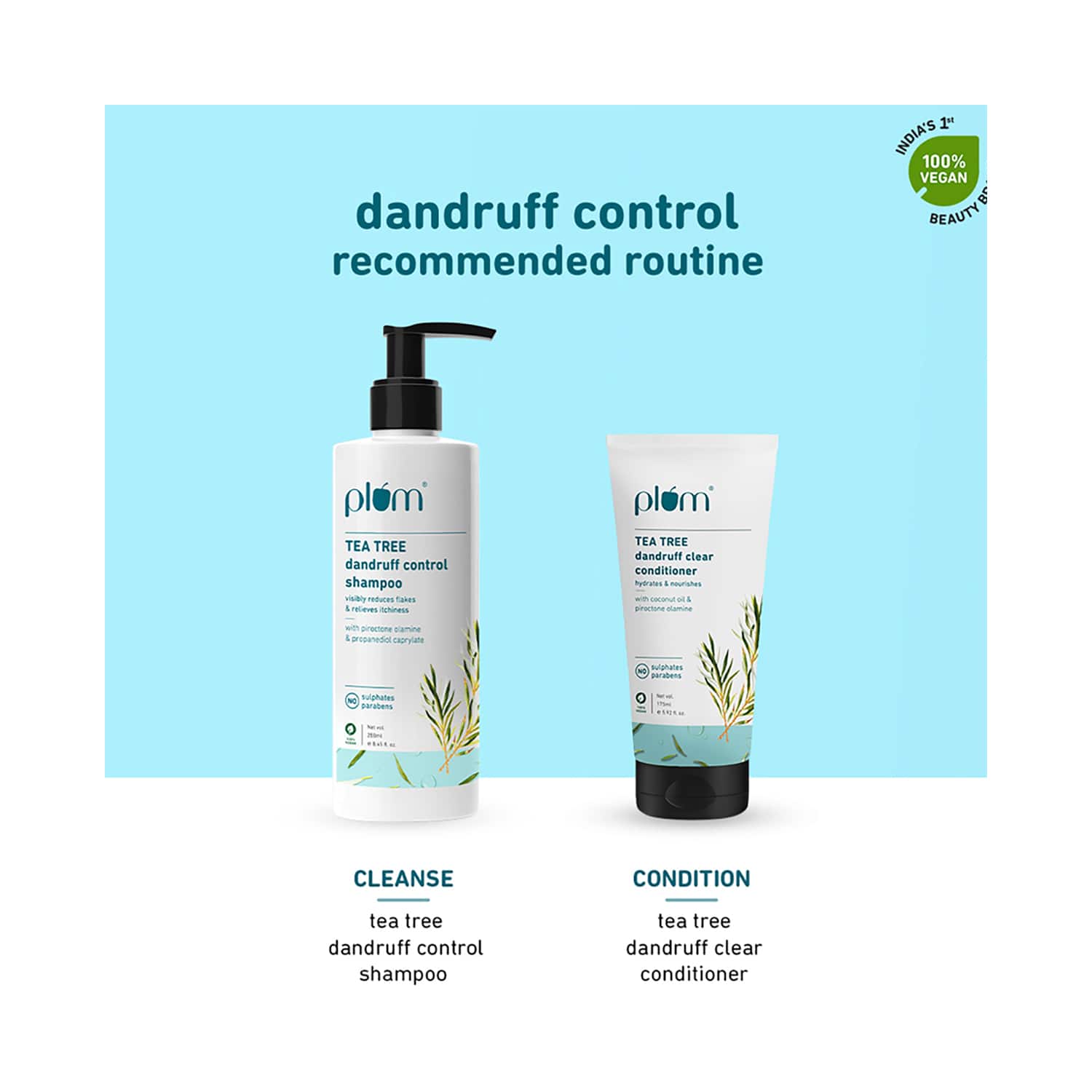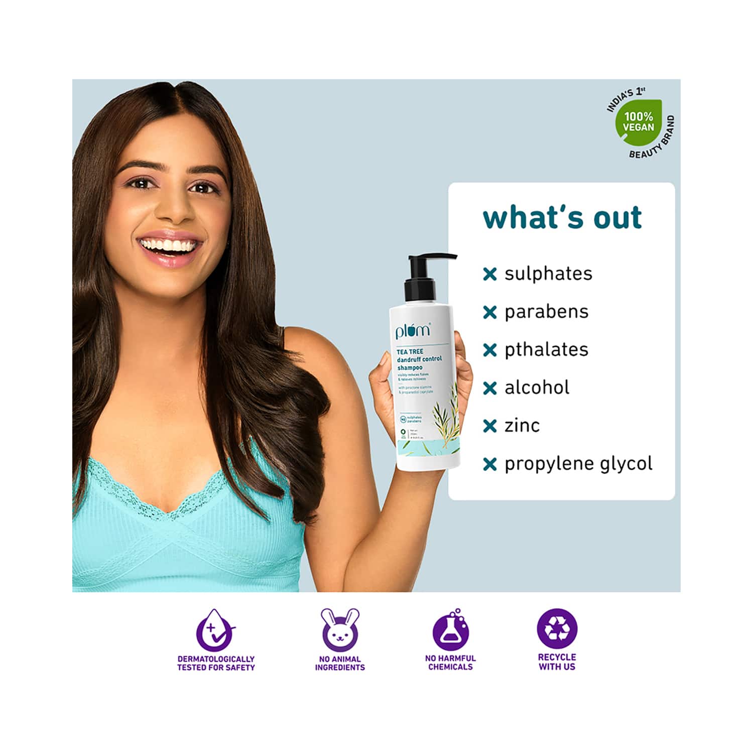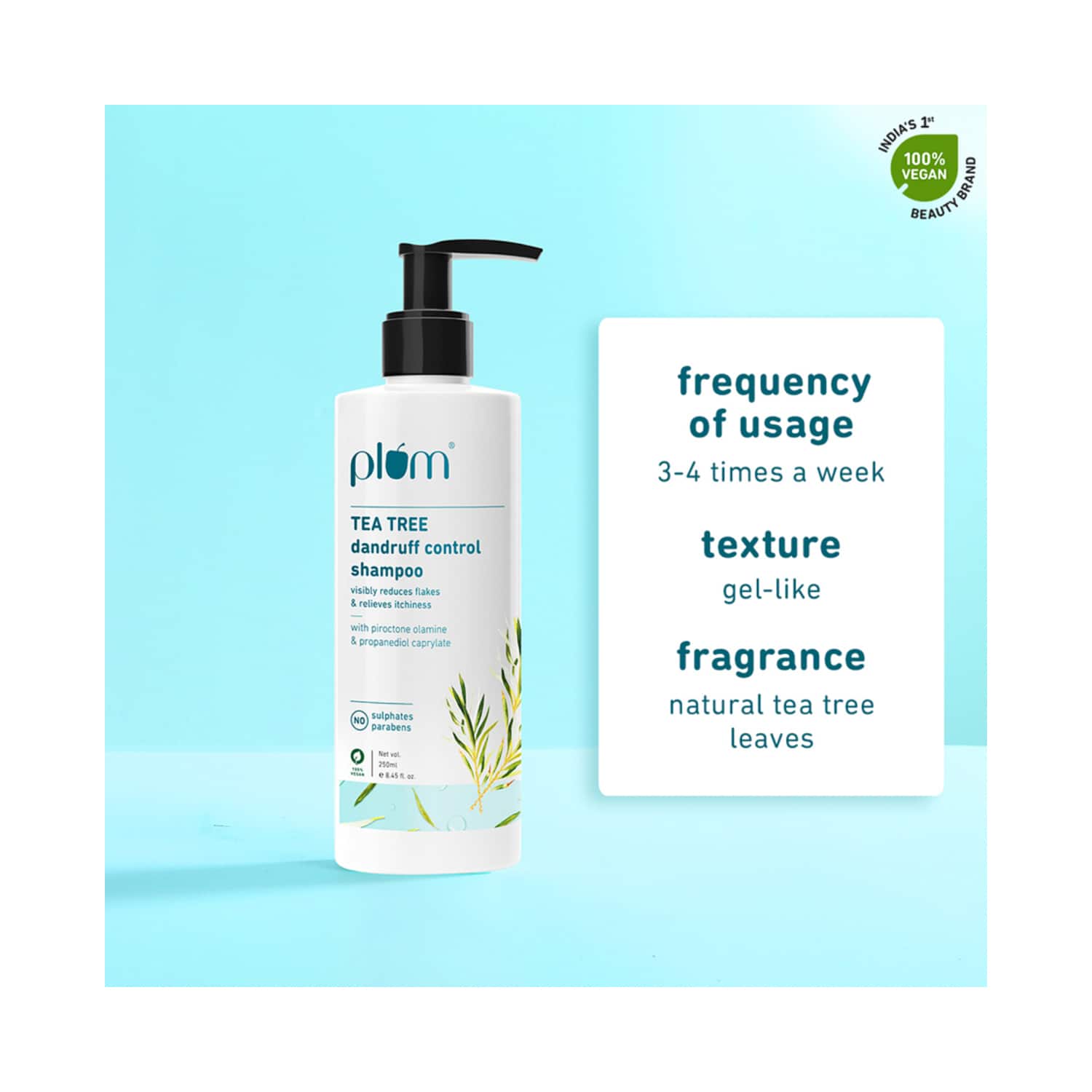 Quickly and effectively control dandruff with the Plum Tea Tree Dandruff Control Shampoo (250ml). This scalp care shampoo is infused with willow bark extract and tea tree leaf oil to cleanse your hair and soothe and exfoliate your irritated scalp. Its fragrance-free and silicone-free formula makes it perfect for all hair types. And lastly, this Plum anti-dandruff shampoo leaves your locks feeling soft and manageable.Key Features & Benefits:Infused with willow bark extract and tea tree leaf oil to soothe and nourish scalp and hairGently exfoliates to remove excess oil and impurities from scalpLeaves hair silky, smooth, and dandruff-freeFormulated without fragrance or silicone to ensure safe useKey Ingredients:Willow bark extract and tea tree leaf oil: Nourish and soothe scalp and hairAll Ingredients:Aqua, Sodium Lauroyl Sarcosinate, Cocamidopropyl Betaine, Coco-Glucoside, Polyquaternium-7, Propanediol, Melaleuca Alternifolia (Tea Tree) Leaf Oil, Salix Alba (Willow) Bark Extract, Propanediol Dicaprylate, Piroctone Olamine, Sodium Benzoate, Potassium Sorbate, Citric Acid, Sodium Chloride, Acrylates/C10-30 Alkyl Acrylate Crosspolymer, D-Panthenol, Sodium GluconateHow to Use:First, wet your hair thoroughly. Then, squeeze the required amount of shampoo on your palm and create a lather by rubbing your hands together. Next, apply the lathered shampoo on your scalp generously. Last, rinse your hair with water and follow by using a conditioner.About the Brand:Founded in 2014, Plum offers a wide range of products for your skincare and haircare routine, from facewashes and shampoos for different skin and hair types to moisturizers, body mists, shower gels, and more. The brand upholds the core values of customer delight, respect, sustainability, and transparency. Plum believes that people look their best in the skin they were born, and hence is against the concept of fairness creams. All the products are formulated to help protect, repair, and nourish the skin and hair using natural ingredients that are in sync with science.Check out more Plum Shampoo options here, or browse through tokocart's full range of Shampoo from top global brands.You can also explore other products from the world of Plum here on tokocart.