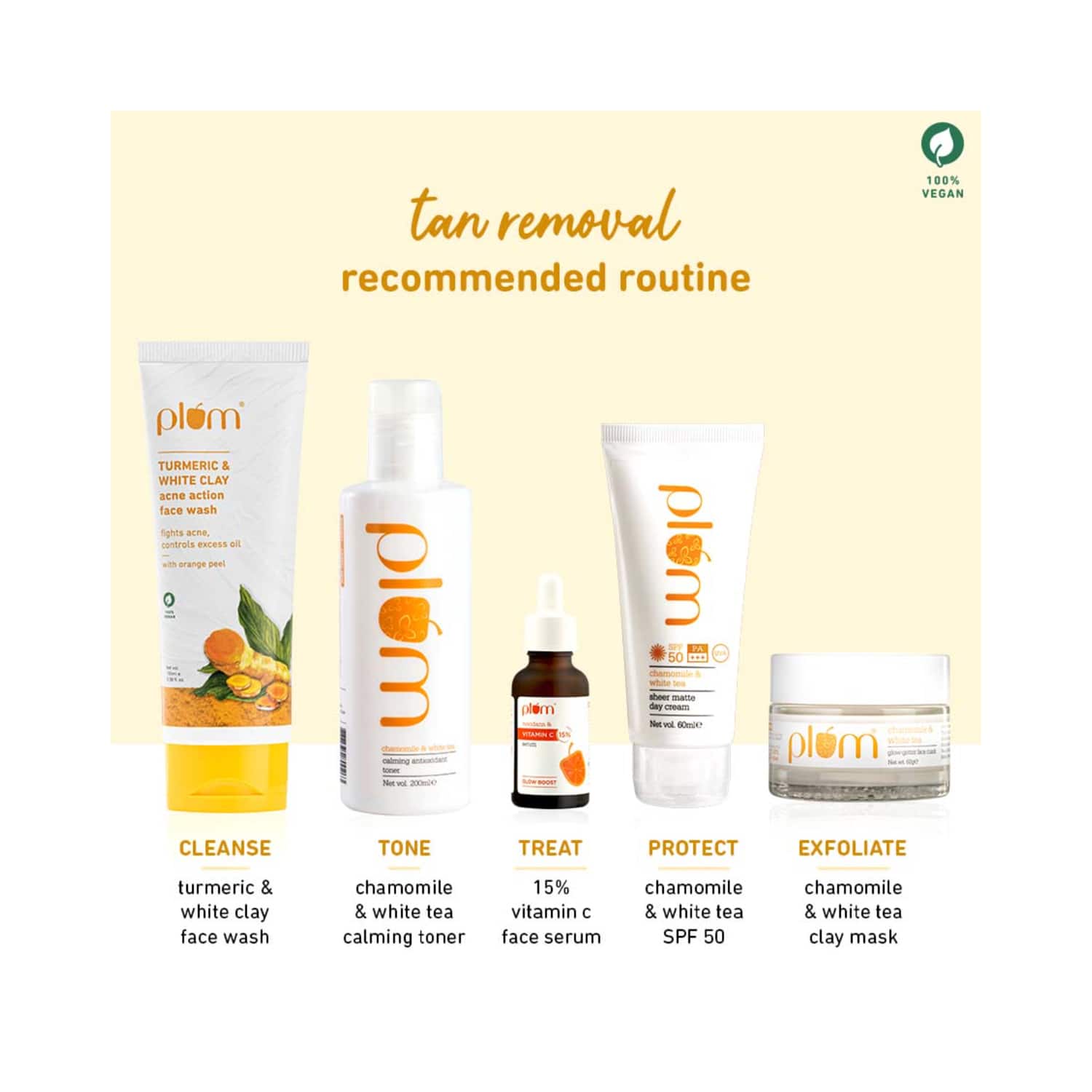 Enhance your skin's radiance with the Plum Turmeric & White Clay Acne Action Face Wash (100ml). This gentle, non-drying facewash is enriched with turmeric that helps skin look radiant. Also, the Plum Acne Action facewash help fight acne, control excess oil, and soothe sun damage. This exfoliating facewash gently cleans the skin, making it brighter and smoother.Key Features & Benefits:Enriched with turmeric to even out skin toneExfoliating facewash removes dead cells and dirtHelps soothe sun damage and sun tanCruelty-free for safe and sustainable useKey Ingredients:Turmeric: Evens out skin toneWhite clay: Absorbs excess oil and unclogs poresOrange peel: Helps in tan removalHow to Use:Take a small amount and apply it to the dampened face. Lather and eventually rinse with water. Use regularly for good results.All Ingredients:Aqua, Cocamidopropyl Betaine, Kaolin, Coco Glucoside, Magnesium Aluminum Silicate, Sodium Cocoyl Glycinate, Glycerin, Propanediol, Niacinamide, Capryloyl/Caproyl Methyl Glucamide, Lauroyl/Myristoyl Methyl Glucamide, Curcuma Longa (Turmeric) Oil, Phenoxyethanol, Ethylhexylglycerin, Olive Oil Peg-7 Esters, Xanthan Gum, Ci 47005, Ammonium Acryloyldimethyltaurate/Vp Copolymer, Titanium Dioxide, Citrus Aurantium Dulcis (Orange) Peel Powder, Fragrance, Sodium Gluconate, Rosa Damascena Flower Water, Glycolic Acid, Citric AcidAbout the Brand:Founded in 2014, Plum offers a wide range of products for your skincare routine, from facewashes for different skin types to moisturisers, body mists, shower gels, and more. The brand upholds the core values of customer delight, respect, sustainability, and transparency. Plum believes that people look their best in the skin they were born, and hence is against the concept of fairness creams. All the products are formulated to help protect, repair, and nourish the skin and hair using natural ingredients that are in sync with science.