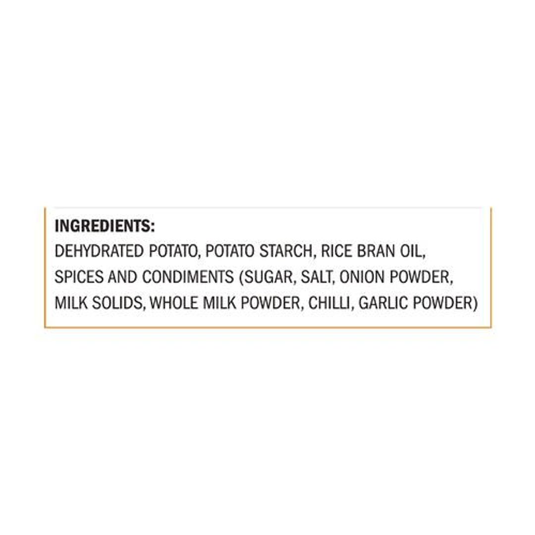 Dehydrated Potato, Potato Starch, Rice Brain Oil, Spices And Condiments (Sugar, Salt, Onion Powder, Milk Solids, Whole Milk Powder, Chilli, Garlic Powder).