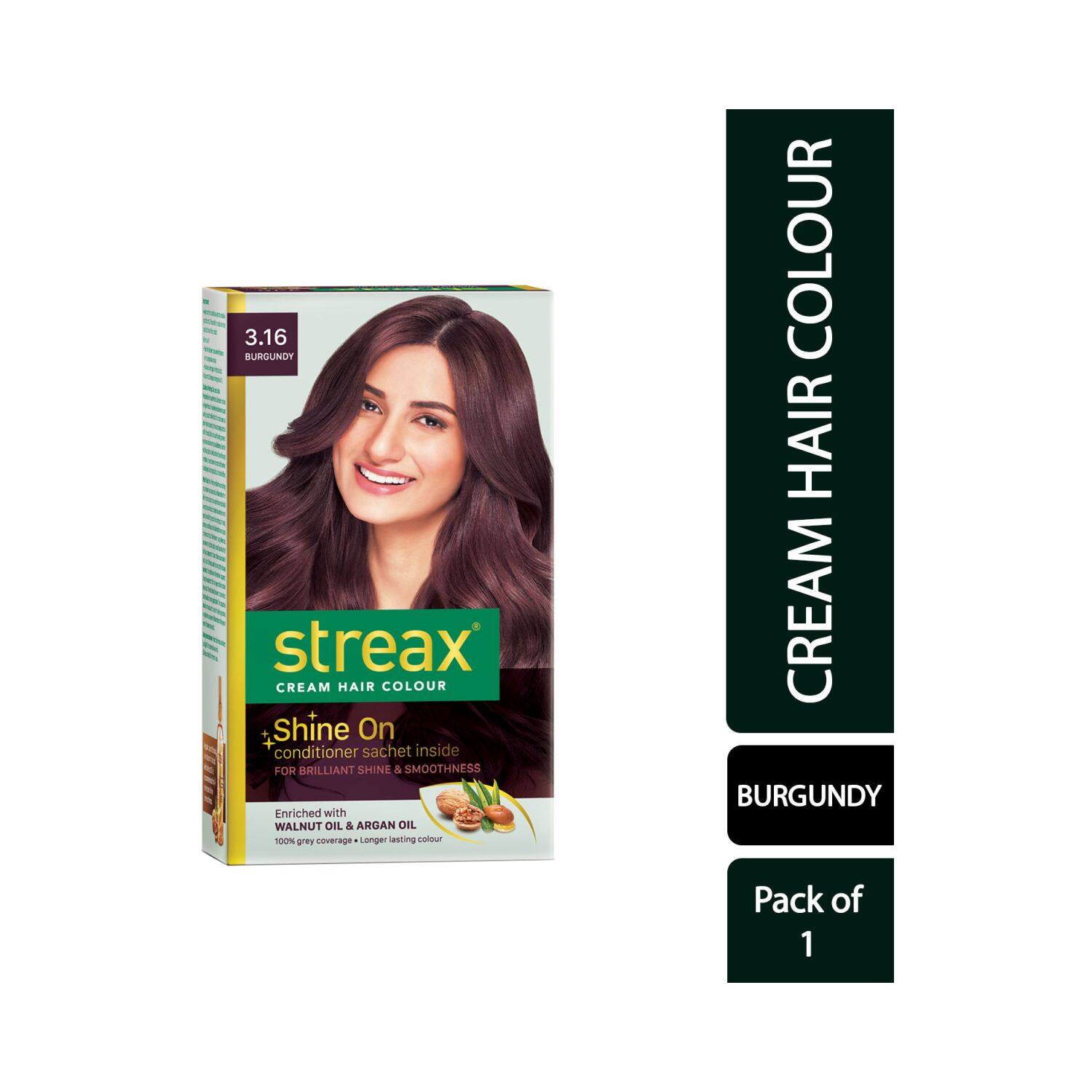 Give a new look to your hair with the Streax Hair Colour - 3.16 Burgundy (70gm+50ml). It is infused with walnut and argan oil to offer healthy and long-lasting color. This nourishing hair color also provides 100% grey coverage, so you feel confident in flaunting your hair every day. This Streax hair color imparts beautiful shine and smoothness to the hair, making it easily manageable.Key Features & Benefits:Conditioning hair color enriched with walnut and argan oil for improved hair healthOffers 100% grey coverageProvides long-lasting colorMakes hair soft, shiny, and manageableKey Ingredients:Walnut and argan oils: Make hair smooth and shinyAll Ingredients:Argan Oil, Walnut OilHow to Use:Take a non-metallic bowl and mix the colorant and the developer in it. Apply the mixture to clean and dry hair with the applicator brush. Leave for a maximum of 30 minutes, and wash it off with shampoo and conditioner.About the Brand:Launched in 2004, Streax is the first domestically manufactured Indian hair color brand. Since its launch, the brand has revolutionized the hair-care market by introducing hair colors that not only cover grey hair but inspire women to be confident in choosing their style. With time, this brand expanded its consumers by understanding the needs of modern Indian women. Now, it crafts a wide range of hair care products, from hair serums to highlight kits, all available on a cost-effective budget and formulated without chemicals.Check out more Streax Hair Colour options here, or browse through tokocart's full range of Hair Colour from top global brands.You can also explore other products from the world of Streax here on tokocart.