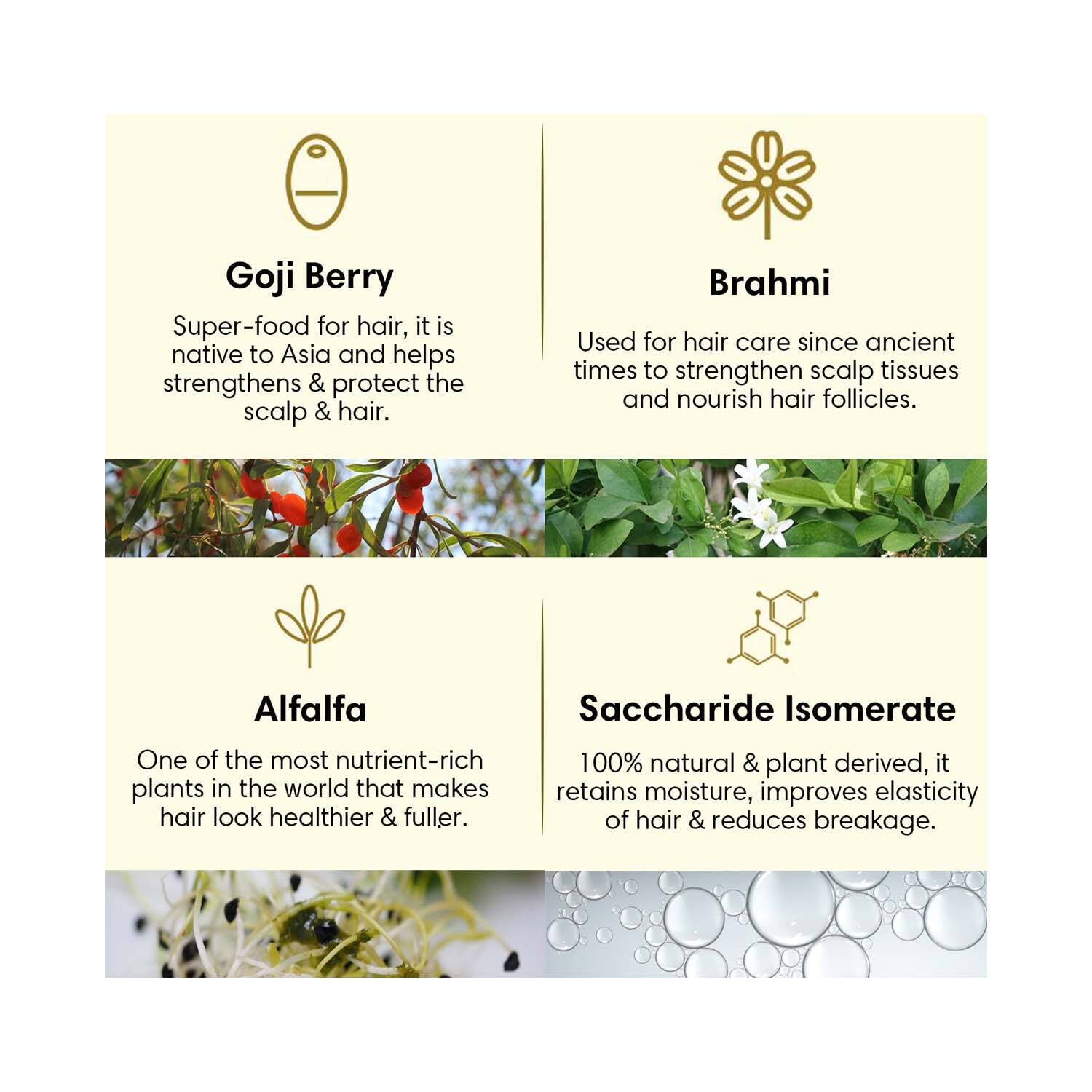 Key Ingredients:Goji berry: Strengthens and protects the hairBrahmi: Improves overall hair healthAlfalfa: Improves hair health and volumeSaccharide isomerate: Retains moisture and improves hair elasticity