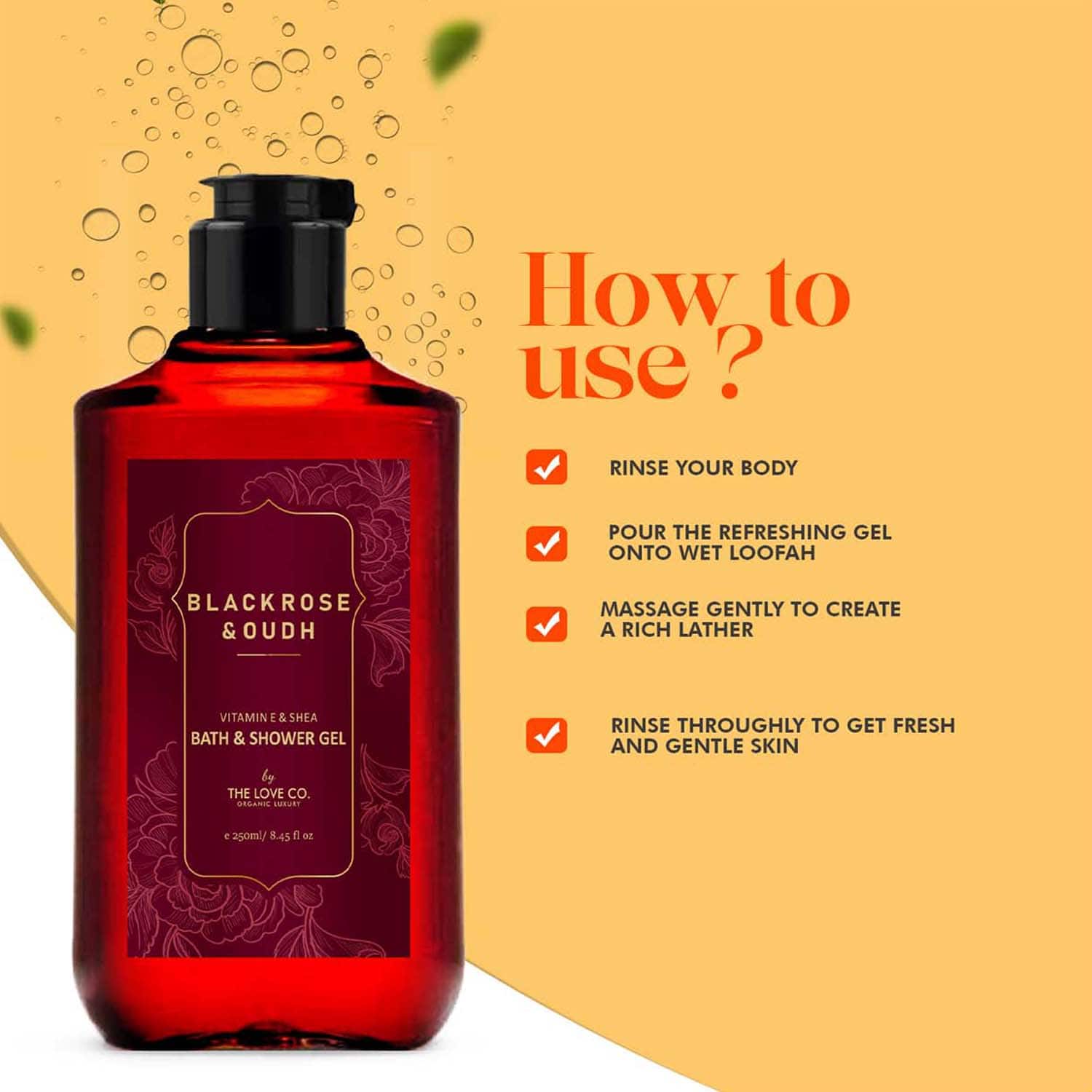 Transform your daily showers into luxurious retreats with the THE LOVE CO. Black Rose & Oud Bath & Shower Gel (250ml). Formulated with the nourishing power of vitamin E and shea butter, this moisturizing shower gel deeply hydrates the skin as it cleanses deeply to make it more youthful and radiant. Plus, this refreshing THE LOVE CO. shower gel is infused with a captivating fusion of velvety black rose and exotic oudh for a fragrance that pleases the senses and uplifts the mood.
