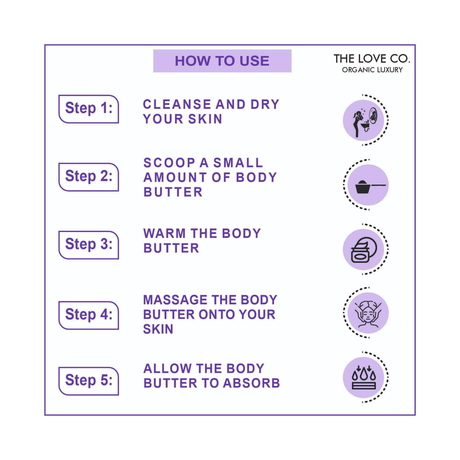 How to Use:Take a coin-sized amount of the body butter in your hand and begin applying it to the skin. Rub it into the skin with gentle, circular motions until it absorbs completely. Use it daily after your shower to maintain optimal hydration throughout the day.