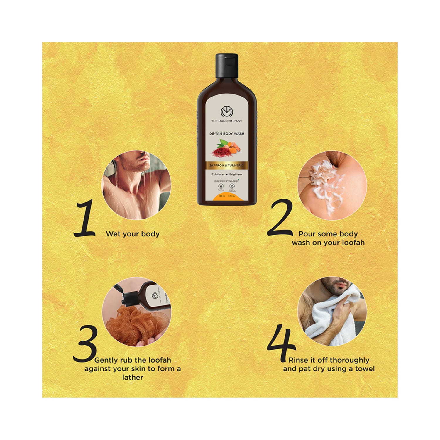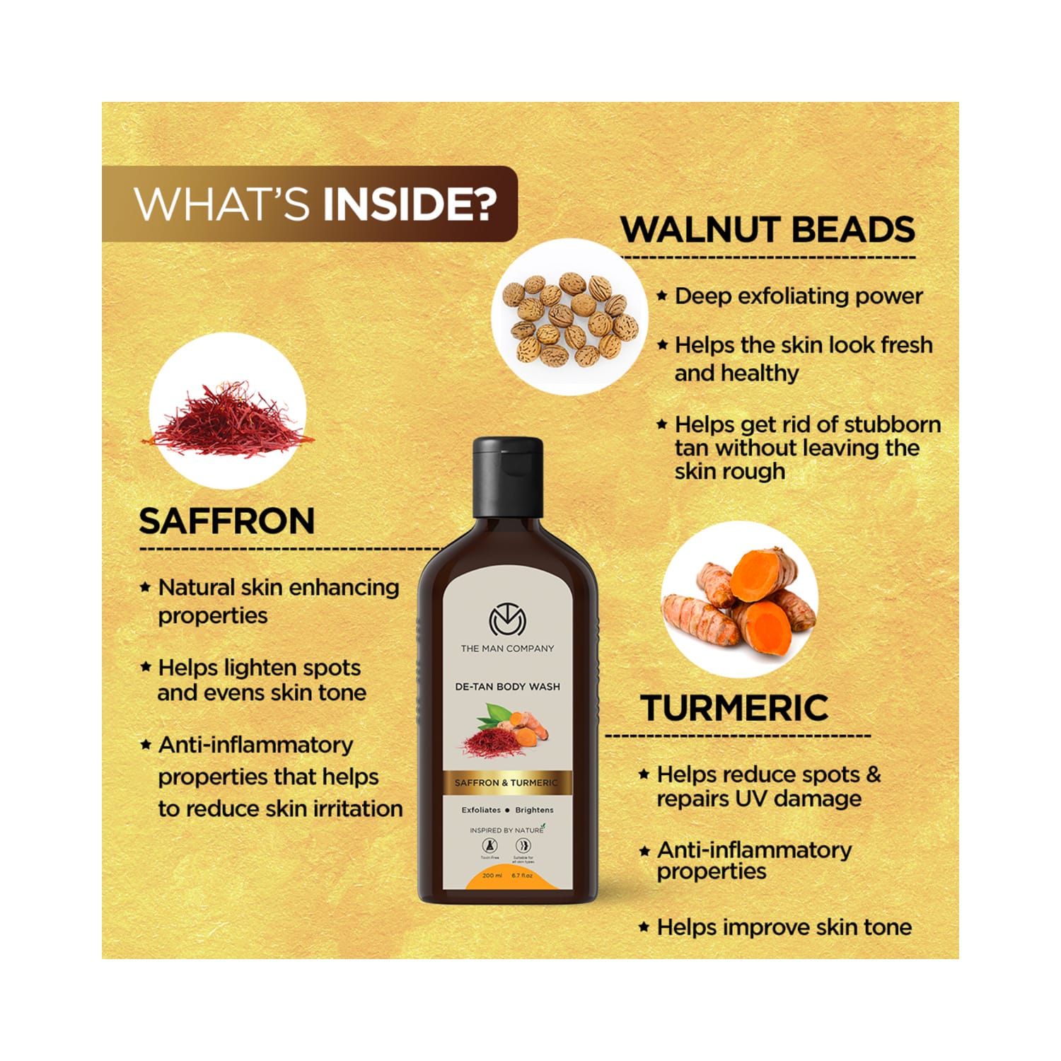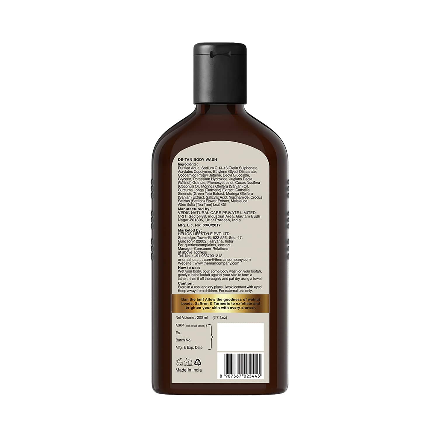 Unlock the secret to silky, smooth skin with the The Man Company De-Tan Body Wash (200ml). This conditioning body wash contains a blend of saffron and turmeric to reduce tanning, revealing a brightened complexion that glows with radiance. Also, The Man Company body wash gently exfoliates with walnut beads, removing dead cells and impurities for a silky smooth feel.Key Features & Benefits:Infused with saffron to lighten dark spots and promote even-toned skinEnriched with turmeric to provide anti-inflammatory benefitsContains walnut beads to exfoliate the skinFree from toxins for safe useFormulated to suit all skin typesKey Ingredients:Saffron: Lightens dark spots and evens out the skinTurmeric: Provides anti-inflammatory benefitsWalnut beads: Exfoliate the skinAll Ingredients:Purified Aqua, Sodium C 14-16 Olefin Sulfonate, Acrylates Copolymer, Ethylene Glycol Distearate, Cocoamido Propyl Betaine, Decyl Glucoside, Glycerin, Potasslum Hydroxide, Juglans Regia (Walnut) Granule, Phenoxyethanol, Cocos Nucifera (Coconut) Oil, Moninga Oleifera (Sahjan) Oil, Curcuma Longa (Turmeric) Extract, Camellia Sativus (Saffron) Flower Extract, Melaleuca Alternitolia (Tea Tree) Leaf Oil.How to Use:Apply the body wash to your hands and then rub them together to create a lather. Next, rub the lather over your entire body and rinse.About the Brand:The Man Company is a luxury brand that curates grooming products for men of all ages. The brand strives to support men in their ongoing transformation into better versions of themselves by providing high-end grooming essentials to suit every individual's needs. Their goal has always been to create the purest, best-quality skin, hair, and body care products. Their product offers modern gentlemen the chance to look and feel their best while tackling the world. Moreover, all their products are free of dangerous chemicals and contain premium essential oils and hand-selected natural components.Check out more The Man Company Shower Gels & Body Wash options here, or browse through tokocart's full range of Shower Gels & Body Wash from top global brands.You can also explore other products from the world of The Man Company here on tokocart.