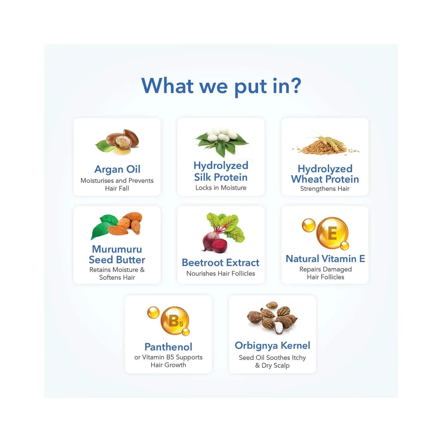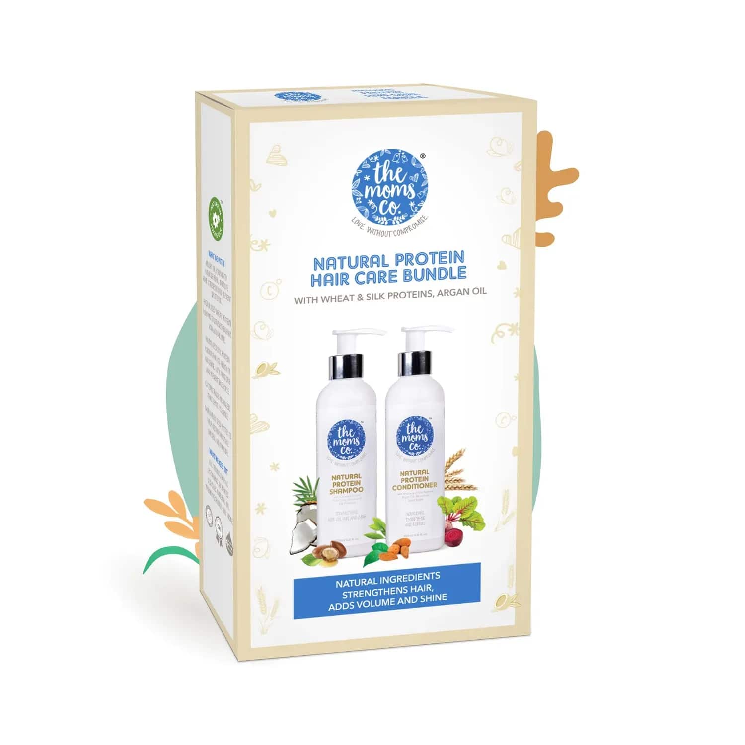 The Mom's Co. Protein Hair Care Bundle is derived from wheat and hydrolyzed, this protein penetrates the inner cortex of each hair strand and increases its ability to retain moisture. It is known to add volume and improve smoothness. Produces from the kernels of the Argan tree native to Morocco, Argan oil is rich in Vitamins A and E and is packed with antioxidants and Omega-6 fatty acidsMurumuru Seed Butter is the fat obtained from the seeds of the Murumuru palm tree which is native to Brazil and is loaded with vitamins and deeply moisturising oleic acid.Key Features & BenefitsStrengthens hair by 77%Nourishes & moisturizesAmla and bhringraj oils control hair fallHair detox systemKey IngredientsArgan Oil - Moisturizes and conditions, improves scalp health and prevents styling and coloring damageVitamin A - Reduces visible signs of ageing like open pores, fine lines and pigmentation spotsVitamin E - Helps heal blemishes, reduce hyperpigmentation and gives skin an out-of-this-world glowHow To UseTake 1-2 pumps of shampoo and mix it with water in the palm of your hand. Rub your palms together to create lather and apply on wet hair and scalp. Next, rinse your hair and repeat for a richer lathering experience. For best results, we recommend following it up with our Natural Protein ConditionerAll IngredientsAbout the BrandThe Mom’s Co was founded in 2016 for Indian women who refuse to compromise on quality. Working with experts across India, Australia & Switzerland it has created products that are safe, natural and meet the highest standards for ingredient safety around the world. This brand is on a mission to help Moms make safe, natural and effective choices.