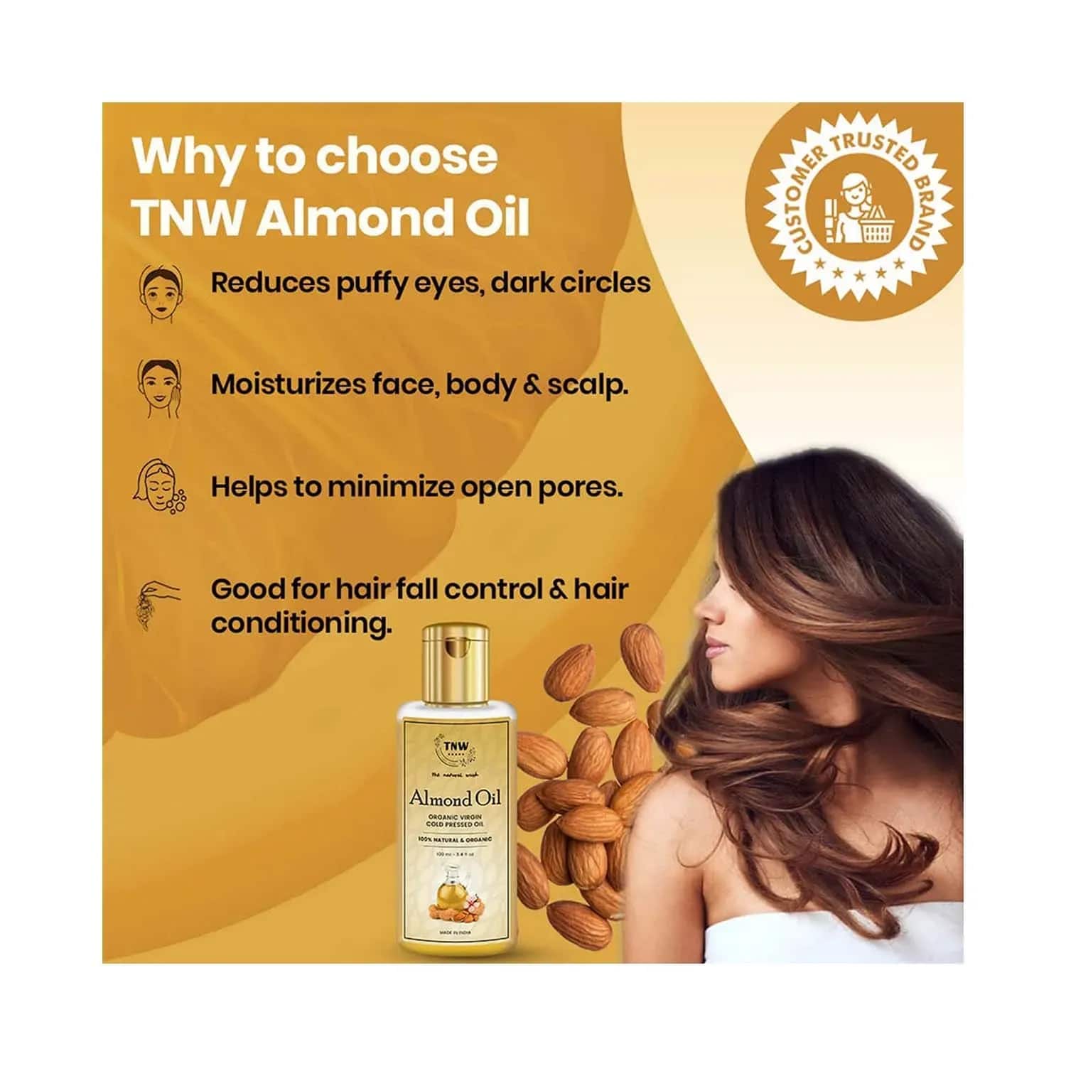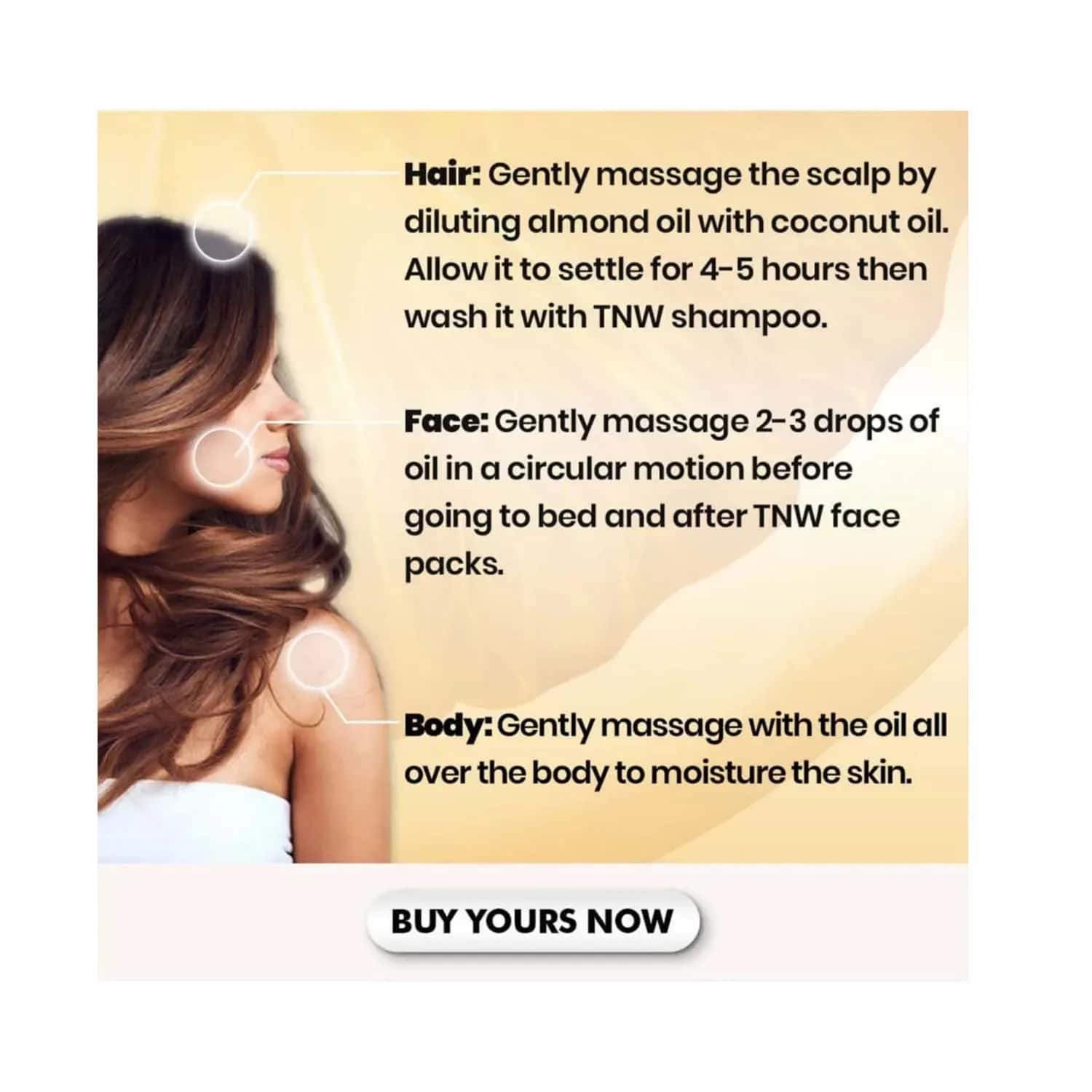 The Natural Wash Cold Pressed Virgin Almond Oil - (100ml) deeply hydrates your skin and hair. The pure almond oil is extracted through the cold pressing process to ensure that none of the nutrients and vitamins is stripped away. This almond oil for hair and skin is a great natural remedy for reducing puffiness and dark circles under the eyes. The hydrating almond oil can be used as a moisturiser for skin and hair and is also ideal for revitalising dead skin cells and providing nourishment. It also helps reduce hair fall, cleanse the skin, and eliminate dirt, pollutants, and tanning. In addition, the product is free from harmful chemicals to ensure safe use.Key Features & Benefits:Enriched with fatty acids to minimise dryness of hair and skin, reduce flakiness of the scalp, and control hair fallCan be used as a facial serum and night cream to provide nourishing benefitsMoisturising almond hair/skin oil deeply conditions and moisturises the skin and hairRevitalises hair follicles, promotes blood circulation of the scalp and gives healthy hairNourishes the skin to help retain moisture and prevent drynessSuitable for both hair and skinNo added colour and fragrance100% natural and organic product and free from harmful chemical for gentle applicationKey Ingredients:Almond oil: Reduces under-eye circles, pigmentation, open pores and puffy eyes. It also revitalises hair follicles, promotes blood circulation of the scalp and gives healthy hairHow to Use:Rub this oil gently into your scalp and leave it on for 4 to 5 hours before washing your hair. You can use it for gentle massaging on your whole body or after a bathAll Ingredients:Sweet AlmondsAbout the Brand:Established in 2019, TNW is a beauty brand that focuses on the ancient science of Ayurveda to create ingenious formulations that cater to different skin and hair concerns in the modern era. TNW is committed to creating herbal products with ingredients taken directly from Mother Nature and free from harmful chemicals. TNW offers a wide range of skincare and hair care products, including face wash, handmade soaps, hair shampoo, hair conditioner, baby skin/hair care products, and many more. The products are specially formulated to counteract dirt, pollution and other such challenges that are thrown at us on a daily basis.Check out more TNW The Natural Wash Hair Oil options here, or browse through tokocart's full range of Hair Oil from top global brands.You can also explore other products from the world of TNW The Natural Wash here on tokocart.