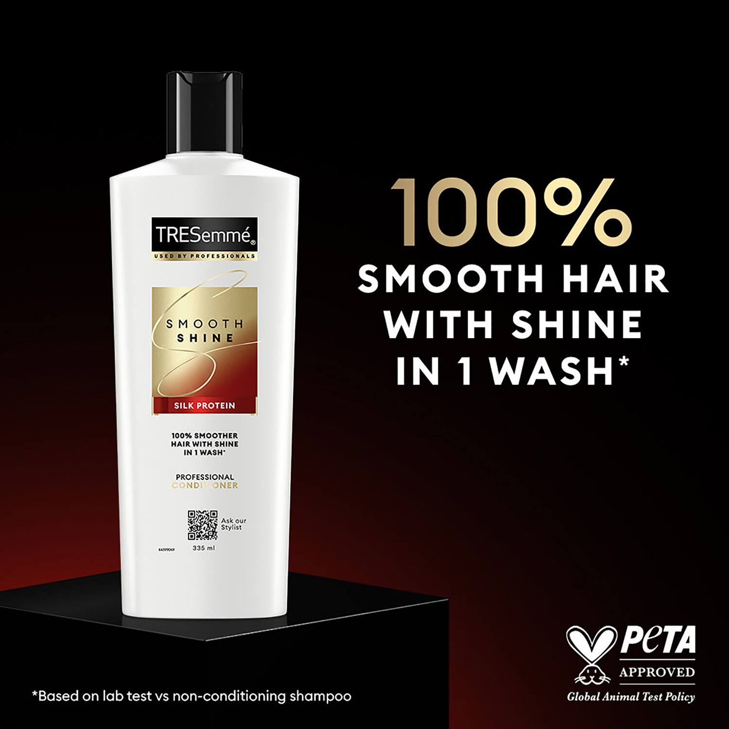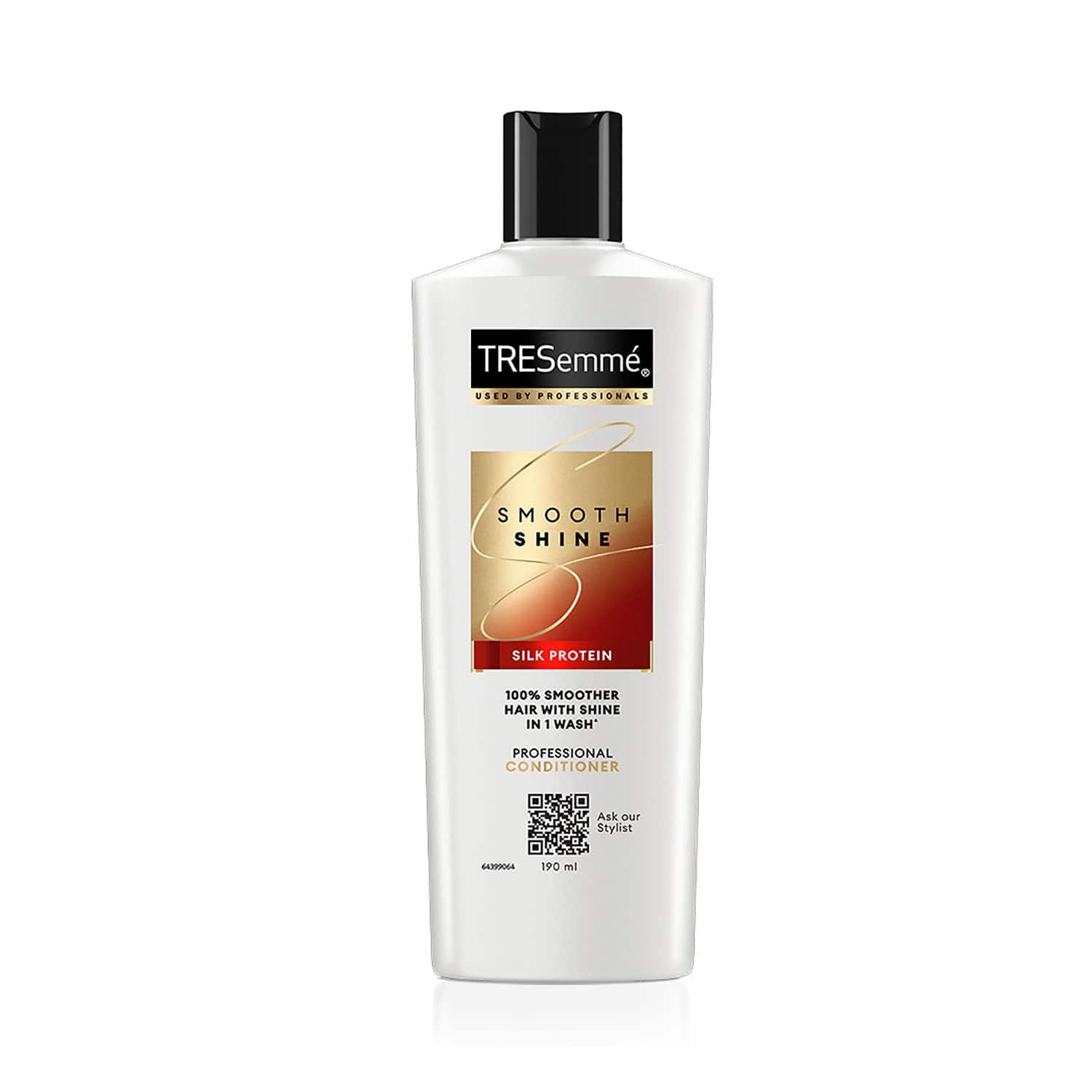 The Tresemme Smooth & Shine Conditioner - (190ml) gives you salon-smooth hair at home in just minutes. This moisturising conditioner provides intense conditioning for silky and smooth hair. Enriched with vitamin H and silk protein, this conditioner nourishes your hair and improves its texture and health.Key Features & Benefits:Infused with vitamin H and silk protein to improve texture and health of hairMoisturising conditioner offers silky and smooth hairNourishing conditioner softens each strandHydrating conditioner repairs damaged hairKey Ingredients:Vitamin H and silk protein: Moisturise hair and improve its texture and healthHow to Use:Starting with Shampoo, followed by conditioner, apply an adequate amount of it to wet hair from mid-lengths to ends. Leave it for 2-3 minutes and rinse it with lukewarm water.All Ingredients:Water, Cetearyl Alcohol, Dimethicone And Amodimethicone And Peg-7 Propylheptyl Ether And Cetrimonium Chloride, Behentrimonium Chloride, Perfume, Stearamidopropyl Dimethylamine, Sodium Chloride, Lactic Acid, Disodium Edta, Lysine Hydrochloride, Urea, Disodium Phosphate, Biotin & Citric Acid, Hydrolyzed Silk, Panthenol, Argania Spinosa Kernel (Argan) Oil, Methylchloroisothiazolinone And Methylisothiazolinone, Linalool, Benzyl Salicylate, Citronellol, Alpha-Isomethyl Ionone, Hexyl CinnamalAbout the Brand:Founded by Edna L. Emme in the year 1948, TRESemme is dedicated to creating hair care and styling products that are salon quality without the salon price. The brand promotes the values of independence, self-reliance, and most importantly, the confidence every woman needs to step up and meet the next challenge. TRESemme believes that every woman deserves to look and feel fabulous like they've just stepped out of the salon. All their products use the latest technology to help you create stunning hairstyles and experience that salon feeling every day.Check out more Tresemme Conditioner options here, or browse through tokocart's full range of Conditioner from top global brands.You can also explore other products from the world of Tresemme here on tokocart.