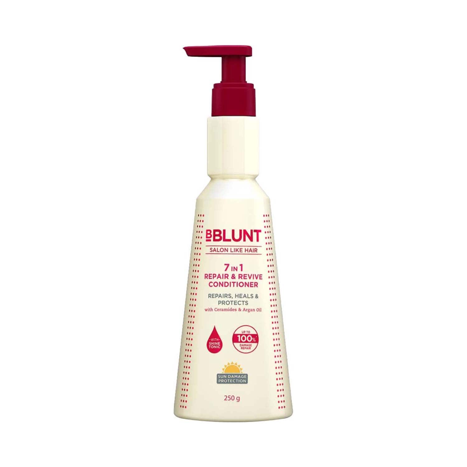 Use the BBlunt 7 in 1 Repair & Revive Conditioner (250 g) to make every hair flip fabulous. This nourishing conditioner softens the hair to make it more manageable and repairs up to 100% of damage. Formulated with ceramides and argan oil, this BBlunt hair conditioner fights 7 signs of hair concerns like dryness, breakage, split ends, frizz, dullness, thinning, and sun damage. Plus, it maintains the hair structure to make it strong and healthy.