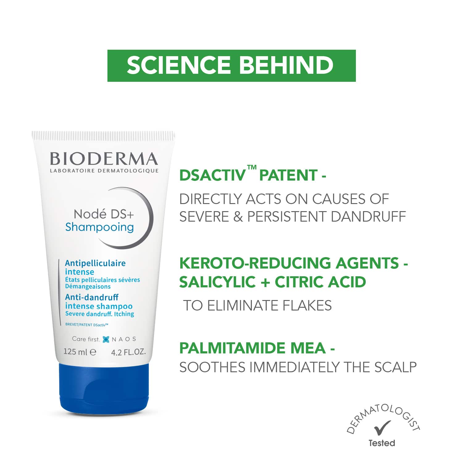 Take control of your dandruff with the Bioderma Node Ds+ Shampooing Anti Dandruff Intense Shampoo (125ml). It is a powerful and effective oil-controlling shampoo that tackles the causes of persistent, severe dandruff. Also, this moisturizing shampoo has a DS active complex to limit the proliferation of Malassezia yeasts responsible for dandruff and prevents recurrences by minimizing sebum secretion. Meanwhile, kerato-regulating agents in this Bioderma anti-dandruff shampoo soothe itchy scalps, and the D.A.F natural complex increases the tolerance threshold of sensitized scalps.Key Features & Benefits:Has kerato-regulating agents to clear severe dandruffAdded DS active complex limits the accumulation of Malassezia yeastsPrevents recurrences of dandruff by minimizing sebum secretionProvides freshness and light fragrance to your hairAll Ingredients:Aqua/Water/Eau, Sodium Laureth Sulfate, Sodium Cocoamphoacetate, Peg-60 Almond Glycerides, Sodium Lauroyl Sarcosinate, Juniperus Oxycedrus Wood Extract, Coco Betaine, Peg-90 Glyceryl Isostearate, Peg-12 Dimethicone, Sodium Shale Oil Sulfonate, Salicylic Acid, Piroctone Olamine, Zinc Pyrithione, Mannitol, Xylitol, Rhamnose, Fructooligosaccharides, Laminaria Ochroleuca Extract, Acrylates/C10-30 Alkyl Acrylate Crosspolymer, Pyridoxine Hcl, Undecyl Alcohol, Zinc Gluconate, Polyquaternium-10, Zanthoxylum Bungeanum Fruit Extract, Laureth-2, Caprylic/Capric Triglyceride, Oleyl Alcohol, Sodium Polynaphthalenesulfonate, Sodium Acetate, Isopropyl Alcohol, Sodium Chloride, Disodium Edta, Sodium Hydroxide, Phenoxyethanol, Fragrance (Parfum). [Bi 547]How to Use:First, wet your hair thoroughly. Then, squeeze the required amount of shampoo on your palm and create a lather by rubbing your hands together. Next, apply the lathered shampoo on your scalp generously. Last, rinse your hair with water and follow by using a conditioner.About the Brand:Founded in the year 1977 by Jean-Noël Thorel, a French pharmacist, BIODERMA is a NAOS brand that has been serving skin and hair care products for 40 years. Their mission is to create superior quality, highly effective, and dermatologically approved products to cater to all skin types. The brand is committed to making dermatology accessible to the broadest possible public and providing solutions that truly respect the skin and are easy to use regularly. Their products range from body wash, face wash, cleansing bars, sunscreens, and non-fragranced lotions, to nourishing shampoos. All of their products are made from the purest active ingredients and use molecules naturally present in the skin or that act as such to ensure safety and high tolerance.Check out more Bioderma Shampoo options here, or browse through tokocart's full range of Shampoo from top global brands.You can also explore other products from the world of Bioderma here on tokocart.