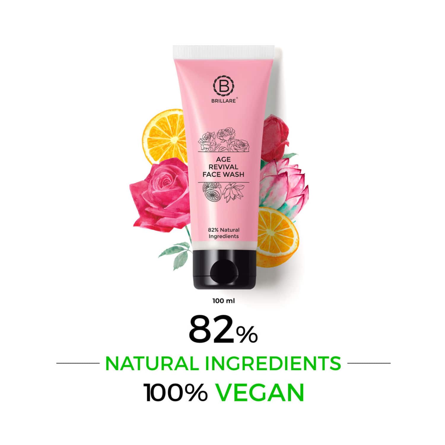 Bring back youthful skin with the Brillare Age Revival Face Wash For Ageing Skin. This energising face cleanser has natural actives that help tone and tighten the skin while reducing signs of ageing, for instance, fine lines and wrinkles. The anti-ageing, hydrating face wash is formulated with conscious efforts and deeply cleanses the skin to reveal a fresh, radiant complexion every day.Key Features & Benefits:Gentle cleansing formula cleans well without drying out the skinUnique ingredients provide anti-ageing benefits for firmer, tighter-looking skinEnergising face wash revitalises dull skin and provides hydrationNatural nourishing cleanser has no side effects100% vegan and free from harmful chemicalsKey Ingredients:Alpine Rose: Moisturises, improves elasticity and reduces rednessLotus: Relaxes the skin and delays signs of ageingTree Fern: Moisturises and reduces wrinkles and fine linesAll Ingredients:Aqua, Sodium Lauryl Ether Sulfate, Cocoamidopropyl Betaine, Acrylates Crosspolymer-4, Glycerin, Vaccinium Myrtillus Fruit/Leaf Extract, Saccharum Officinarum (Sugar Cane) ExtractHow to Use:Take an adequate amount of the face wash in your palms and apply it to your wet face. Massage gently to let it foam and rinse it off.About the Brand:Brillare was founded in the year 2009. Since then, it has been offering a wide range of personal care products that cater to the need of thousands of customers. The brand's motto has always been to formulate natural and vegan products for safe usage. Their chemical-free skin and hair care products are formulated to suit all skin types for solving the hair and skin problems of every consumer.