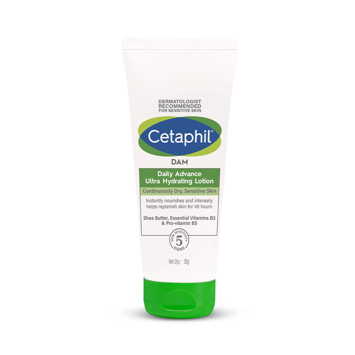 For soft and plump skin, pick a bottle of the Cetaphil Daily Advance Ultra Hydrating Lotion (30g). This nourishing body lotion contains panthenol, glycerin, and niacinamide to improve the resilience of sensitive skin. Also, this Cetaphil body lotion is infused with nine moisturizers, including shea butter, to replenish and restore dry skin for 48 hours. Plus, this hydrating body lotion prevents skin irritation, roughness, tightness, and dryness.Key Features & Benefits:Formulated with moisturizing ingredients like shea butter to provide optimal hydrationInfused with niacinamide, panthenol, and glycerin to improve sensitive skin's resilienceNourishes and replenishes dry skin for 48 hoursDermatologically tested lotion is safe to use even on sensitive skinKey Ingredients:Niacinamide, panthenol, and glycerin: Improve the resilience of sensitive skinShea butter: Moisturizes the skinAll Ingredients:Aqua, Glycerin, Hydrogenated Polyisobutene, Cetearyl Alcohol & Ceteareth - 20, Butyrospermum Parkii Butter (Shea Butter), Macadamia Integrifolia Seed Oil (Macadamia Nut Oil), Cyclopentasiloxane, Tocopheryl Acetate, Sodium Pca, Phenoxyethanol, Benzyl Alcohol, Cyclopentasiloxane And Dimethiconol, Sodium Polyacrylate, Panthenol, Stearoxytrimethylsilane, Stearyl Alcohol, Acrylates/C10-30 Alkyl Acrylate Crosspolymer, Trimethyl Dodecatrienol, Citric Acid, Sodium HydroxideHow to Use:Wash your skin. Take a bit of the lotion and put it on your skin. After that, massage well for increased hydration. Apply twice daily for the best results.About the Brand:Established in 1947, Cetaphil is a skincare brand of Galderma Laboratories, L.P., that offers a line of dermatologist-recommended products specially formulated for all skin types and conditions. The essence of Cetaphil lies in its name. The combination of the suffix ‘-phil’ meaning ‘love’ and ‘Cet’ from the hydrating agent cetearyl alcohol, together means the love of moisturizing and soothing skin. Cetaphil offers a wide range of products, including face and body moisturizers, cleansers, baby care, sunscreens, products for common skin issues, and lots more. They are committed to providing their consumers with effective yet gentle skincare formulas that strengthen and protect even the most sensitive skin. They understand that great skincare leads to beautiful, healthy, and glowing skin and that healthy skin is integral to leading a healthy life.Check out more Cetaphil Lotions & Cream options here, or browse through tokocart's full range of Lotions & Cream from top global brands.You can also explore other products from the world of Cetaphil here on tokocart.