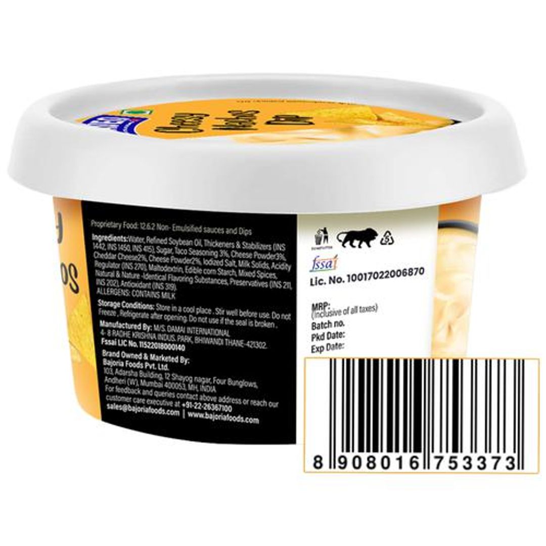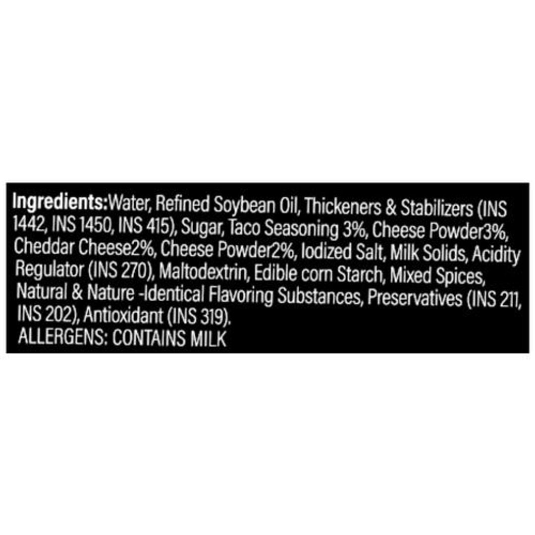 Water, Refined Soyabean Oil, Thickness & Stabilizer, Cheddar Cheese, Cheese Powder, Sugar, Salt, Taco Seasoning, Edible Corn Starch