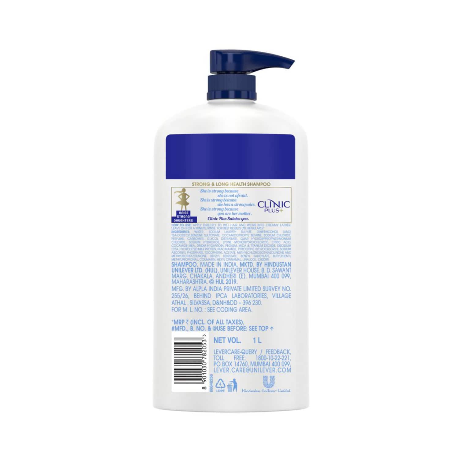 Give your locks the care they deserve with the Clinic Plus Strong & Long Health Shampoo (1000ml). Made with milk protein and multivitamins, this conditioning shampoo will leave your hair feeling soft and shiny while also protecting it against damage. This Clinic Plus shampoo is a hydrating shampoo that cleanses and nourishes your hair from root to tip.Key Features & Benefits:Contains milk protein and multivitamins for a fuller and thicker hair lookFormulated to nourish your hair from the root to the tipStrengthens the hair to prevent damageGently cleanses to remove impurities and oil buildupKey Ingredients:Milk protein and multivitamins: Nourish the hairAll Ingredients:Water, Sodium Laureth Sulfate, Dimethiconol (And) Tea-Dodecylbenzene Sulfonate, Cocamidopropyl Betaine, Sodium Chloride, Perfume, Carbomer, Glycol Distearate, Guar Hydroxypropyltrimonium Chloride, Sodium Hydroxide, Lysine Monohydrochloride, Citric Acid, Cocamide Mea, Dmdm Hydantoin, Peg45M, Mica & Titanium Dioxide, Disodium Edta, Hydrolyzed Milk Protein, Niacinamide, Pyridoxine Hydrochloride, Sodium Ascorbyl Phosphate, Tocopheryl Acetate, Methylchloroisothiazolinone And Methylisothiazolinone, Benzyl Benzoate, Benzyl Salicylate, Butylphenyl Methylpropional, Coumarin, Hexyl Cinnamal, Linalool, Ci42090.How to Use:Wet your hair and scalp with water. Pour a small amount of shampoo into your hands and rub them together to create a lather. Massage the shampoo onto your scalp, using circular motions, and then work it through the length of your hair. Rinse thoroughly with water.About the Brand:Founded in the year 1987, Clinic Plus is a hair care brand headed by Hindustan Unilever. Backed by cutting-edge research, the brand develops unique hair care solutions to nourish the hair, strengthen it, and promote hair growth. Their range of products includes hair oil, shampoo, conditioner, and much more. Clinic Plus offers high-quality products at affordable price points and is also available in Sri Lanka, Pakistan, Indonesia, Vietnam, and the Philippines.Check out more Clinic Plus Shampoo options here, or browse through tokocart's full range of Shampoo from top global brands.You can also explore other products from the world of Clinic Plus here on tokocart.