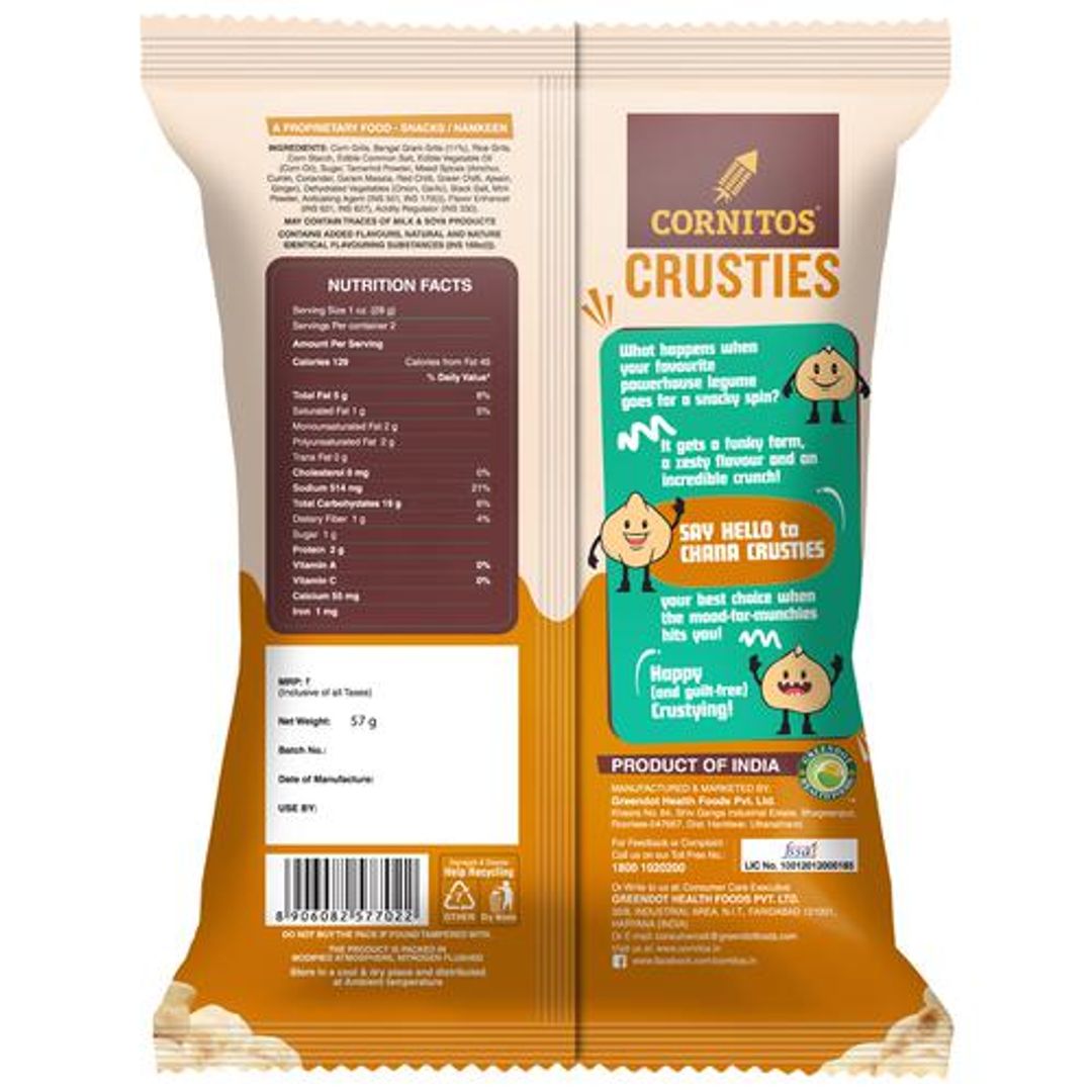 When you are in the mood for some munching, but also looking for a healthy option, you can’t go wrong with Cornitos Crusties Chana Snacks. The funky zigzag shape and the zesty Dilli Chaat flavour add a snacky spin to chana, the popular powerhouse legume. Savoury and crunchy, the Chana Snacks are baked, not fried, with a great mix of spices and herbs, and are just right for happy and guilt-free crusting, any time of the day! Made of Chana, the traditionally loved protein-rich healthy legume, this is a 100% vegetarian snack.