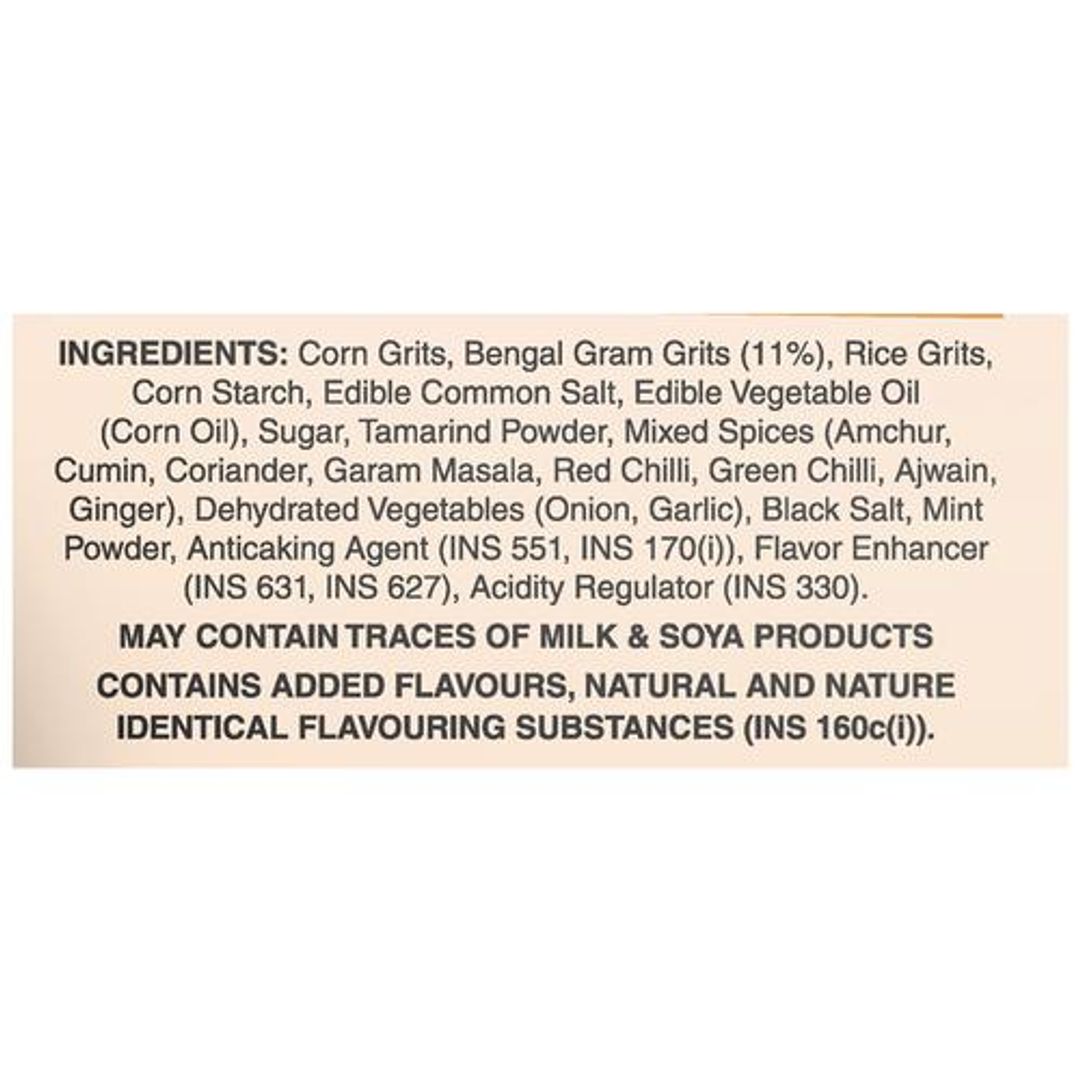 Corn Grits, Bengal Gram Grits, Rice Grits, Corn Starch, Edible Common Salt, Edible Vegetable Oil (Corn Oil), Chickpea Grits (1.5%), Sugar, Tamarind Powder, Mixed Spices (Amchur, Cumin, Coriander, Garam Masala, Red Chilli, Green Chilli, Ajwain, Ginger), Dehydrated Vegetables (Onion, Garlic), Black Salt, Mint Powder, Anticaking Agent (Ins 551, Ins 170(I)), Flavour Enhancer (Ins 631, Ins 627), Acidity Regulator (Ins 330). May Contain Traces Of Milk & Soya Products Contains Added Flavours, Natural And Nature Identical Flavouring Substances (Ins 160c(I)).