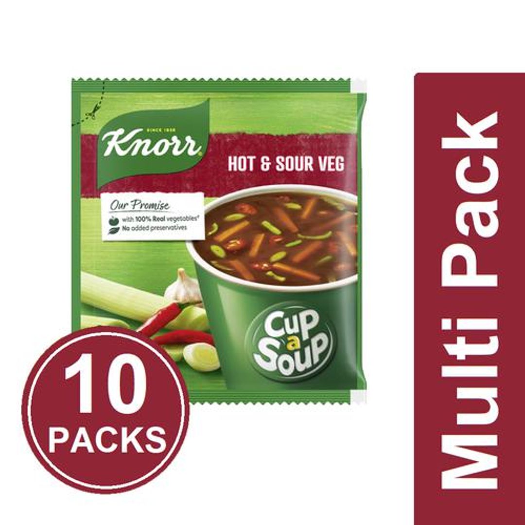 Knorr Hot & Sour Veg Cup-A-Soup is a little hot, a little sour - adds a Chinese zing every time you sip the Knorr Hot & Sour Veg Cup-A-Soup. Knorr Hot & Sour Veg Cup-A-Soup satisfies your small hunger pangs in just 1 minute. Its crunchy, delicious and easy to make every time. Made with 100% real vegetables and no added preservatives, this soup is ready in three simple steps. So now enjoy Restaurant like delicious Soup at home. Knorr Soups range comprises 11 delicious flavours of 4 serve soups and 7 flavours of Cup-a-soup. Great taste is in our Nature! Knorr has gone to great lengths to ensure a perfect blend of Ingredients and consistency that give you Restaurant Soup at home.