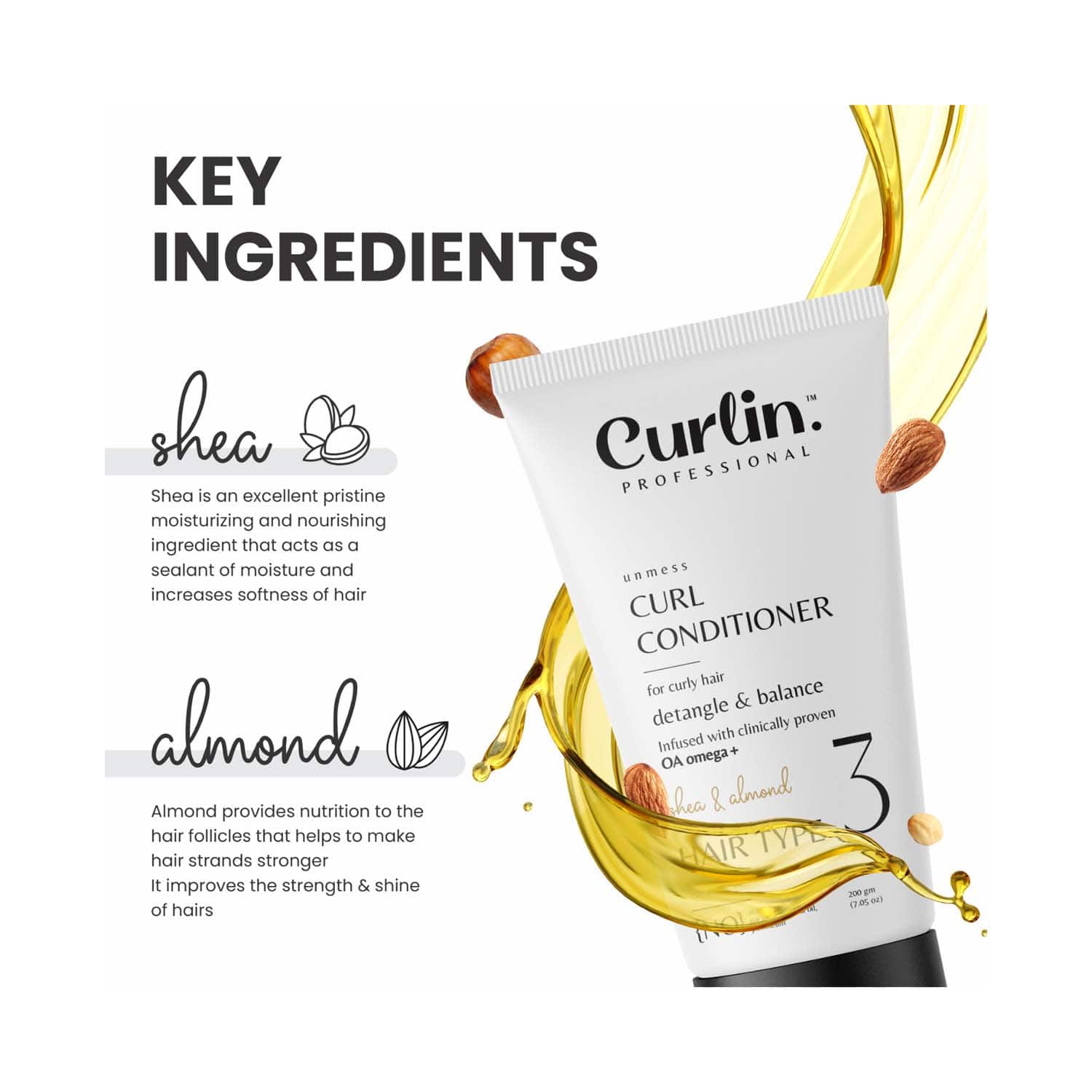 Add volume and bounce to your curls with the Curlin Professional Moisturizing Curly Hair Conditioner (200 g). This softening hair conditioner is formulated with shea butter and coconut extracts that add a soft sheen to your hair while keeping it healthy and nourished. The Curlin Professional hair conditioner detangles curly hair and reduces frizz for manageable curls. Enriched with oa omega+, this damaged hair conditioner repairs and restores the hair's vitality. Key Features & Benefits:Enriched with oa omega+ containing omega 3, 6, and 9 oils for hair nourishment and repairInfused with shea butter that softens and deeply hydrates the hairContains coconut extracts that nourish and add vitality to the hairAlmond extracts nourish and moisturize curly hair Key Ingredients:Oa omega+: Contains essential omega fatty acids for hair nourishmentShea butter: Softens the hairCoconut extract: Keeps hair healthyAlmond extracts: Moisturize and repair hairOlive oil: Makes hair manageable All Ingredients:Oa Omega+, Shea Butter, Almond How to Use:Shampoo your hair. Take an adequate amount of the conditioner and apply it to your hair, massaging it into its lengths and ends. Leave it in for a few minutes, then rinse it off thoroughly. Repeat the process if required. About the Brand:Founded by Sumit Karanji, Curlin Professional is a hair care brand offering products specially developed for curly hair. Their product line includes shampoos, conditioners, hair masks, combo, and more. The brand aims to simplify hair care for curly heads with its easy-to-use and affordable products. Each product of Curlin Professional is developed after meticulous research and features clinically proven ingredients that are safe and effective for use on curly hair.