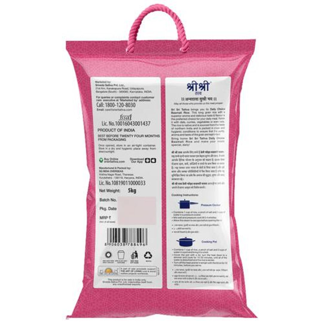 Sri Sri Tattva is committed to bringing you the quality of food that you deserve. Our products are sourced from certified organic farms and are cleaned and packed in the most hygienic conditions in food-grade packaging. Bring home Sri Sri Tattva for a healthy life with this Daily Choice Basmati Rice. "Shuddhata Ka Naam", are long grain rice of top-most quality. Your daily choice of basmati rice, you can inculcate it in your everyday rice and have a great taste of it. Giving out a good aroma when cooked, this quality rice is here as a keeper on your kitchen shelf.