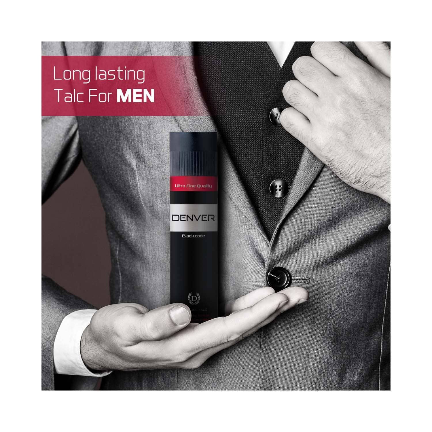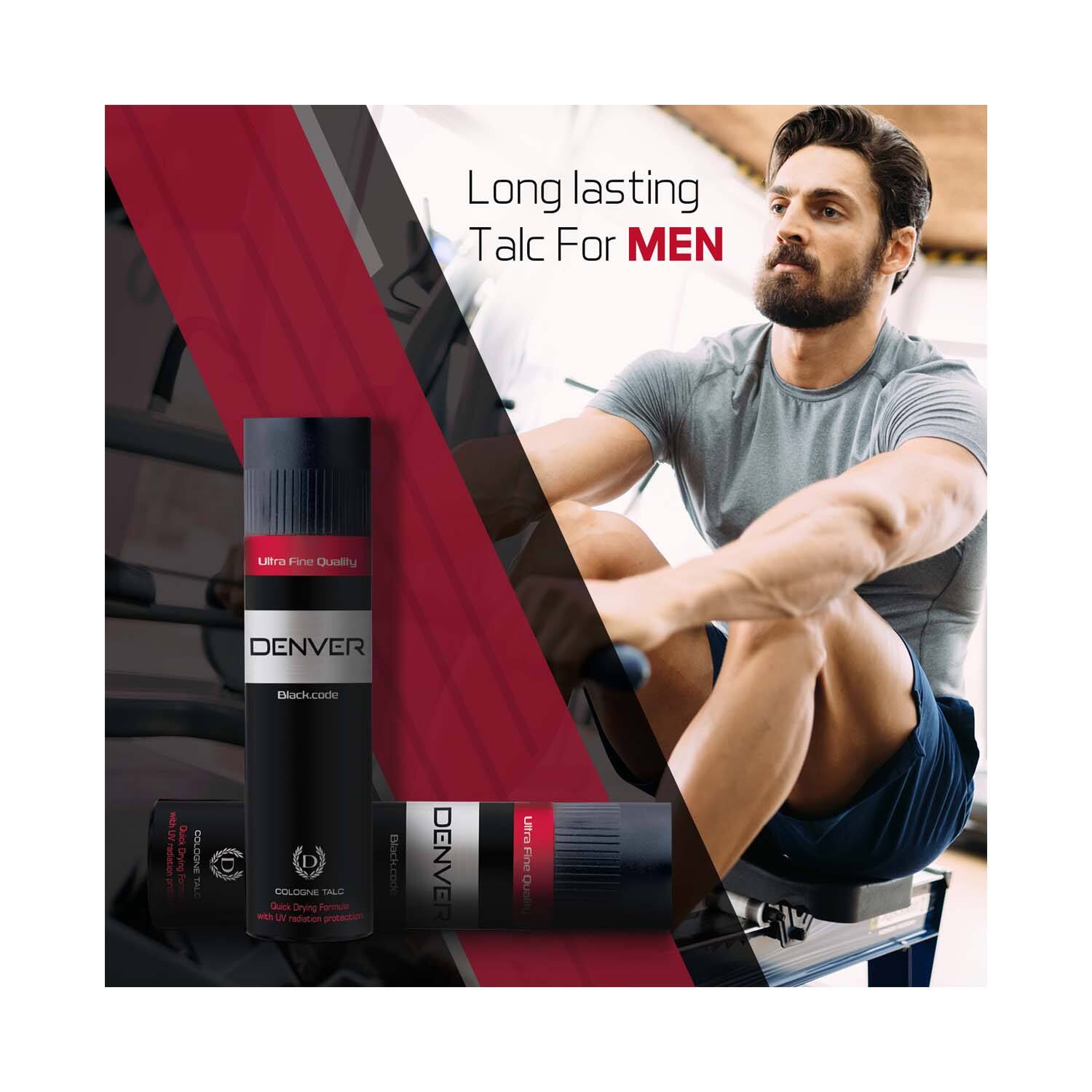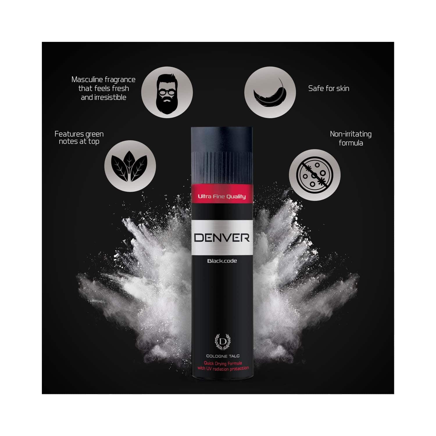 Upgrade your grooming routine with the Denver Black Code Talc (300g). This refreshing talcum powder features a blend of fresh green notes and a woody accord for a masculine fragrance. As a long-lasting talcum powder, it controls moisture, oil, and odor, ensuring you stay odor-free and fresh throughout the day. With its smooth formula, this Denver men's talcum powder is easy to spread and safe for daily use.