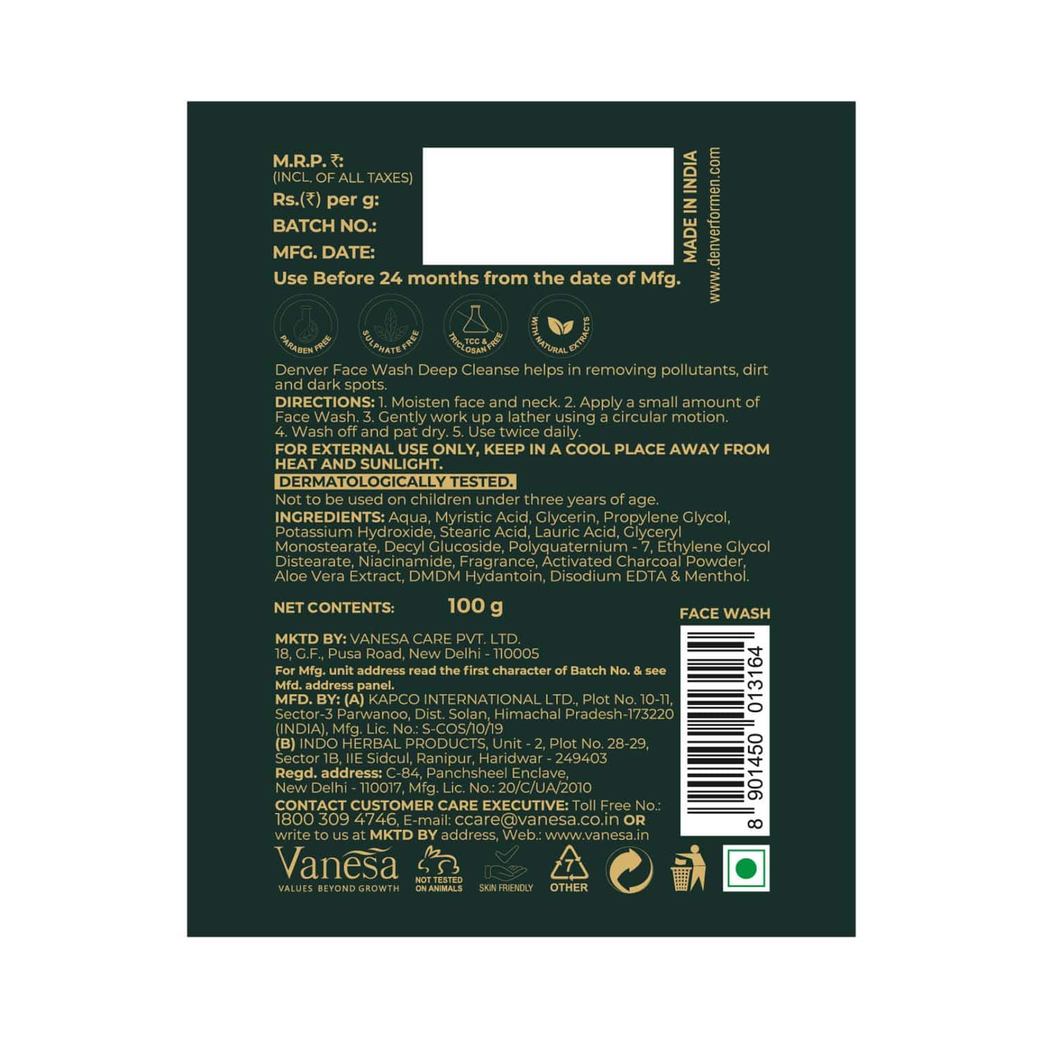 About the Brand:Denver by Vanesa Care is India's leading deodorant brand. A clear leader in fragrance products, Denver is driven by a relentless focus on providing customers with trust and superior products. Denver's products line includes deodorants, perfumes, shaving products, facial cleansers, hair care products, and talc. Denver embraces moderns who crave success in life. The brand consists of everything from body to skincare products. They are committed to making grooming a hassle-free and enjoyable experience to look good and feel good.