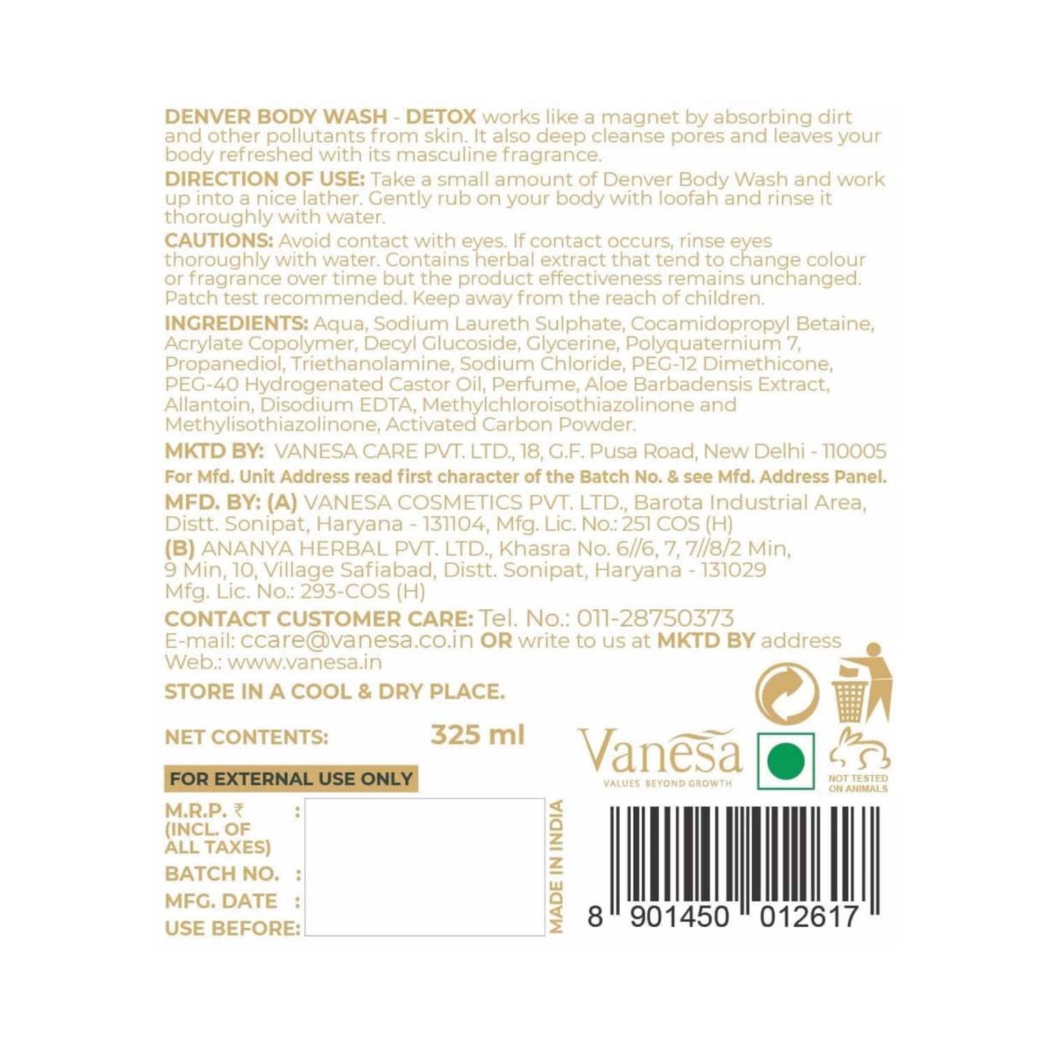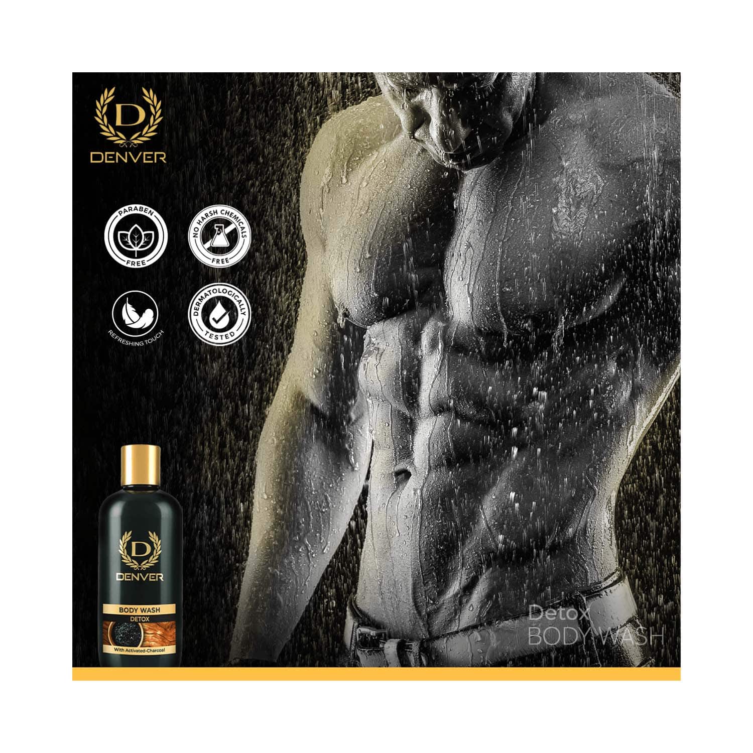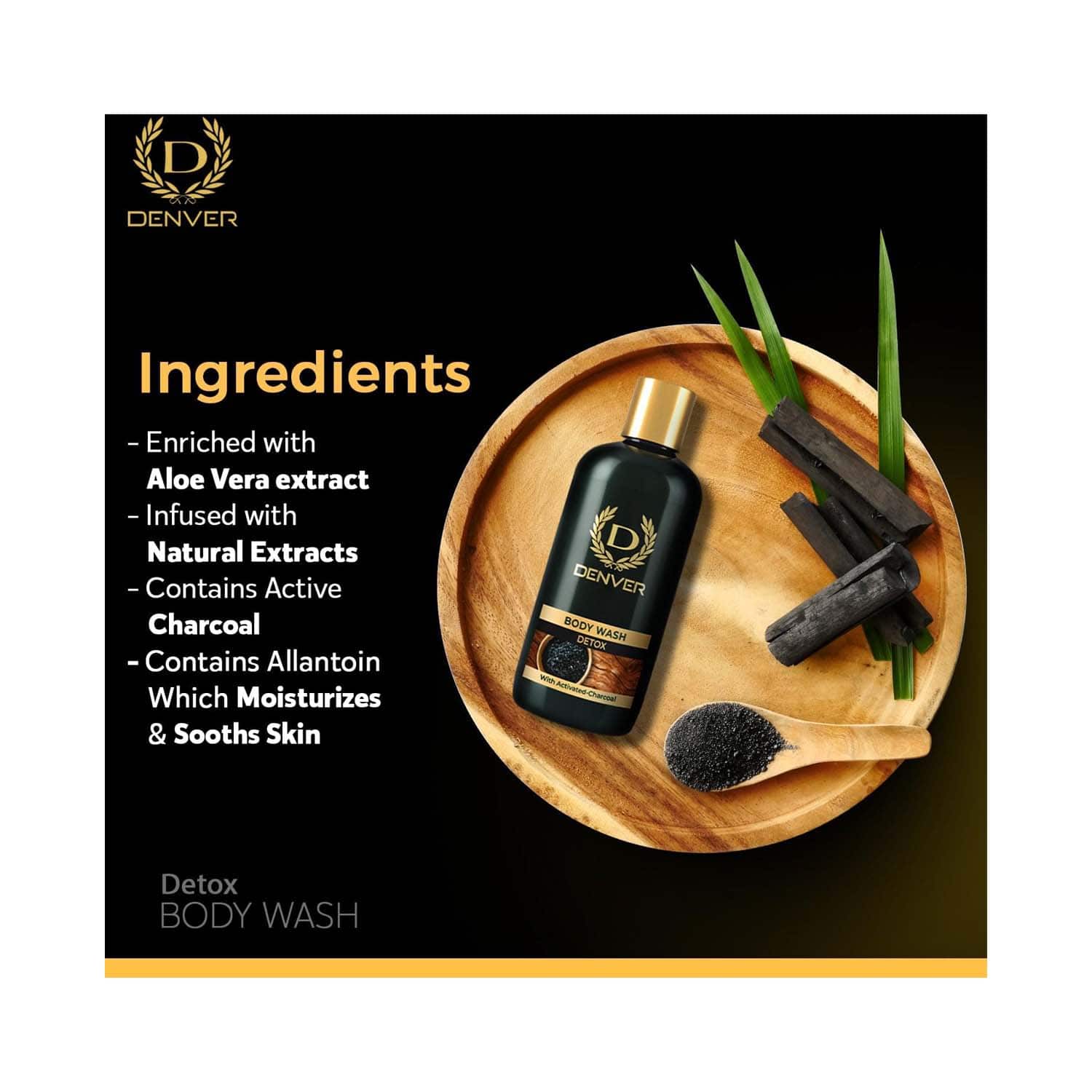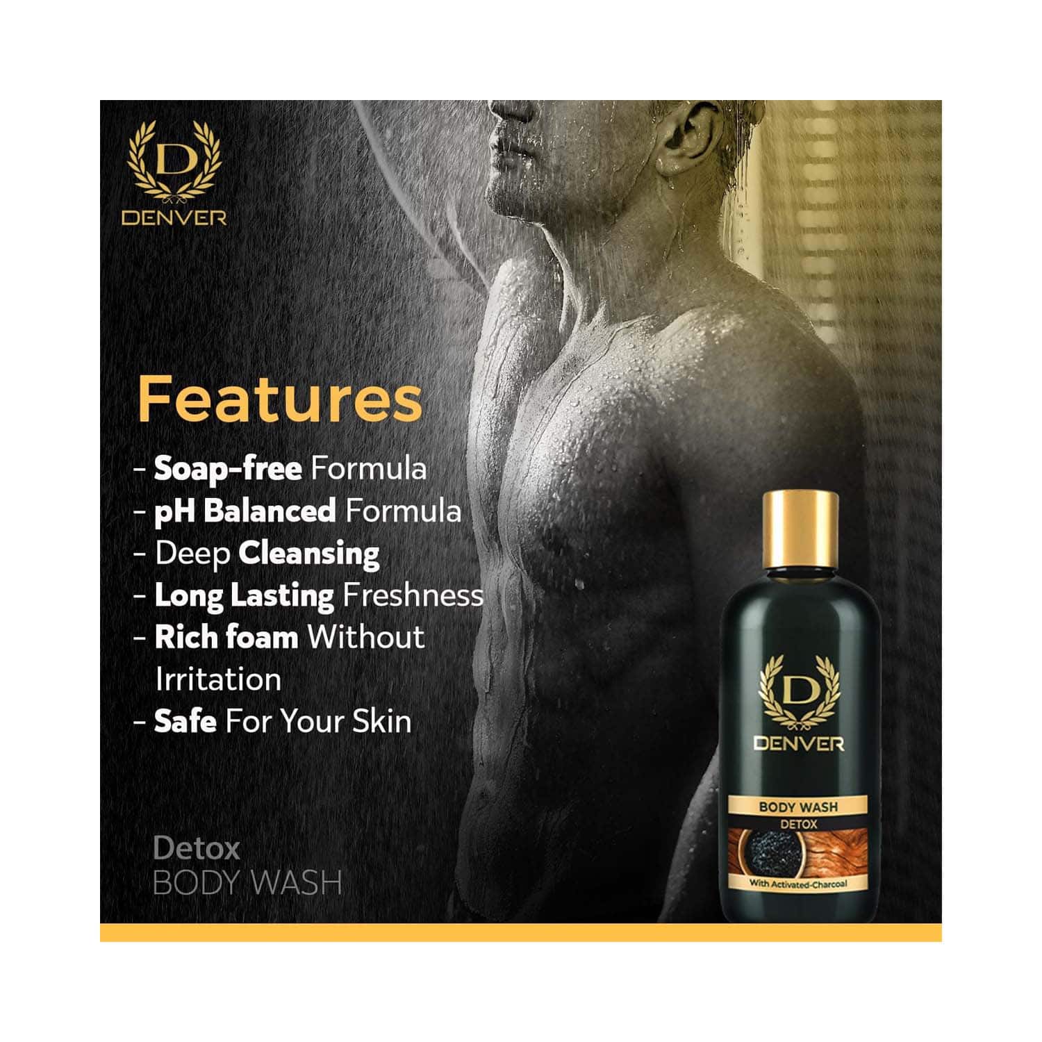 For freshness that lasts throughout the day, use the Denver Detox Body Wash (325ml). Loaded with activated charcoal, this men's body wash works like a magnet to absorb dirt, oil, and other pollutants from deep within the pores and leaves the skin squeaky clean. Also, this Denver body wash exudes a masculine fragrance that energizes the senses and uplifts the mood. Plus, it has aloe vera and allantoin to moisturize and soothe the skin. Key Features & Benefits:Formulated activated charcoal to detoxify the skin and remove dirt, oil, and pollutantsFeatures a strong, energizing, and masculine fragrance to refresh the sensesEnriched with aloe vera extract and allantoin to moisturize and soothe the skinSoap-free, pH-balanced, and dermatologically-tested formula ensures safe use on all skin types Key Ingredients:Activated charcoal: Detoxifies the skin and removes dirt, oil, and other pollutantsAloe vera extract: Hydrates and soothes the skinAllantoin: Moisturizes and soothes the skin All Ingredients:Aqua, Sodium Laureth Sulfate, Cocamidopropyl Betaine, Acrylate Copolymer, Decyl Glucoside, Glycerin, Polyquaternium 7, Propanediol, Triethanolamine, Sodium Chloride, Peg-12 Dimethicone, Peg-40 Hydrogenated Castor Oil, Perfume, Aloe Barbadensis Extract, Allantoin, Disodium Edta, Methylchloroisothiazolinone And Methylisothiazolinone, Activated Carbon Powder. How to Use:To start, pour the body wash on a wet loofah. After that, squeeze the loofah to create a lather and massage it on your damp skin. Then, rinse off the lather with water and towel dry your body to get soft and fragrant skin. About the Brand:Denver by Vanesa Care is India's leading deodorant brand. A clear leader in fragrance products, Denver is driven by a relentless focus on providing customers with trust and superior products. Denver's products line includes deodorants, perfumes, shaving products, facial cleansers, hair care products, and talc. Denver embraces moderns who crave success in life. The brand consists of everything from body to skincare products. They are committed to making grooming a hassle-free and enjoyable experience to look good and feel good.Check out more Denver Shower Gels & Body Wash options here, or browse through tokocart's full range of Shower Gels & Body Wash from top global brands.You can also explore other products from the world of Denver here on tokocart.