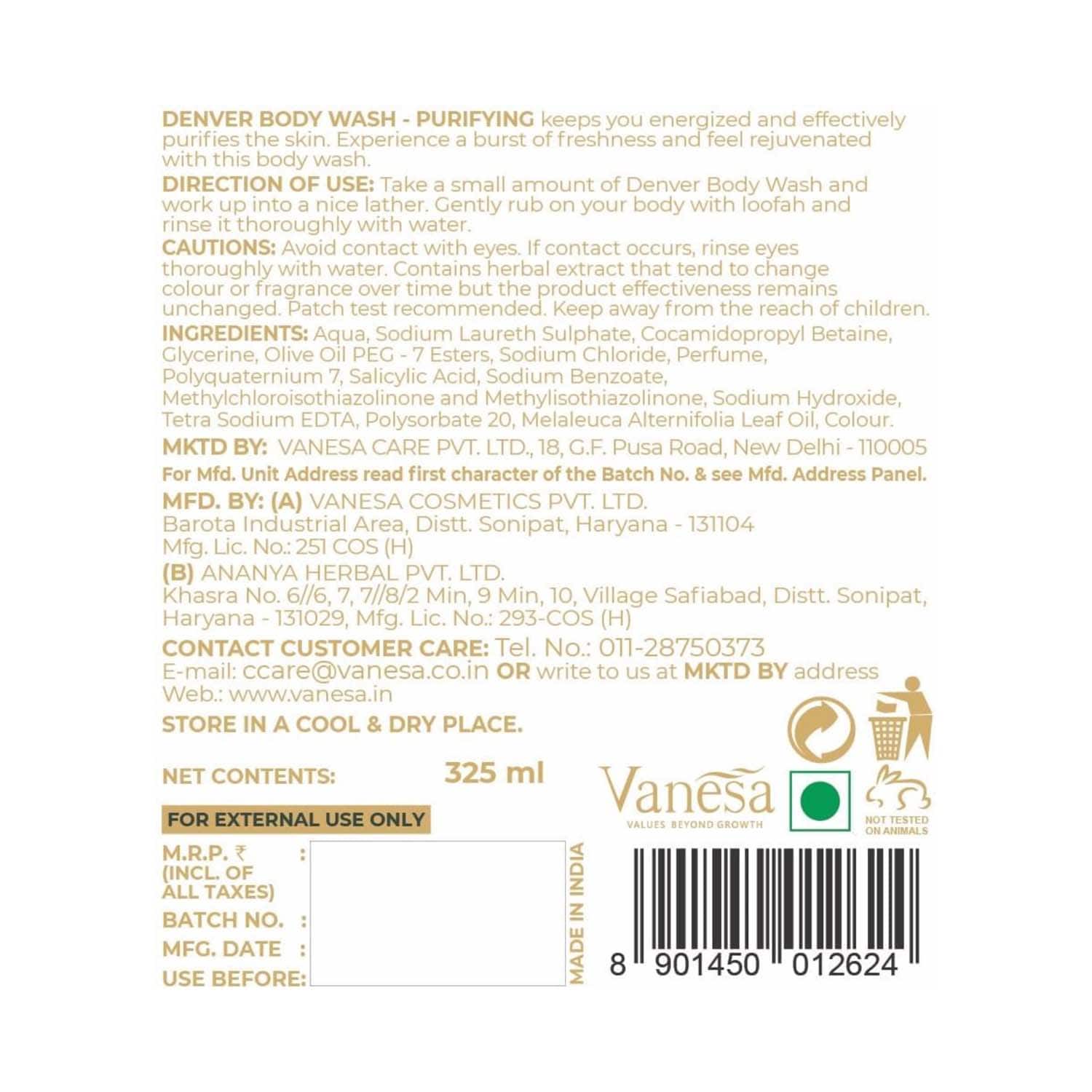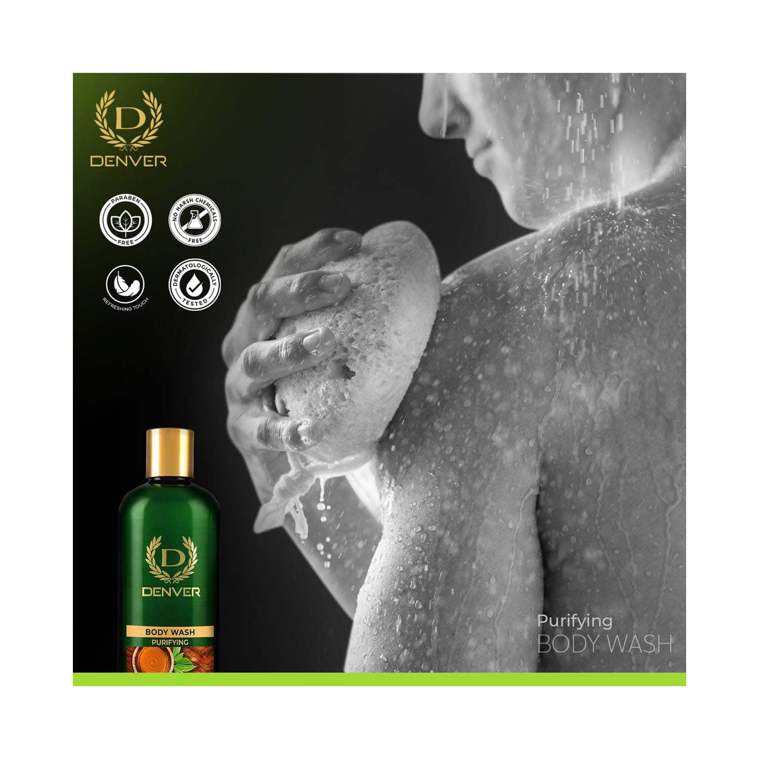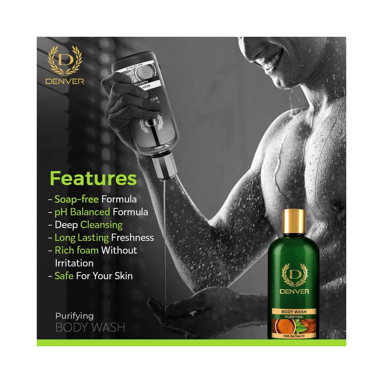 Escape to a world of pure freshness with the Denver Purifying Body Wash (325ml). Infused with tea tree leaf oil, this refreshing body wash effectively purifies the skin and cleanses away dirt, oil, and other pollutants leaving it invigorated. Also, this Denver body wash rejuvenates the senses with its captivating fragrance and keeps the skin energized and lightly scented. Key Features & Benefits:Enriched with tea tree oil to purify the skin and remove dirt, oil, and pollutantsProduces a rich foam to cleanse without any irritationFeatures an energizing fragrance to invigorate the sensesSoap-free, pH-balanced, and dermatologically-tested formula ensures safe use on all skin types Key Ingredients:Tea tree oil: Purifies the skin All Ingredients:Aqua, Sodium Laureth Sulfate, Cocamidopropyl Betaine, Glycerin, Olive Oil Peg-7 Esters, Sodium Chloride, Perfume, Polyquaternium 7, Salicylic Acid, Sodium Benzoate, Methylchloroisothiazolinone And Methylisothiazolinone, Sodium Hydroxide, Tetrasodium Edta, Polysorbate 20, Melaleuca Alternifolia Leaf Oil, Color. How to Use:To start, pour the body wash on a wet loofah. After that, squeeze the loofah to create a lather and massage it on your damp skin. Then, rinse off the lather with water and towel dry your body to get soft and fragrant skin. About the Brand:Denver by Vanesa Care is India's leading deodorant brand. A clear leader in fragrance products, Denver is driven by a relentless focus on providing customers with trust and superior products. Denver's products line includes deodorants, perfumes, shaving products, facial cleansers, hair care products, and talc. Denver embraces moderns who crave success in life. The brand consists of everything from body to skincare products. They are committed to making grooming a hassle-free and enjoyable experience to look good and feel good.Check out more Denver Shower Gels & Body Wash options here, or browse through tokocart's full range of Shower Gels & Body Wash from top global brands.You can also explore other products from the world of Denver here on tokocart.