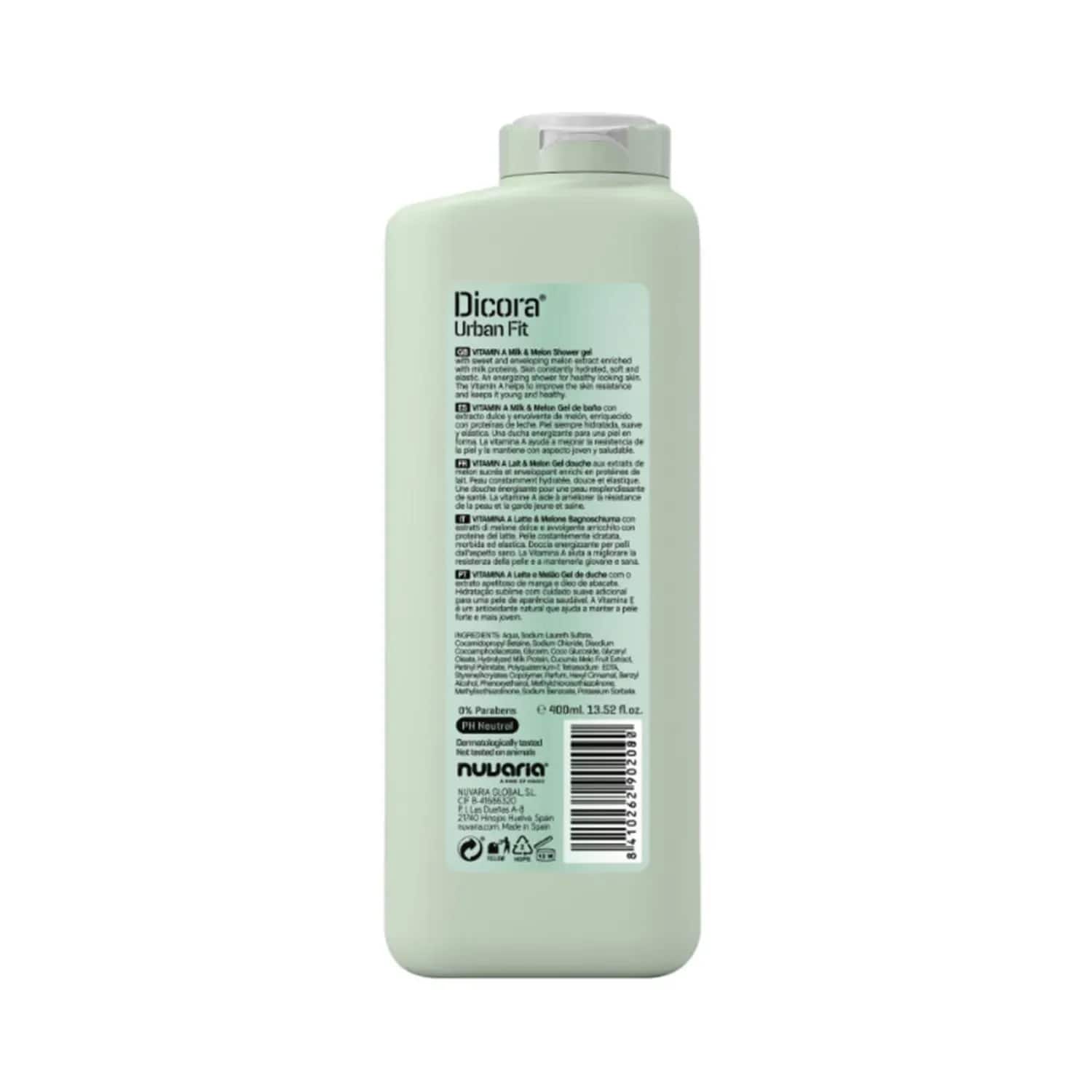 Say hello to velvety soft skin with the Dicora Urban Fit Vitamin A Milk & Melon Shower Gel - (400ml). This nourishing shower gel contains melon extract and milk proteins to gently cleanse and condition the skin. It is also enriched with vitamin A to enhance the skin's resistance and promote youthful, healthy skin. The refreshing shower gel gives out a pleasant scent of cantaloupe to soothe the senses.Key Features & Benefits:Enriched with melon extract and milk proteins to provide intense hydrationVitamin A body wash improves the skin's resistance and promotes youthful, healthy skinExudes a rich fragrance of cantaloupe to refresh the sensesFormulated to suit all skin typesKey Ingredients:Melon extract and milk proteins: Hydrate the skinVitamin A: Improves the skin's resistance and promotes youthful, healthy skinCantaloupe: Exudes a refreshing fragrance to soothe the sensesHow to Use:Apply a small quantity of shower gel to your damp skin. Massage gently and work up a lather. Then, rinse off with water.All Ingredients:Aqua, Sodium Laureth Sulfate, Cocamidopropyl, Betaine, Sodium Chloride, Disodium Cocoamphodiacetate, Glycerin, Coco Glucoside, Glyceryl Oleate, Hydrolyzed Milk Protein, Cucumis Melo Fruit Extract, Retinyl Palmitate, Polyquaternium-7, Tetrasodium Edta, Styrene/Acryaltes Copolymer, Parfum, Hexyl Cinnamal, Benzyl Alcohol, Phenoxyethanmol, Methylchloroisothiazolinone, Methylisothiazolinone, Sodium Benzoate, Potassium Sorbate.About the Brand:Dicora Urban Fit specialises in producing premium bath and body products that cater to all skin types. Their products include shower gels, hand soaps, hair products, body lotions, and much more. Dicora Urban Fit products are cruelty-free and are not tested on animals. Plus, they are dermatologically tested and free from parabens, silicones, and colours for safe and gentle use.Check out more Dicora Urban Fit Body Wash & Shower Gel options here, or browse through tokocart's full range of Body Wash & Shower Gel from top global brands.You can also explore other products from the world of Dicora Urban Fit here on tokocart.