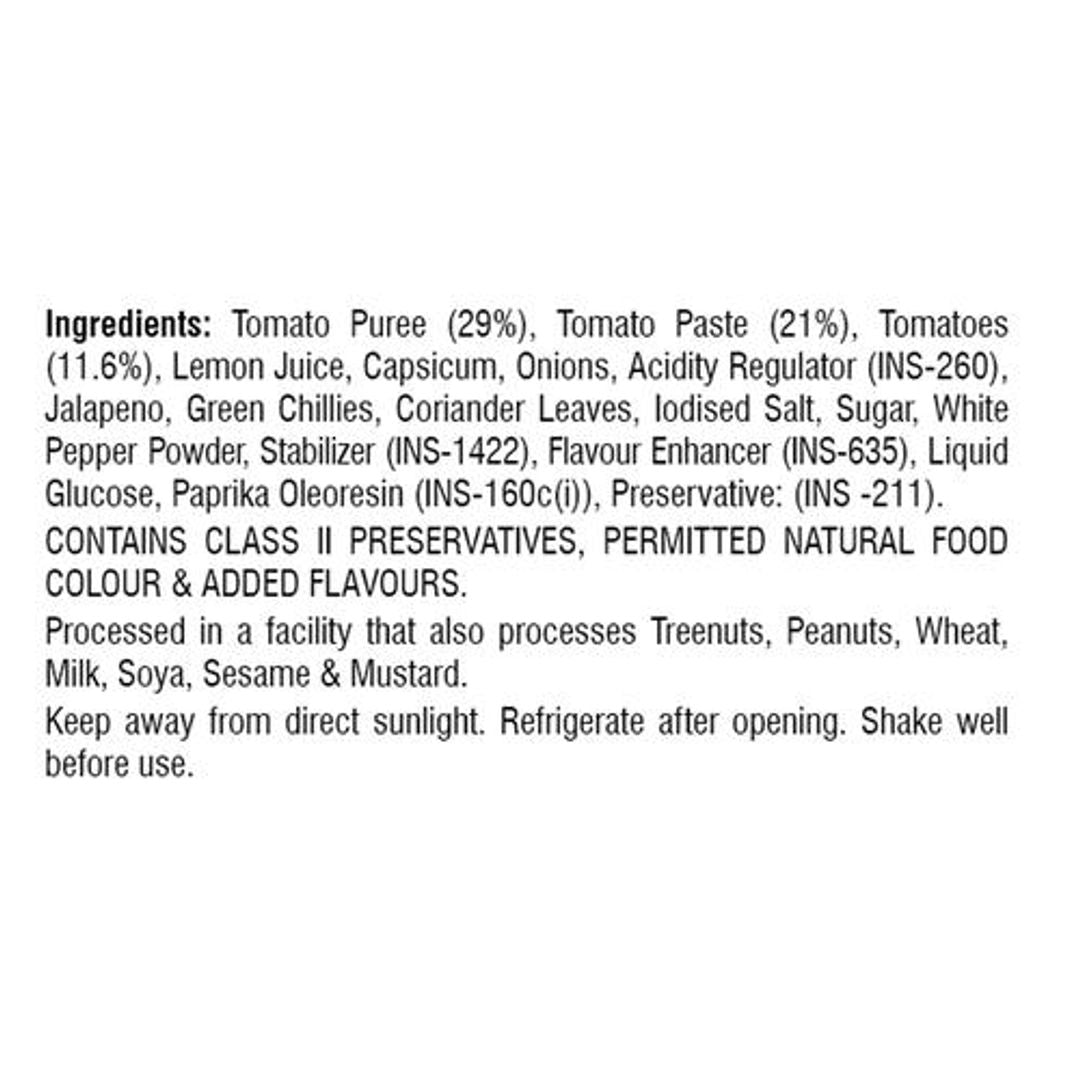 Tomato Puree, Tomato Paste, Tomatoes, Lemon Juice, Capsicum, Onions, Acidity Regulator, Jalapeno, Green Chillies, Coriander Leaves, Iodised Salt, Sugar, White Pepper Powder, Stabilizer, Flavour Enhancer, Liquid Glucose, Paprika Oleoresin & Preservatives.