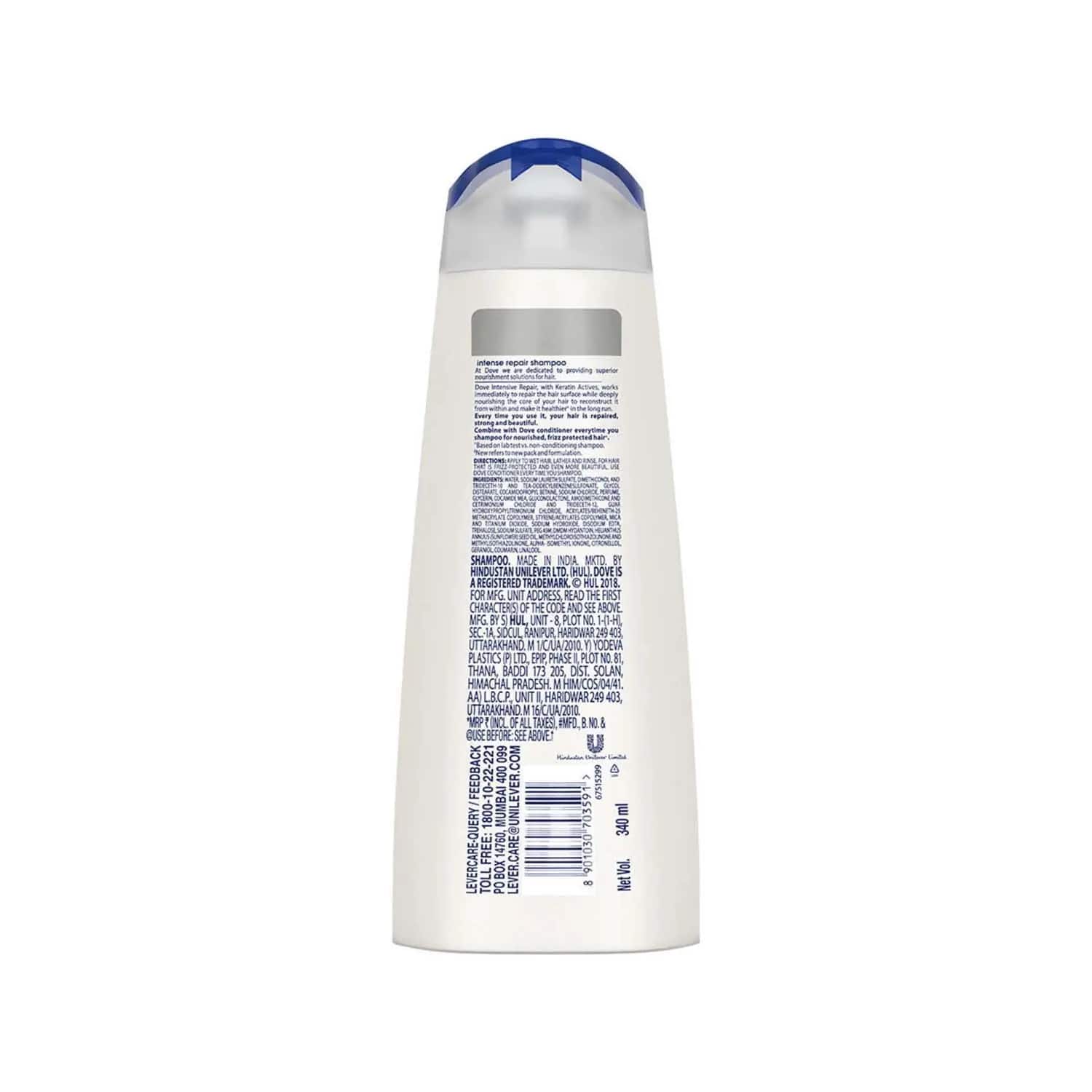 Give your hair the needed love and care with the Dove Intense Repair Hair Shampoo - (340ml). This nourishing shampoo is rich in keratin actives that help to repair hair damage with every use. It nourishes your hair from within and makes it healthy. This Dove shampoo is paraben-free and cruelty-free for safe and reliable use.Formulated with keratin actives to repair damaged hairEffectively nourishes and promotes healthy hair growthHelps in strengthening hairParaben-free and cruelty-free shampoo for safe useSunflower seed oil: Reduces dandruff and promotes healthy hair growthGlycerin: Moisturises and conditions the hairWater, Sodium Laureth Sulfate, Dimethiconol And Trideceth-10 And Tea-Dodecylbenzenesulfonate, Glycol Distearate, Cocamidopropyl Betaine, Sodium Chloride, Perfume, Glycerin, Cocamide Mea, Amodimethicone And Cetrimonium Chloride And Trideceth-12, Guar Hydroxypropyltrimonium Chloride, Acrylates/Beheneth-25 Methacrylate Copolymer, Styrene/Acrylates Copolymer, Mica And Titanium Dioxide, Sodium Hydroxide, Disodium Edta, Gluconolactone, Trehalose, Adipic Acid, Sodium Sulfate, Peg-45M, Dmdm Hydantoin, Helianthus Annuus (Sunflower) Seed Oil, Methylchloroisothiazolinone And Methylisothiazolinone, Alpha-Isomethyl Ionone, Citronellol, Geraniol, LinaloolTake a dollop of the shampoo and gently massage it on your wet scalp to create a lather. Then wash off this lather with lukewarm water for a clean and healthy scalp.Founded by the Lever brothers in 1957, Dove is a personal care brand that offers a wide range of facial and hair care products. The brand aims at redefining beauty standards and making beauty a source of confidence, not anxiety. With the launch of the Dove Self-Esteem Project in 2004, the brand continues to deliver self-esteem education to help young people realise their true beauty in being themselves. Dove has carefully curated products that are cruelty-free to ensure safe and reliable use for the millions of customers they cater to.Check out more Dove Shampoo options here, or browse through tokocart's full range of Shampoo from top global brands.You can also explore other products from the world of Dove here on tokocart.