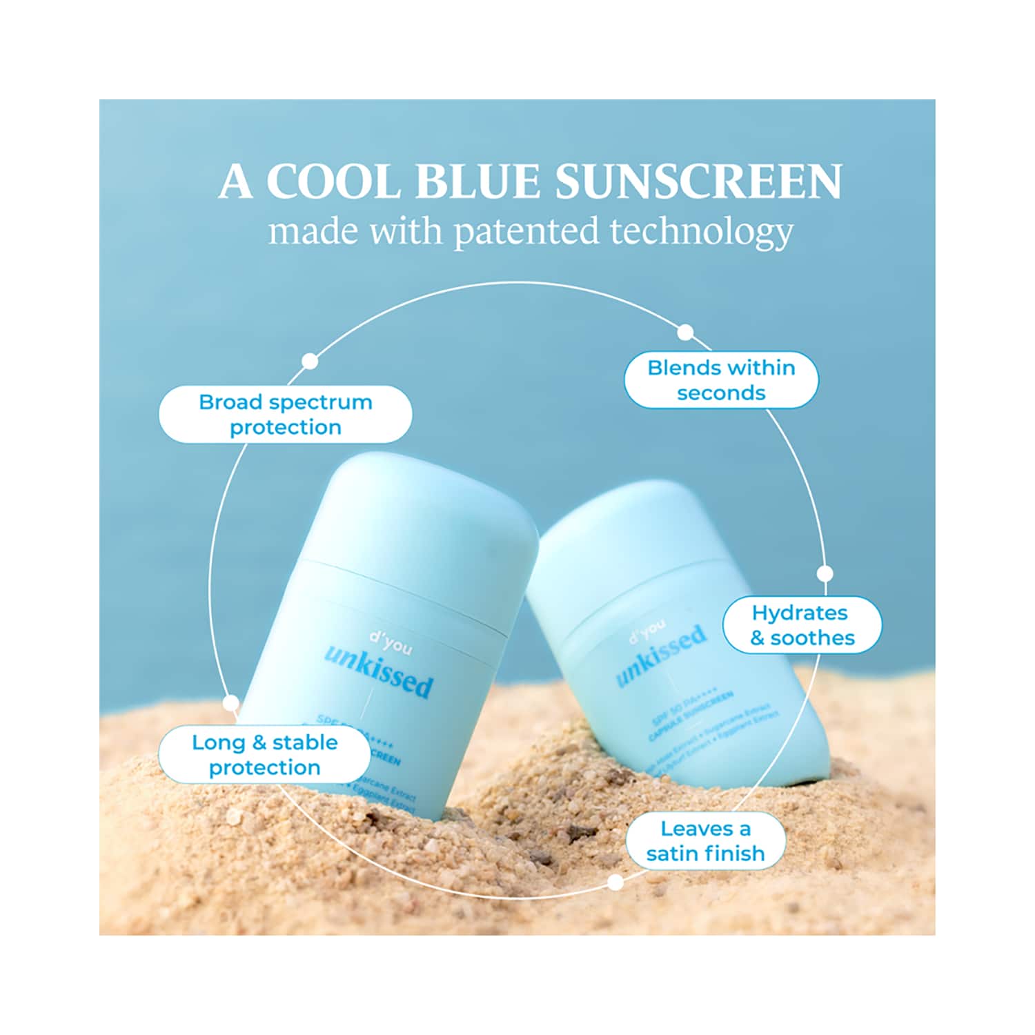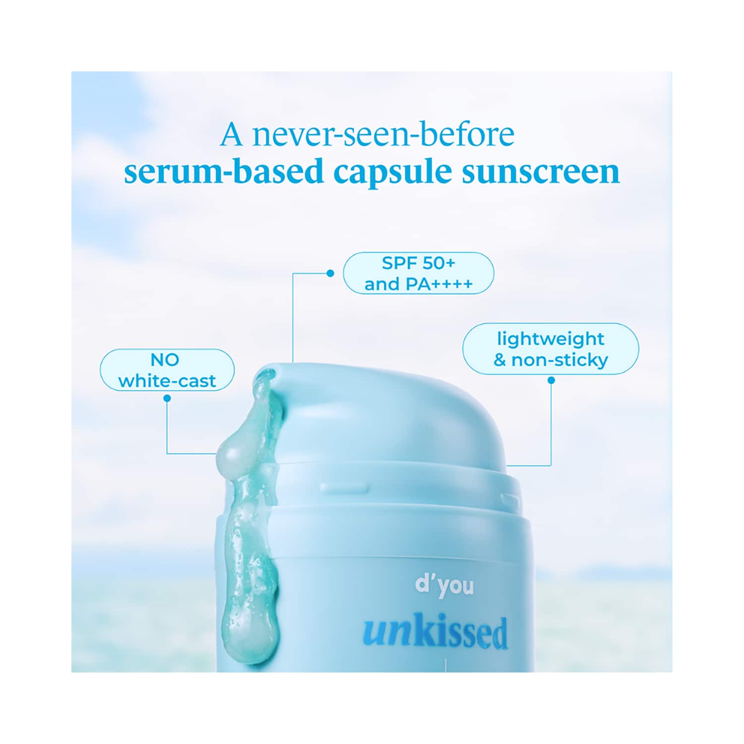 Meet your new defense hero: the d'you unkissed Serum Sunscreen With SPF 50 & PA++++ (50 ml). This innovative, blue sunscreen seamlessly blends into your skin in seconds, leaving no white cast behind. Using patented capsule technology, it suspends advanced sunscreen filters with SPF 50+ and PA++++ in a nourishing serum base infused with 14 soothing plant extracts. Ideal for those who have avoided traditional sunscreens, this groundbreaking formula delivers exceptional protection while providing a refreshing finish.