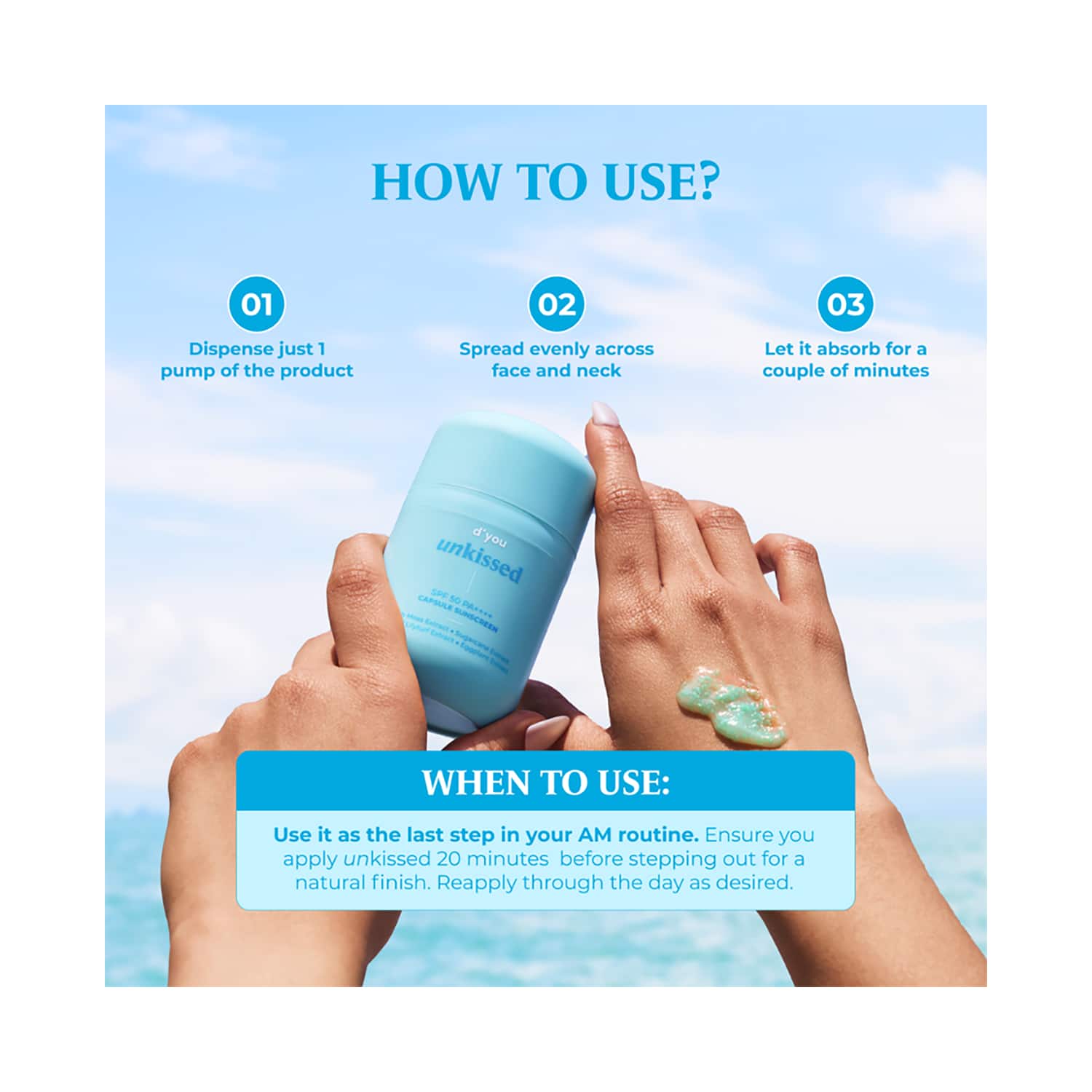 Take a sufficient amount of sunscreen and dot it all over the face. Spread and massage it into the skin until it is fully absorbed. Make sure to apply sunscreen at least 15 minutes before sun exposure and reapply throughout the day as required.